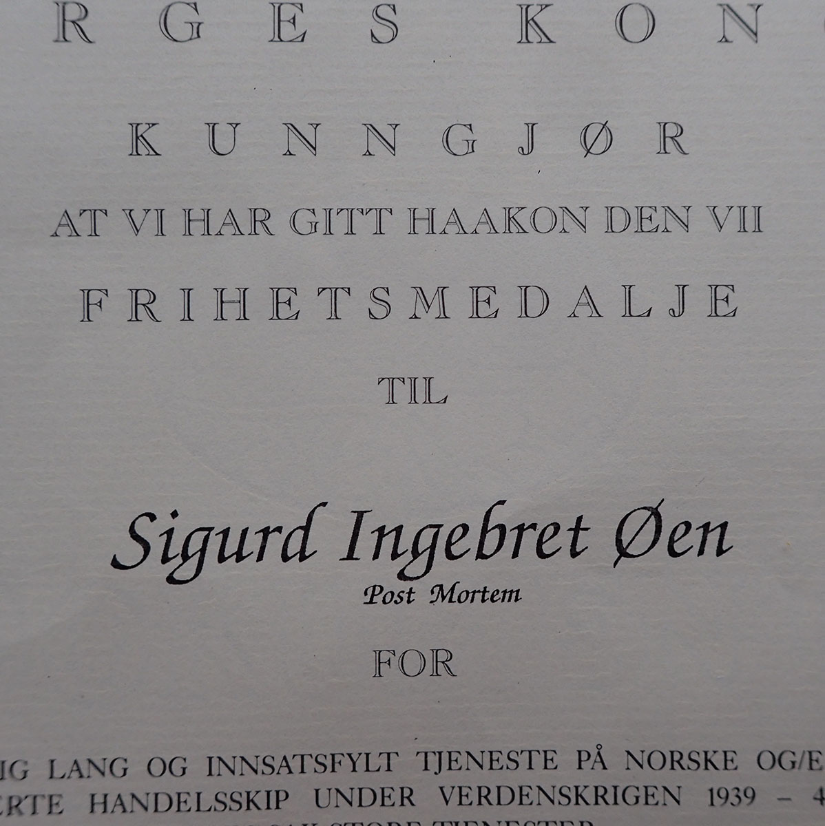 - Sigurd Ingebret Øen ble født den 19. mars 1902 i Kragerø og bodde senere i Fredrikstad. Under krigen mønstret han på 4 forskjellige fartøyer. Alle norske. Han gjorde tjeneste som 1 og 2 maskinist ombord.