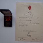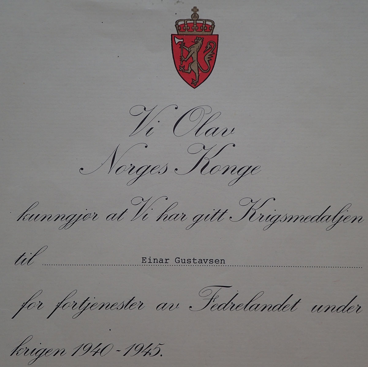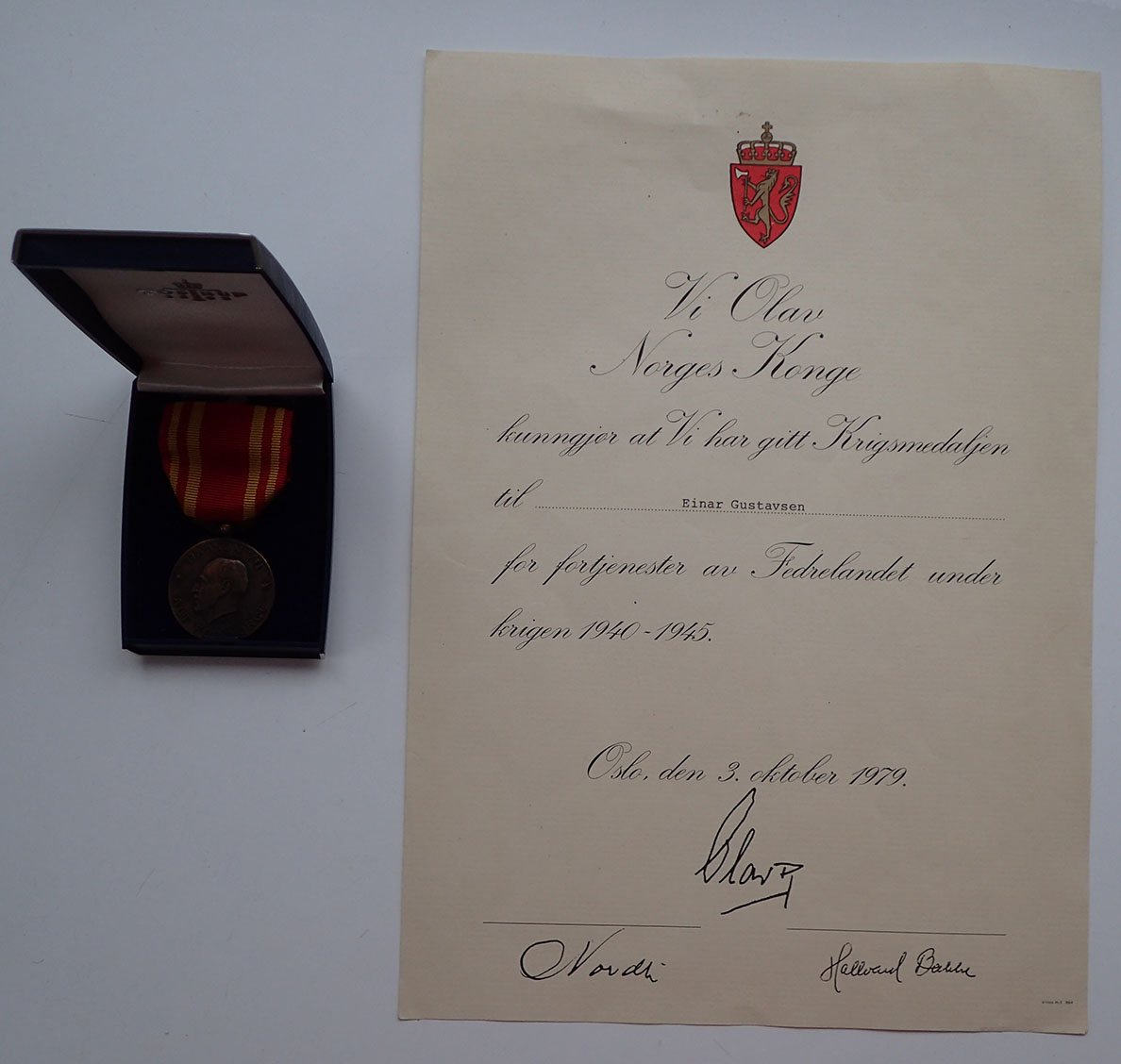 Diplomet til Krigsmedaljen er datert 3. oktober 1979. Med Olav Rex faximilie signatur. Diplomet måler 30 x 21 cm. og er i strøken stand.