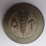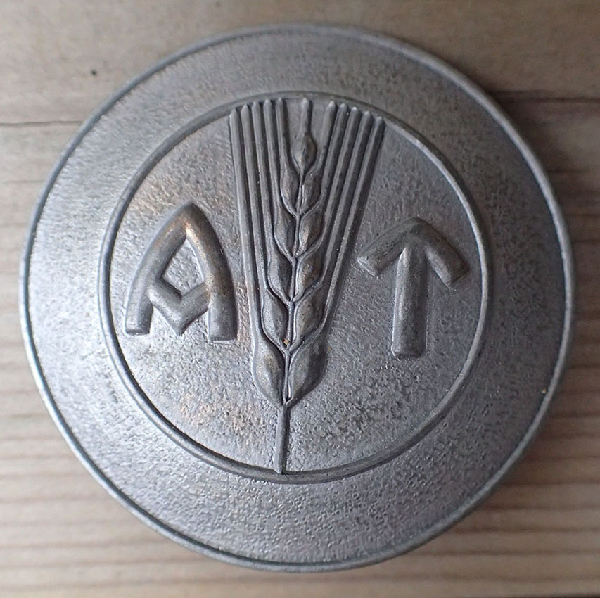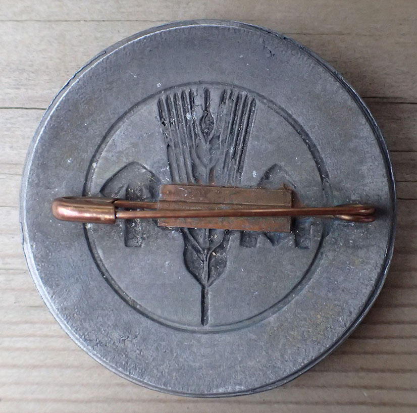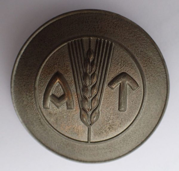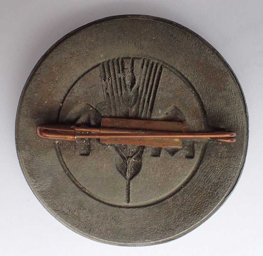 Kvinnelig AT Lagfører halsbrosje. I sink utførelse med svak rester av bronsefargen. Med fin gyllen nål påloddet.