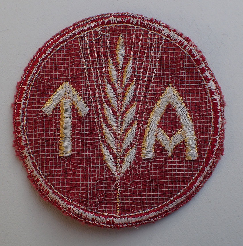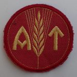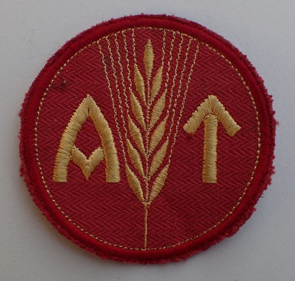 Kvinnelig AT menig brystmerke. Maskinbrodert med gul bomull på rød bunn. Bak med rutet underlag.