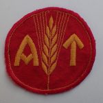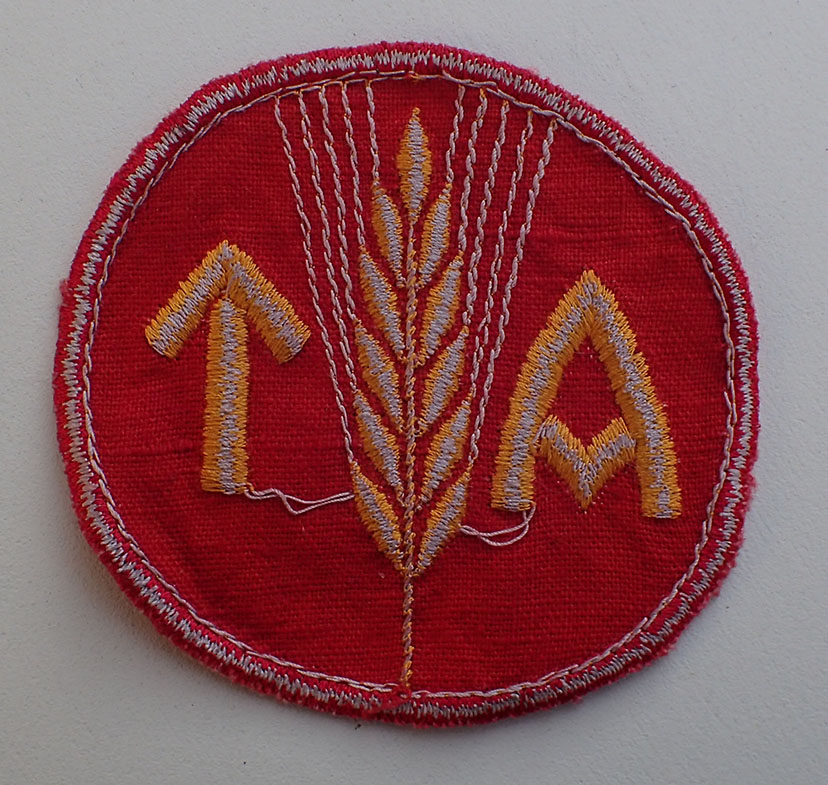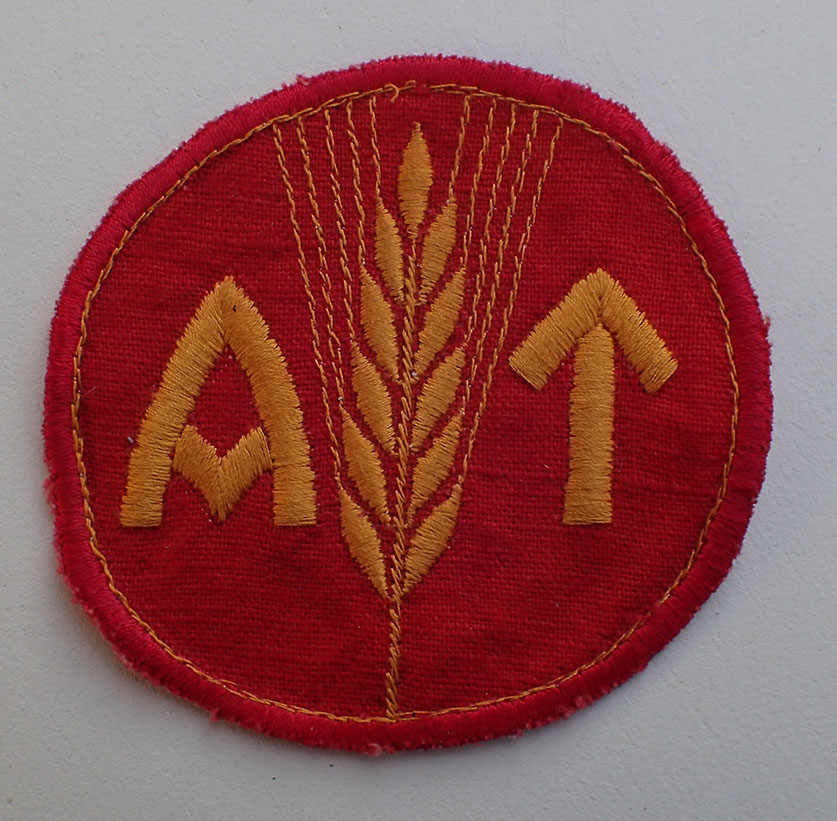 Kvinnelig AT menig brystmerke. Maskinbrodert med gul-orange bomull på rød bunn. Bak med gul-blå undertråder.