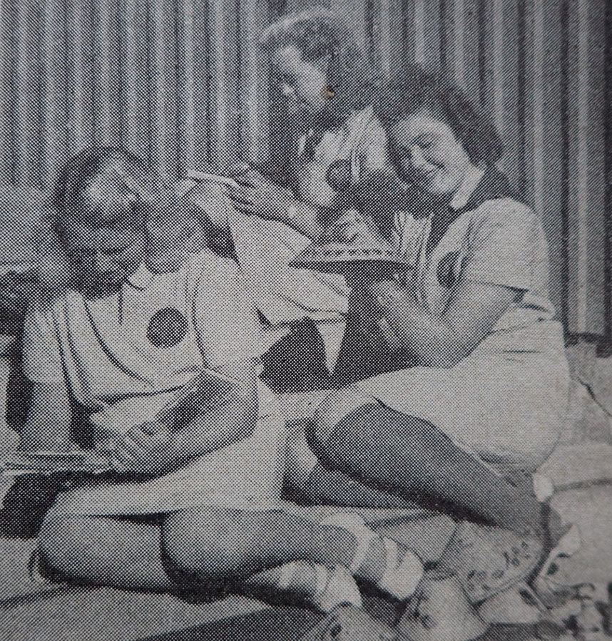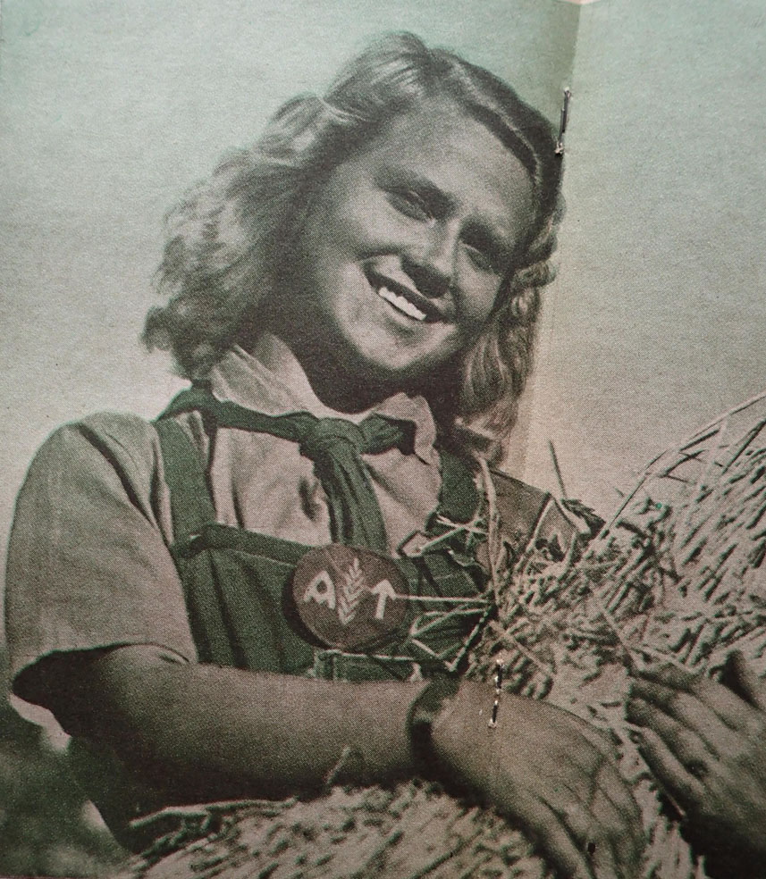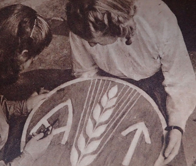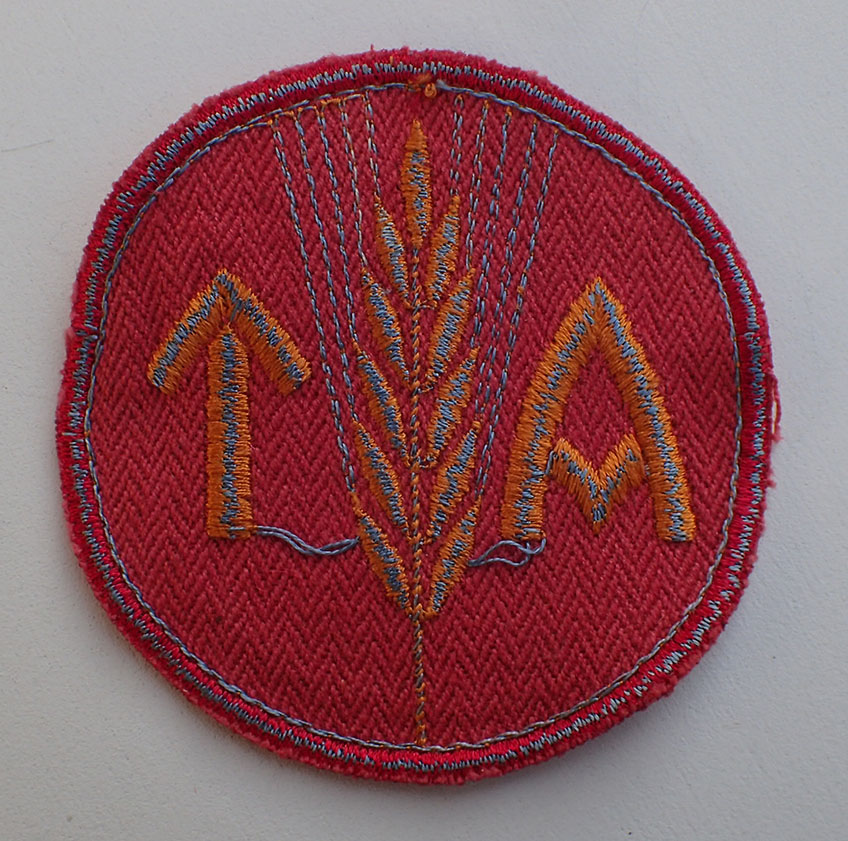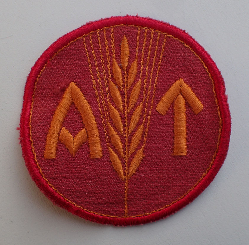 Kvinnelig AT menig brystmerke. Maskinbrodert med brun-orange bomull på rød bunn. Bak med gul-blå undertråder.