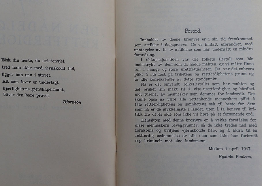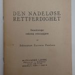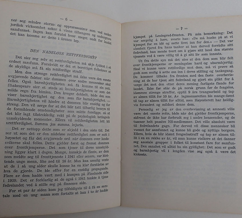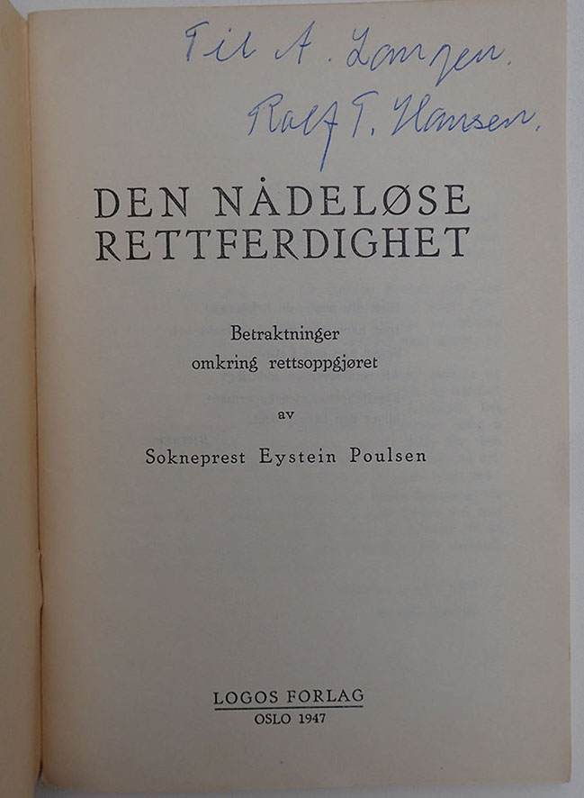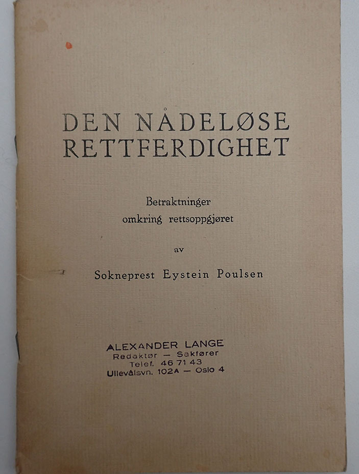 LANDSVIKOPPGJØRET HEFTE. DEN NÅDELØSE RETTFERDIGHET. Betraktninger omkring rettsoppgjøret. Stemplet på forsiden ALEXANDER LANGE. Redaktør – Sakfører. Oslo 4. Trykket hos LOGOS FORLAG i Oslo i 1947. Navnet på side 3. 34 sider med litt tykkere permer. Meget interessant lesning.