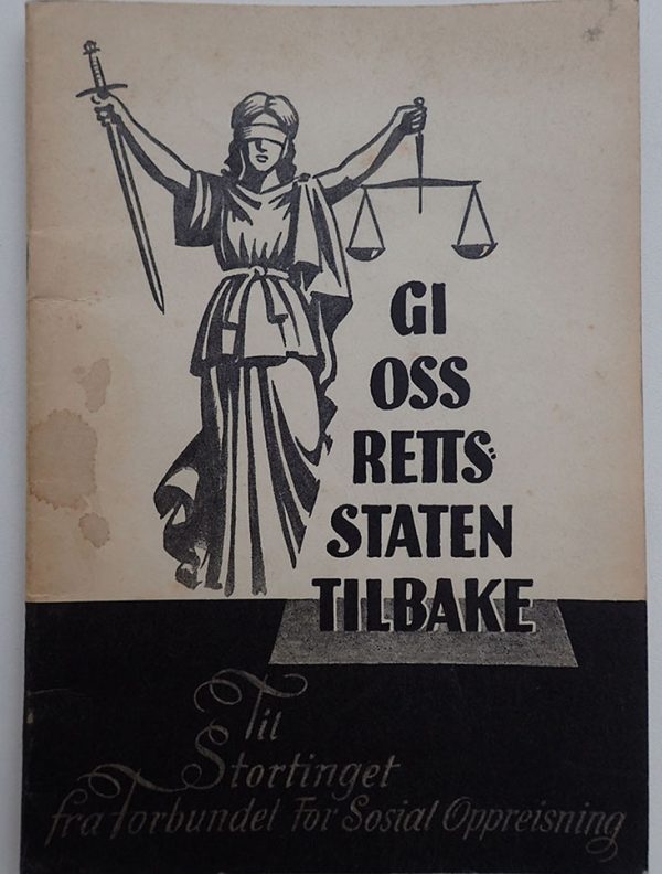 LANDSVIKOPPGJØRET HEFTE. GI OSS RETTSSTATEN TILBAKE. Til Stortinget fra Forbundet for Sosial Oppreisning. TRYKK: E K B – OSLO i 1950. 34 sider med litt tykkere permer. Meget interessant lesning.