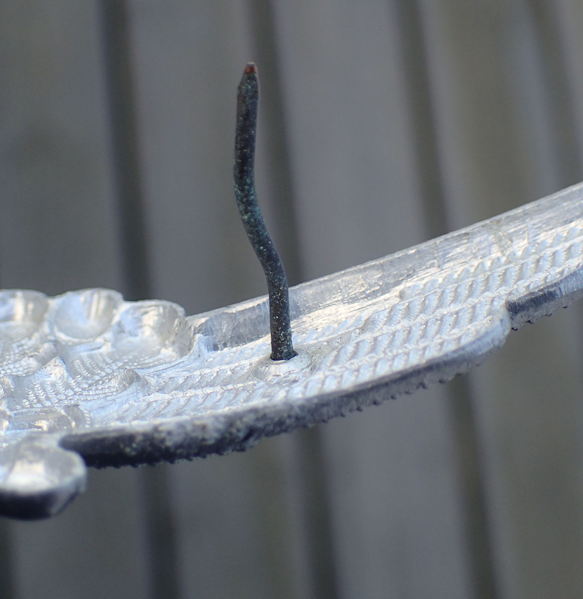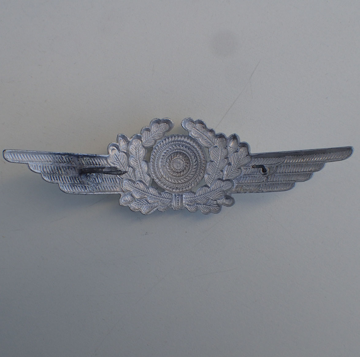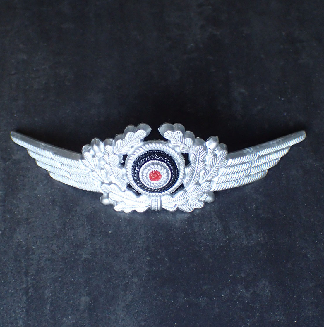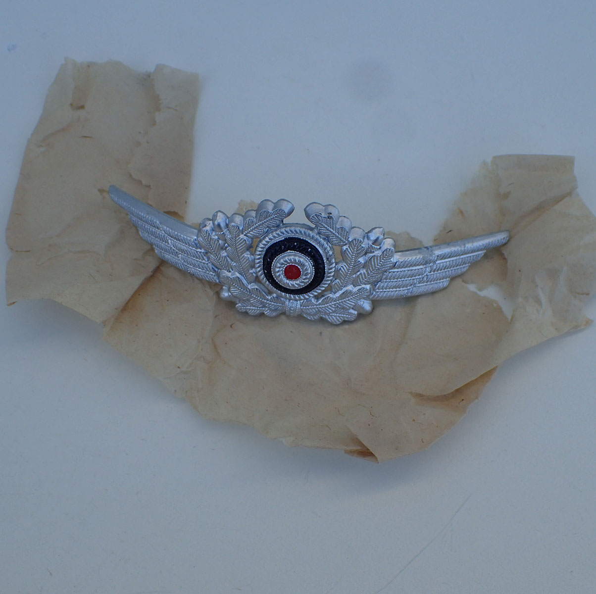 Luftwaffe luemerke til menig/underoffiser høylue. Buet utgave. Produsert i aluminium. Med malt senter. På baksiden doble feste-pins i aluminium på den ene siden og på den andre siden nål i messing festet til en rund base..