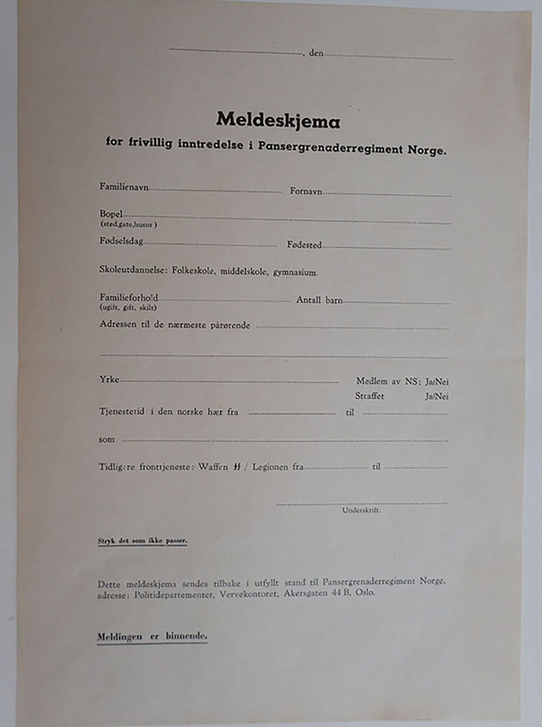 Meldeskjema for frivillig inntredelse i Pansergrenaderregiment Norge.