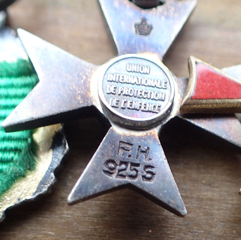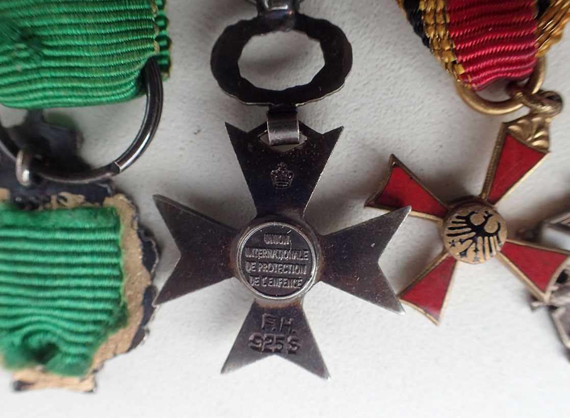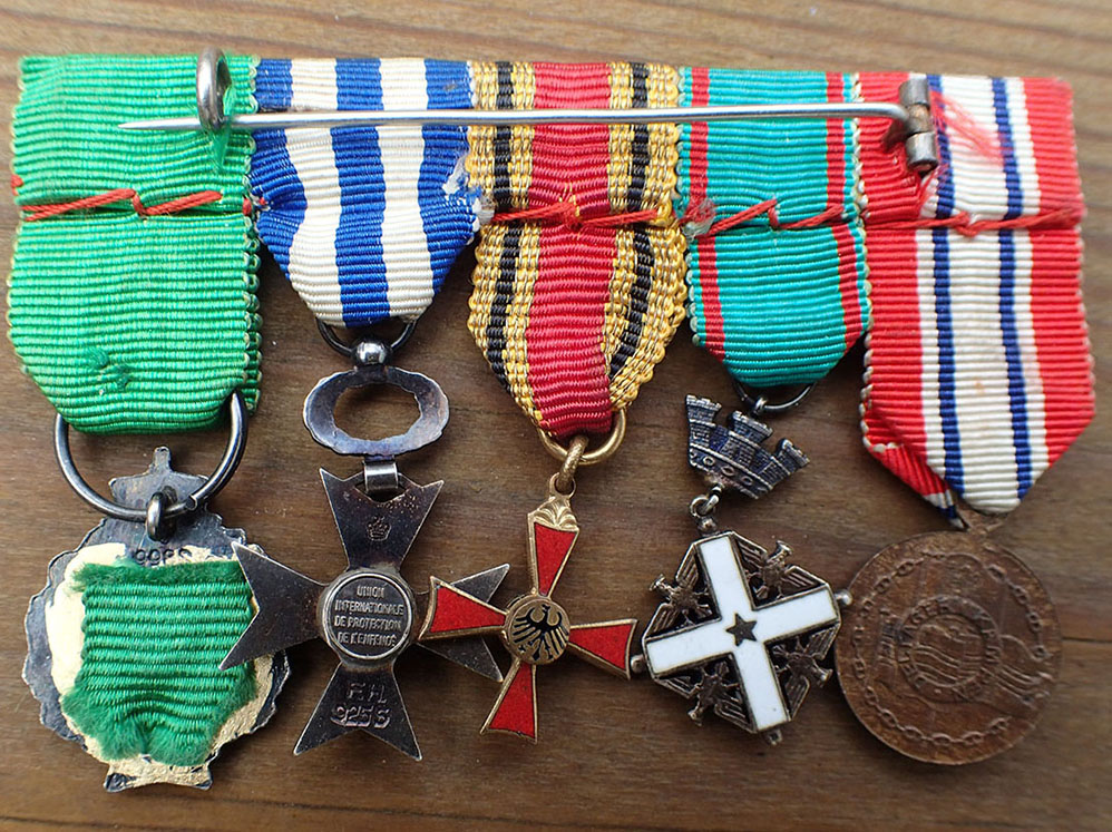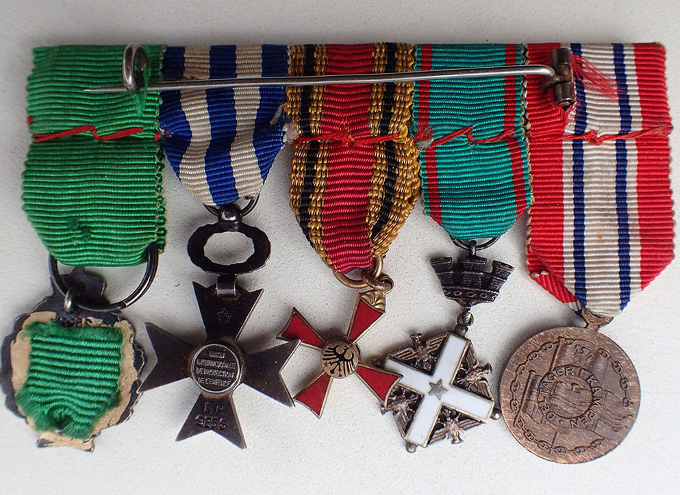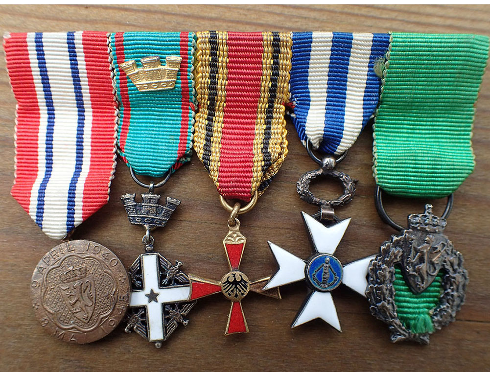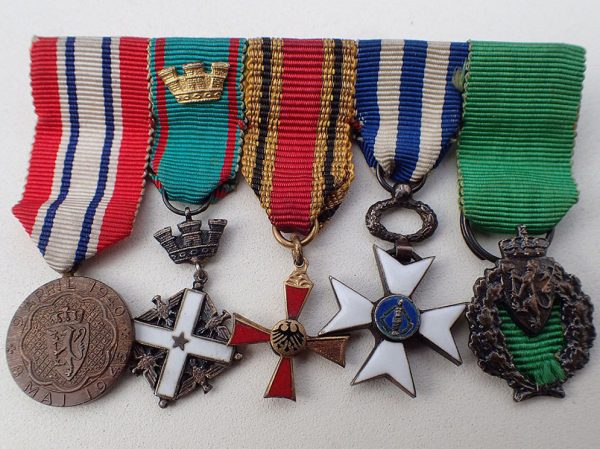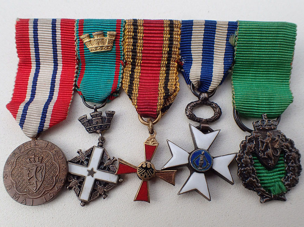 Miniatyrgruppe med 5 medaljer. Montert sammen med lang nål på baksiden.