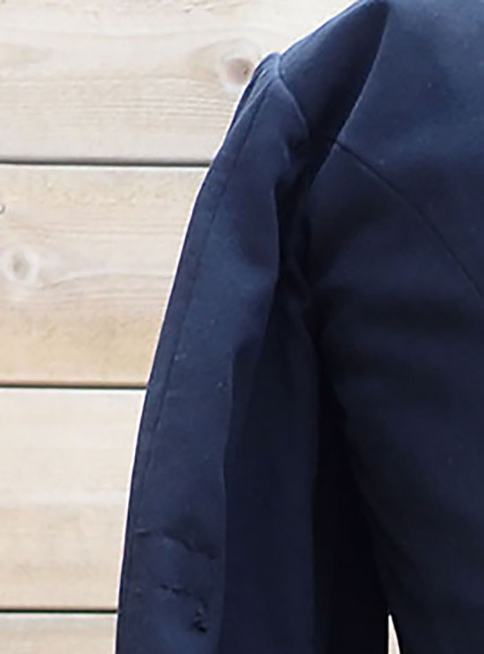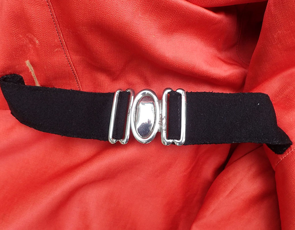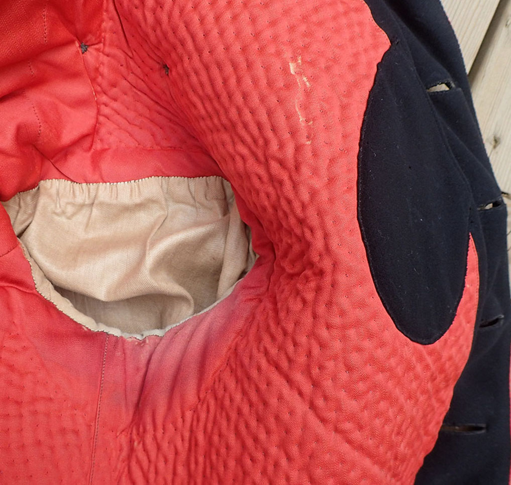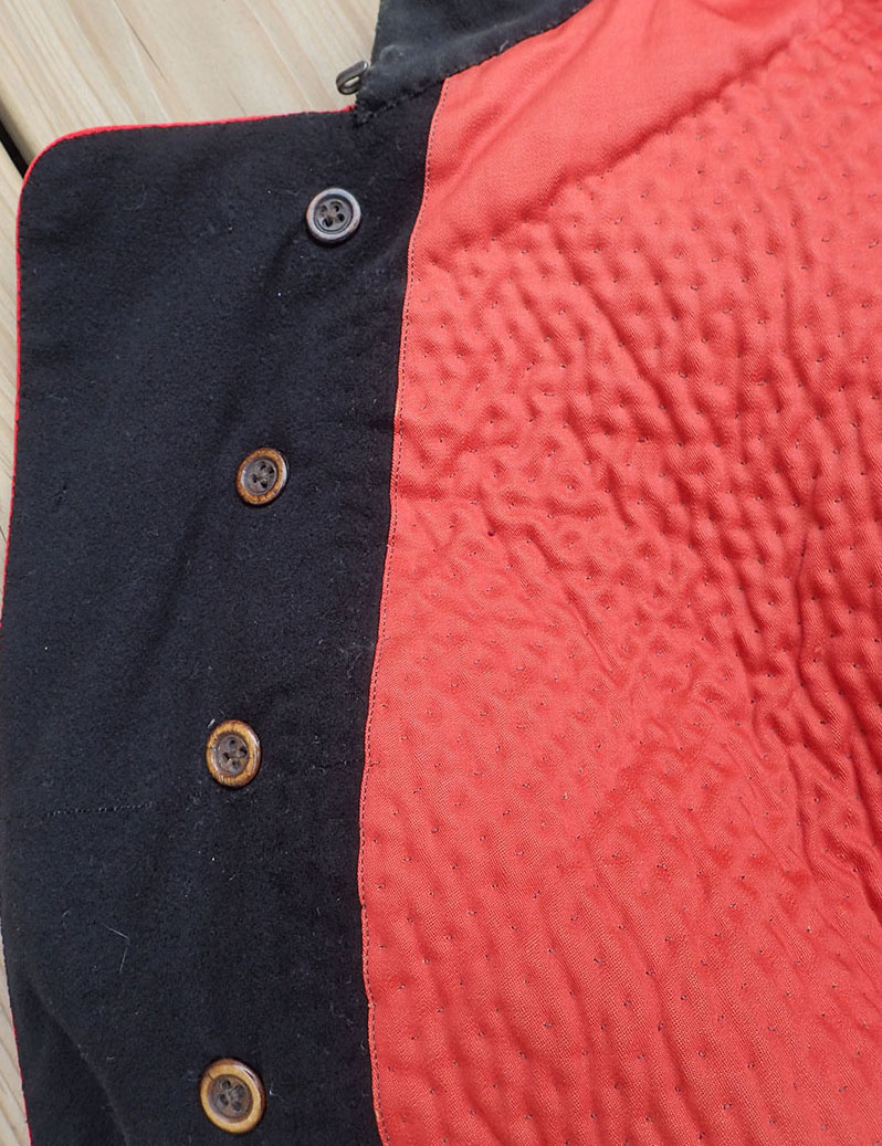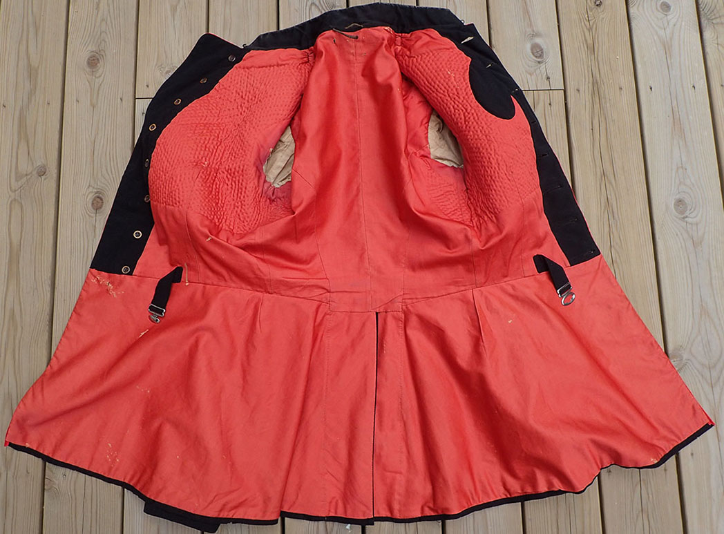 Innvendig med rød bomullsfòr og vatert på øvre del. I armene beige fòr. Med klokkelomme og magebelte.