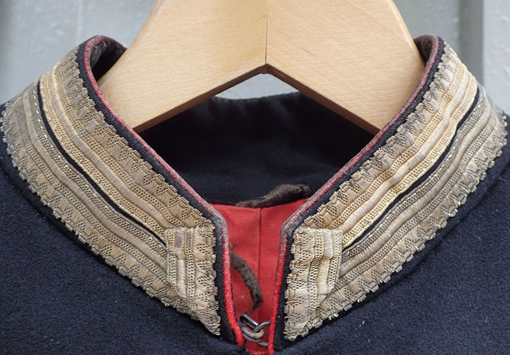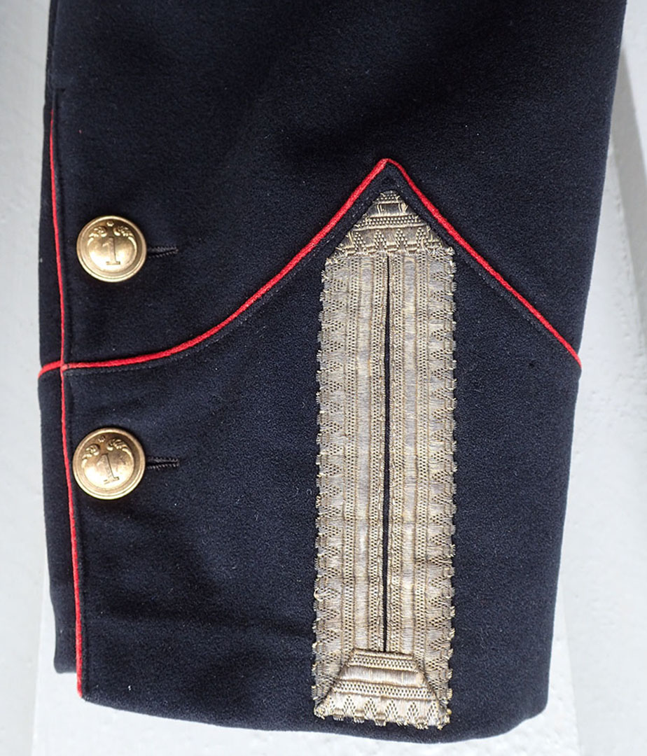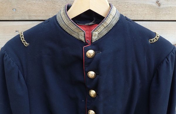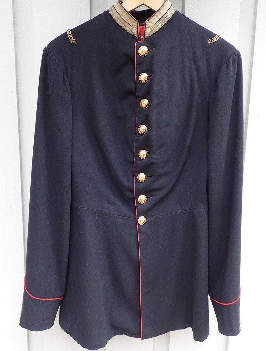 Se gammelt bilde av en identisk jakke med teksten bak på bildet «Portrett. Norsk musketeroffiser i uniform som er reglementert fra 1867-1877«. Eier: Digitalmuseet.