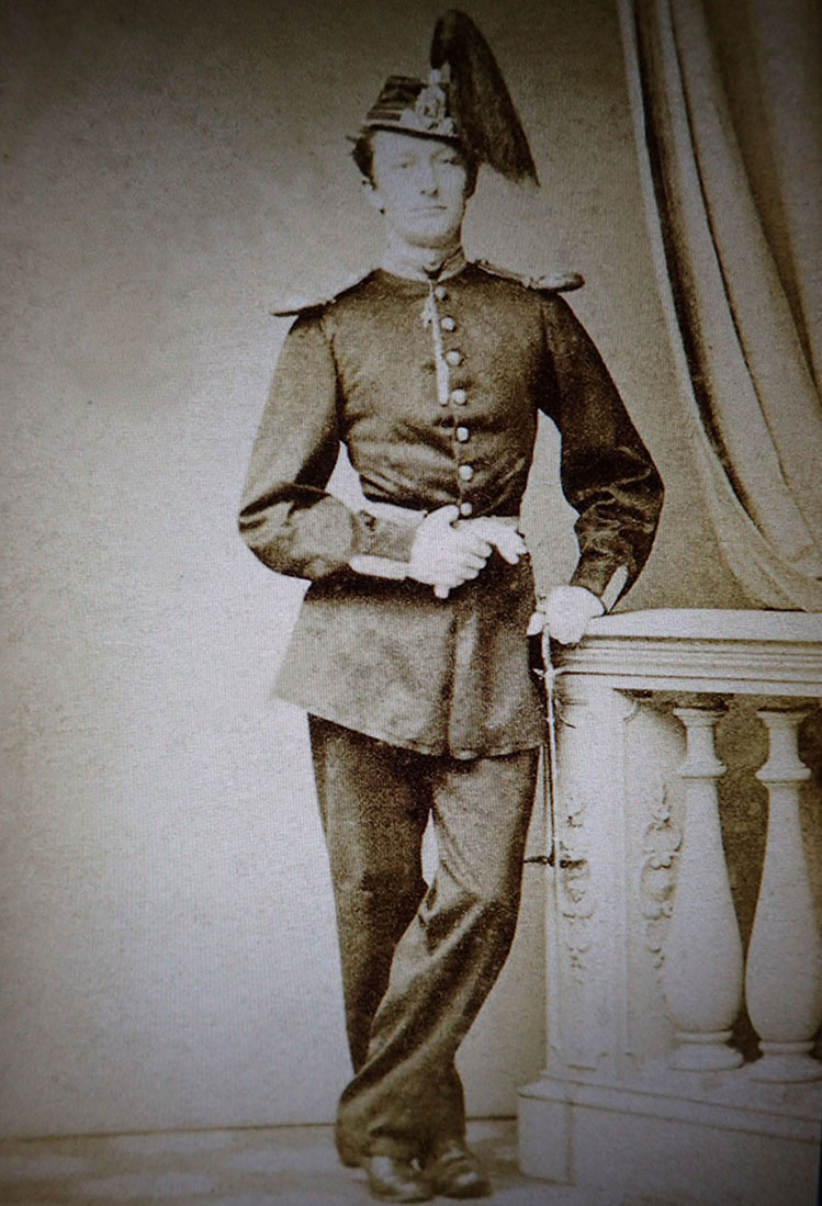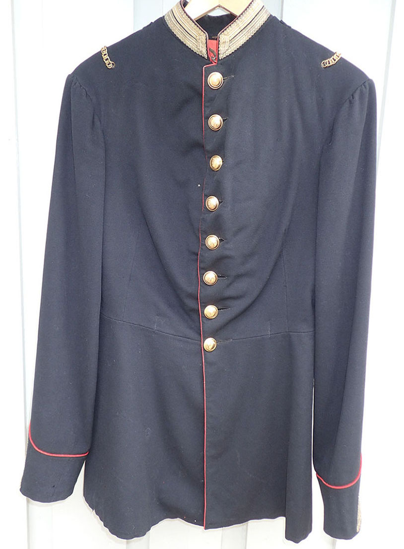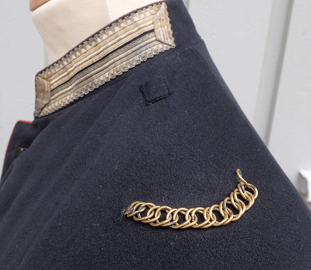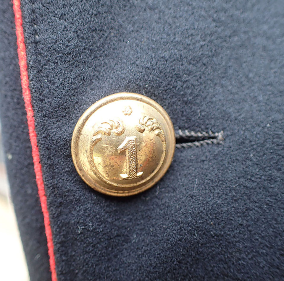 Se gammelt bilde av en identisk jakke med teksten bak på bildet «Portrett. Norsk musketeroffiser i uniform som er reglementert fra 1867-1877«. Eier: Digitalmuseet.