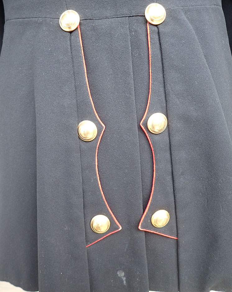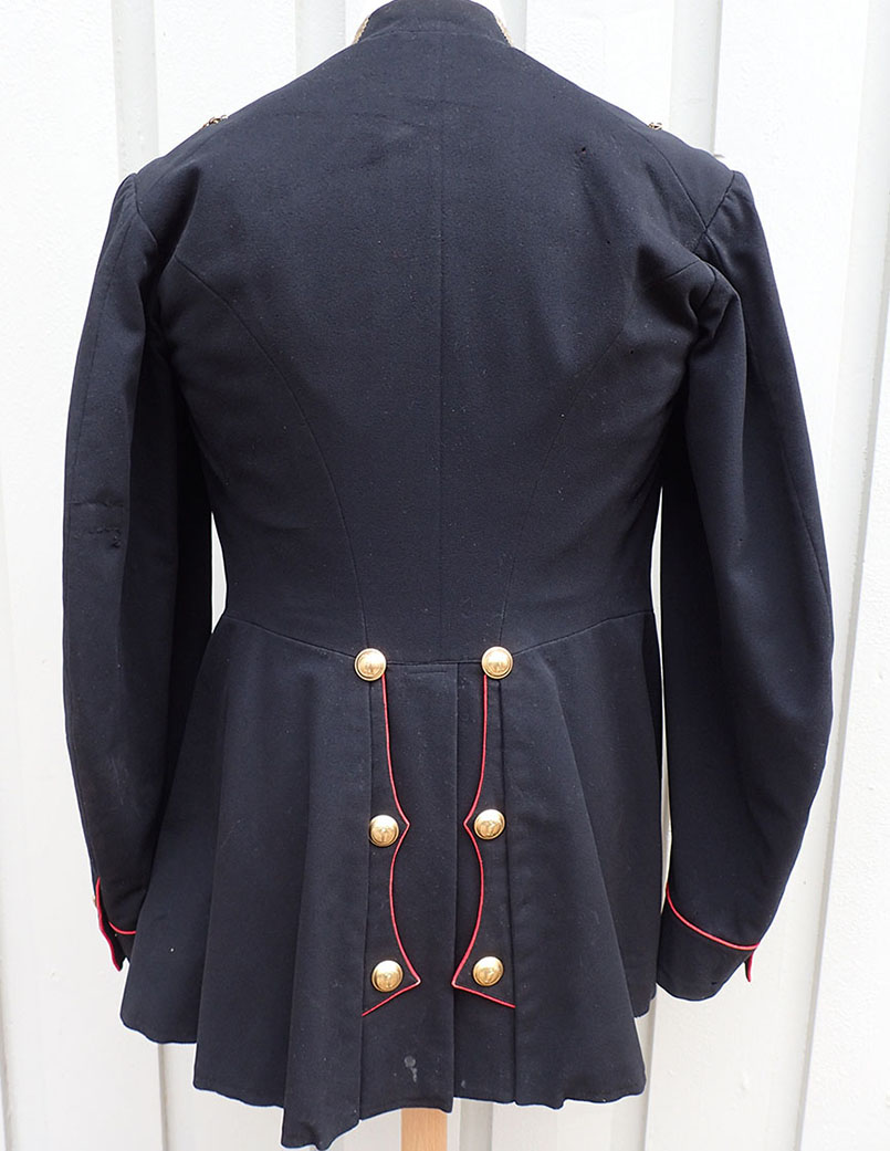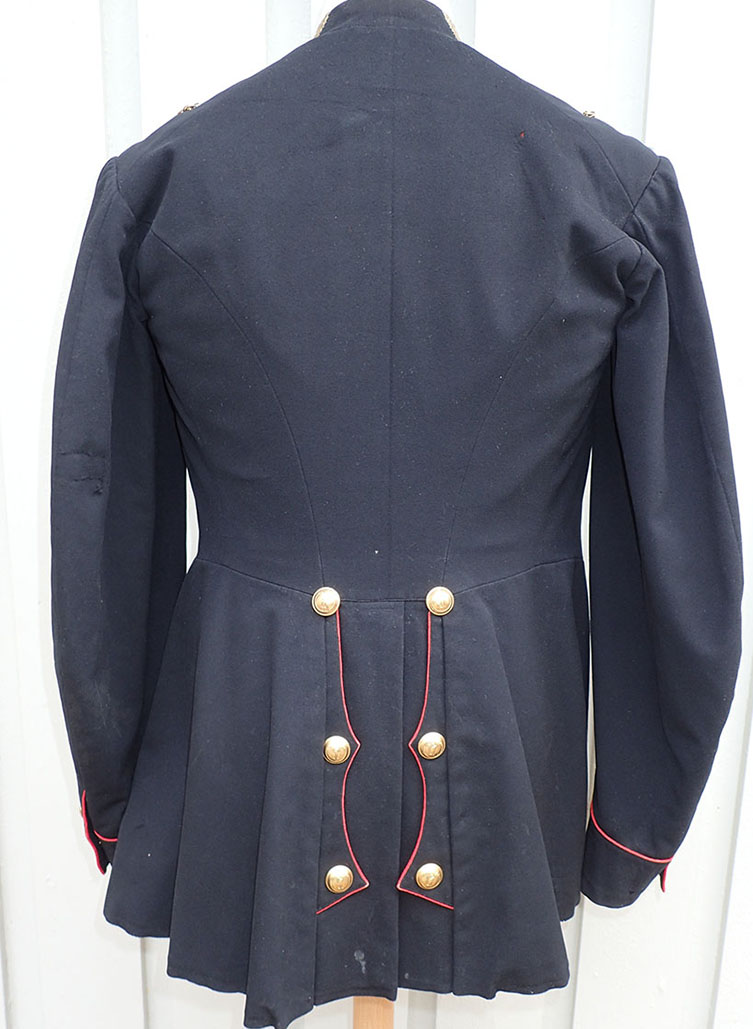 Modell 1867 Musketer offiser jakke. Sydd i glatt sort uniformsklede med rød paspoil rundt halsen og ned ved jakkeslaget foran, nede ved armslagene og bak. I halsen metallhempe. I fronten 8 store gullforgylte knapper og 6 bak. Nede ved hvert armslag 2 små knapper. Også påsydd gulltresser, for offiser. Alle knappene er merket med 1. Ingen av knappene har produsentens stempling bak. På kraven påsydd gulltresser for offiser. Oppå skuldrene hemper og kjetting påsydd, for å feste epåletter.