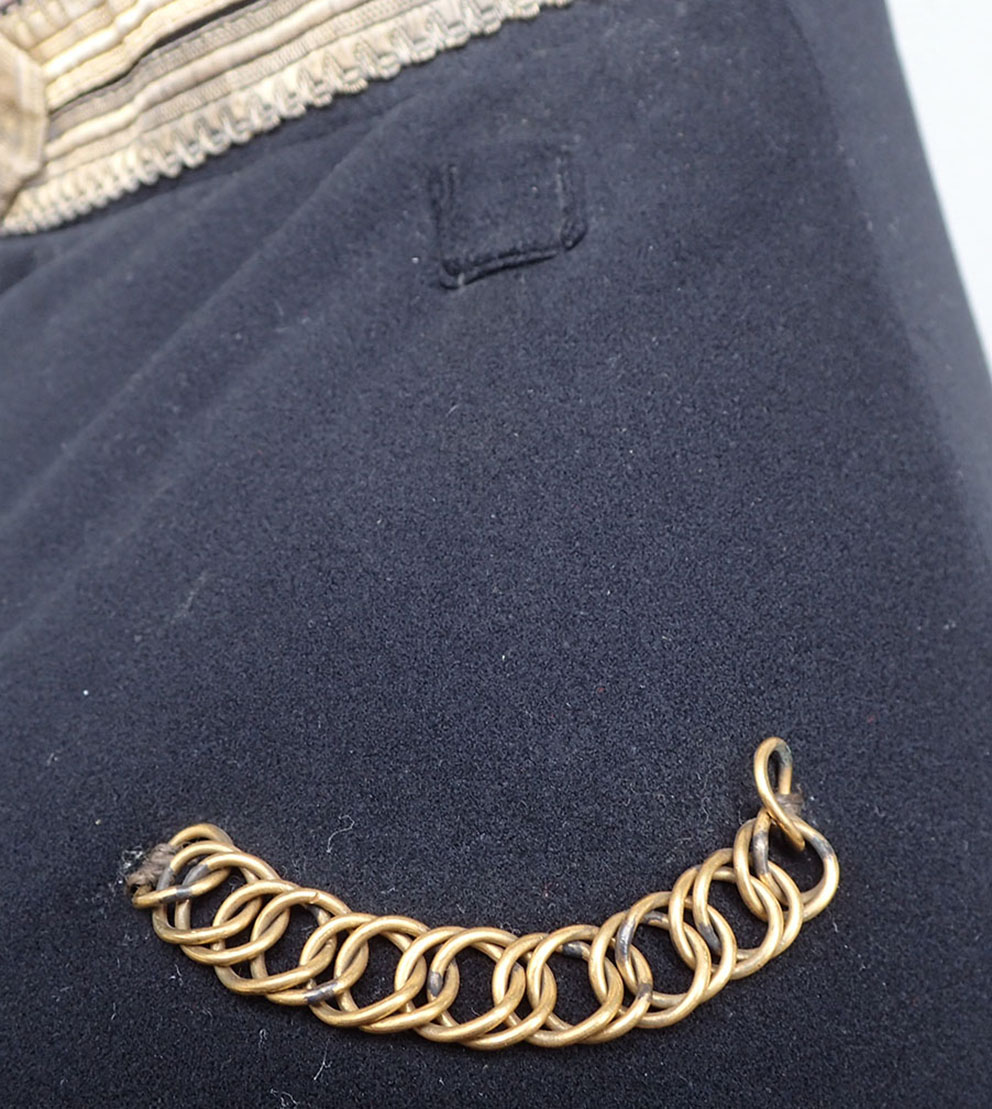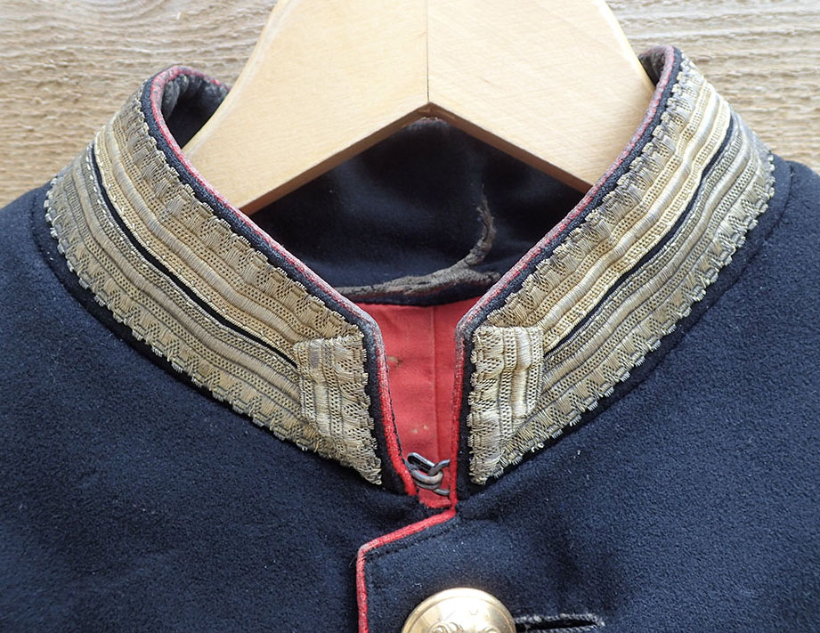 Uniformsjakken har noen bittesmå møllhull her og der. Den største under den ene armen men synes ikke. En liten gammel rep. bak på den ene armen ellers er jakken i veldig god stand for å være over 150 år gammel.