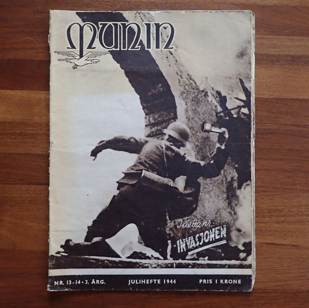 MUNIN. JULI 1944. NS billedmagasin i stort format – 35 x 25,5 cm. Masse fine bilder og artikler. På midtsidene bilder over falne frontkjempere: De falt i kampen for Norge.