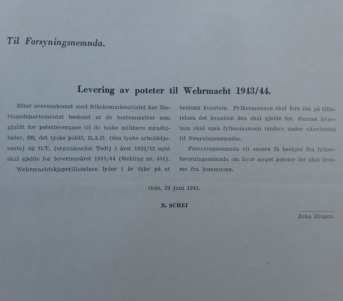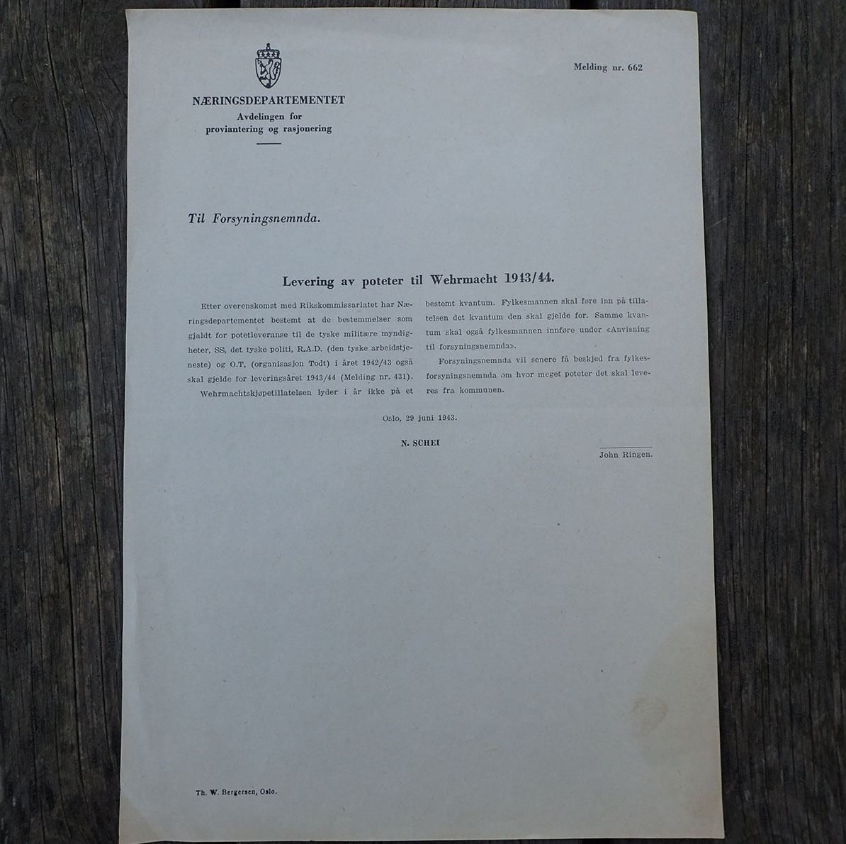 NÆRINGSDEPARTEMENTET. Avdelingen for proviantering og rasjonering. Levering av poteter til Wehrmacht 1943/44. I A4 format. Datert Oslo, 29. juni 1943. Ett interessant innehold. Brevet er i meget pen stand.