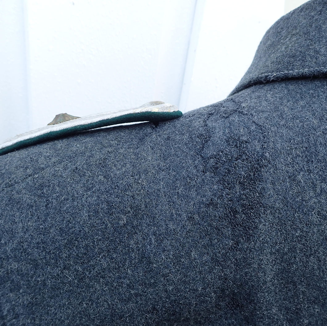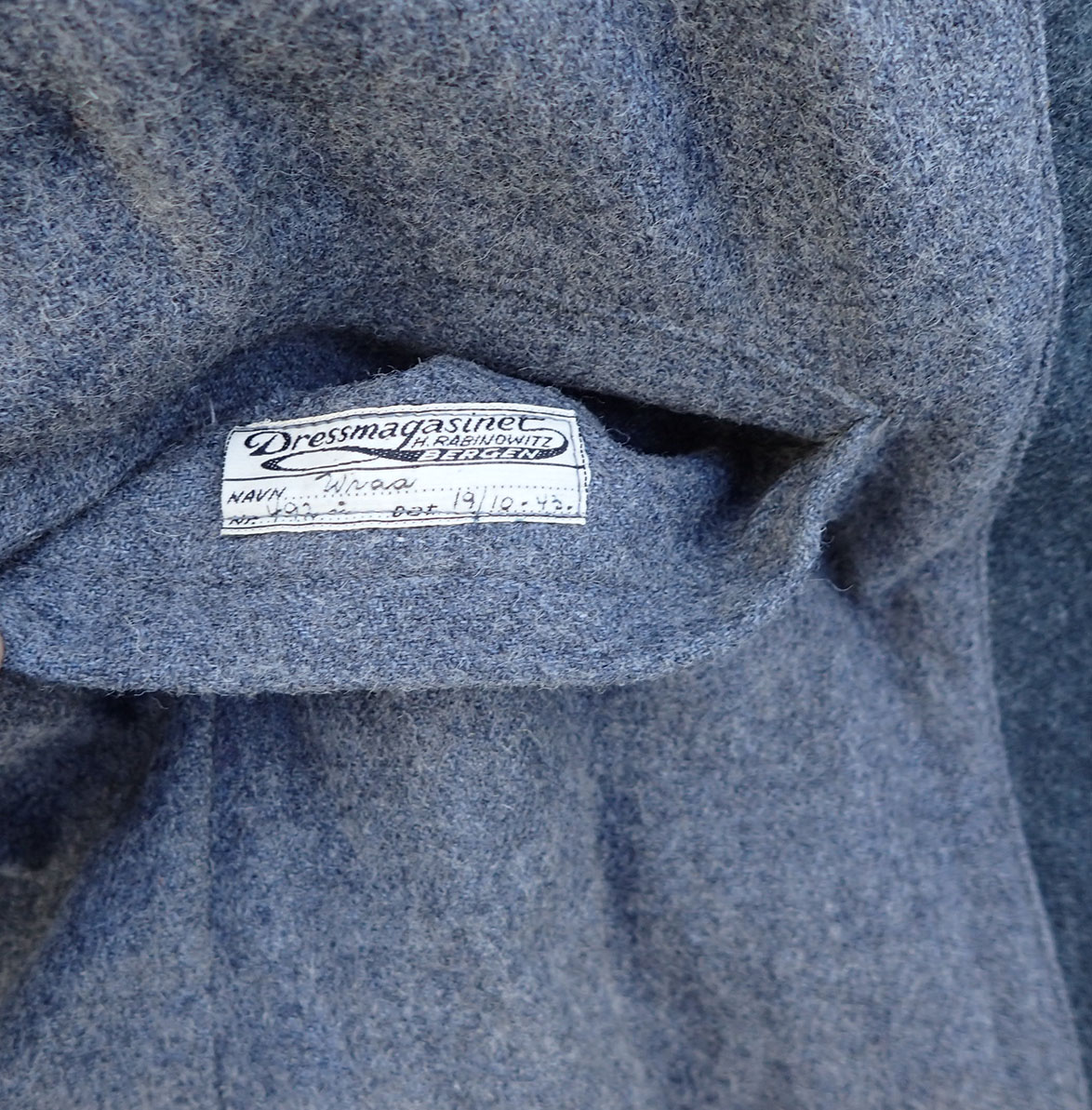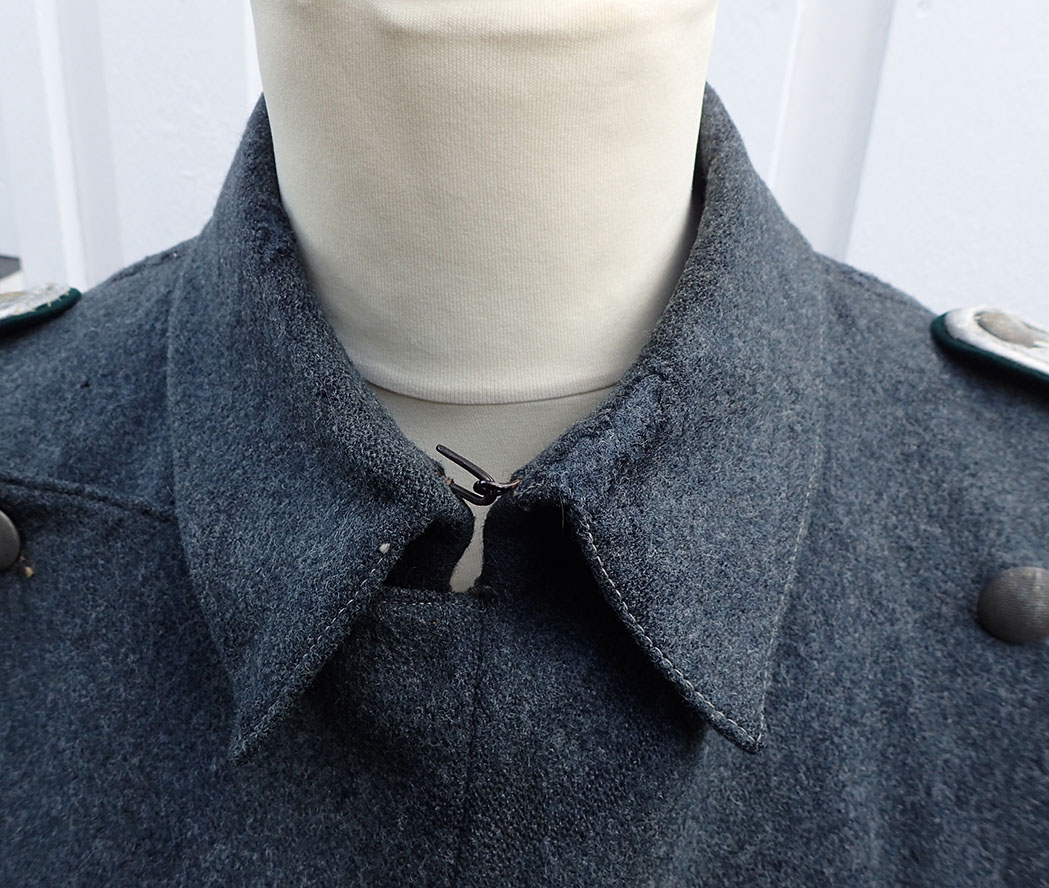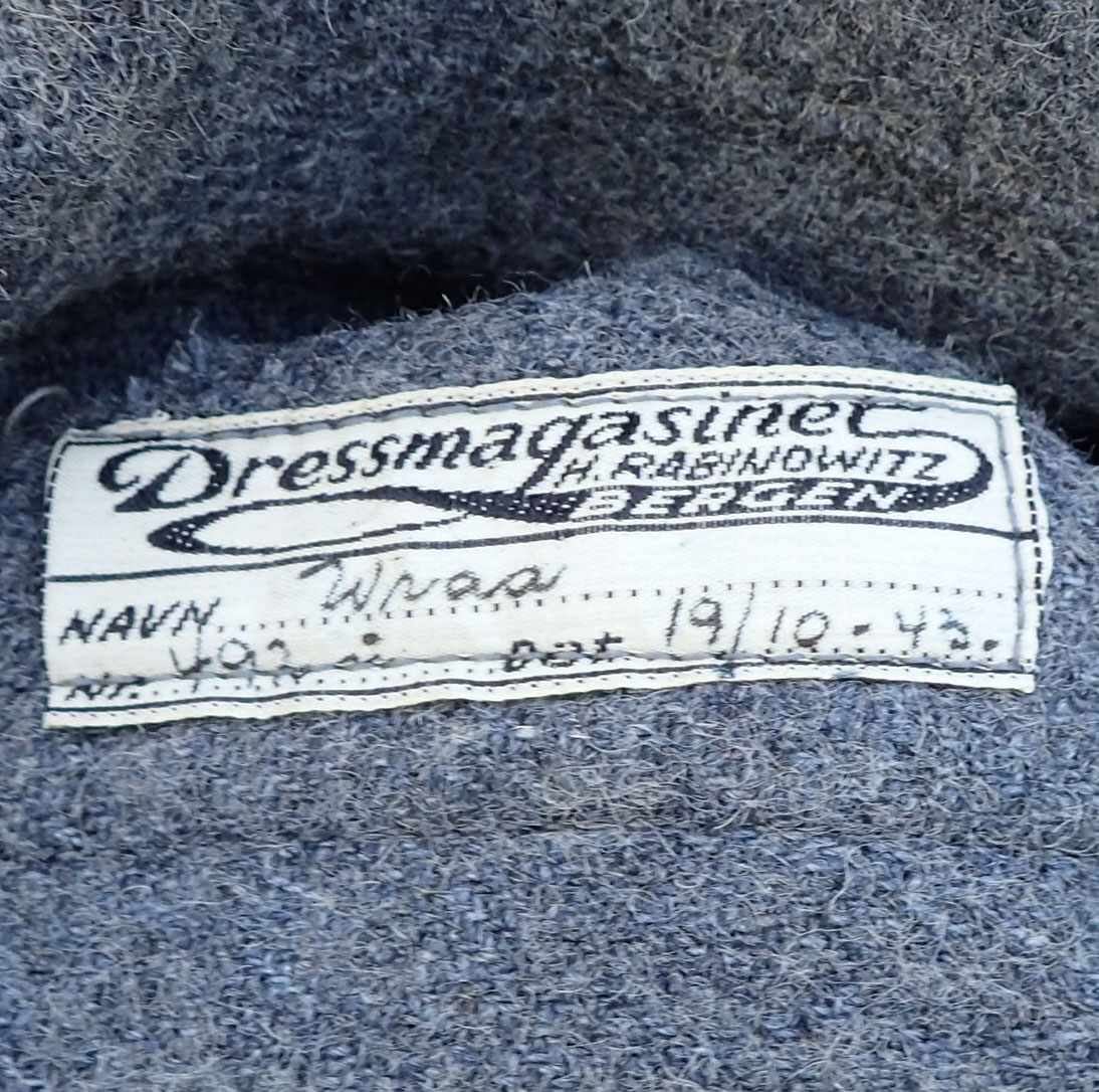 Nasjonal Samling Politi Løytnant 1 frakk. Sydd i grå uniformsstoff. Typisk NS politi snitt med skrå knepping. Knappene er NS politi original påsydde og bak stemplet med produsenten CORNELIUSSEN & OLSEN. OSLO. Bak med stramme-hempe med 2 knapper påsydd. I halsen to sortlakkerte metallhemper påsydd. Med originalt nedsydde skulderklaffer for Politiløytnant 1. Innvendig med grå ullfòr. Med en innerlomme og på innsiden av innerlommen skredder-etikett sydd hos: Dressmagasinet H. RABINOWITZ. BERGEN. Så fylt inn med sort blekk NAVN Wraa. Nr. 492. Dat. 19/10-43. I armene grønn glatt bomullsfòr. Nede i folden bak med 4 små metall-knapper.