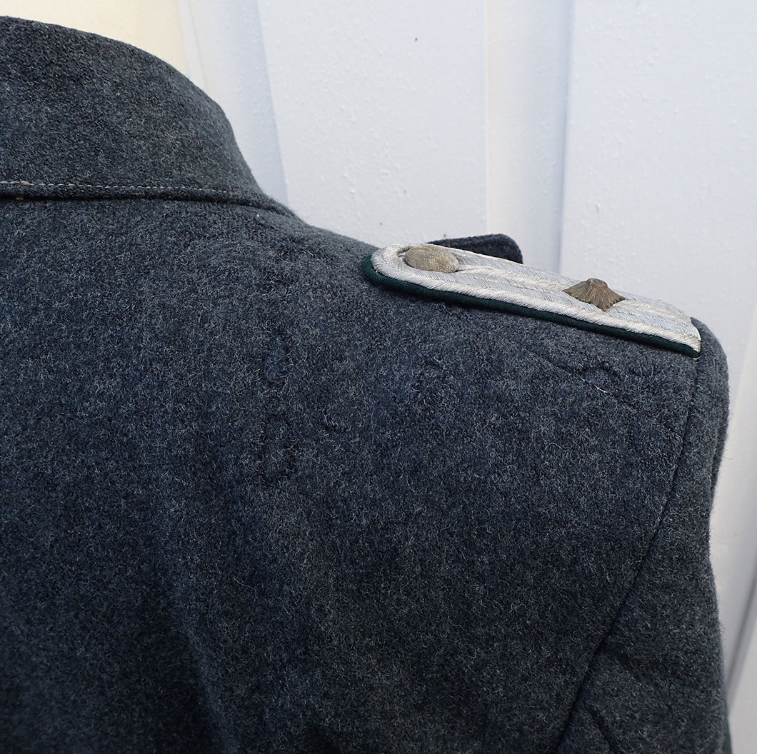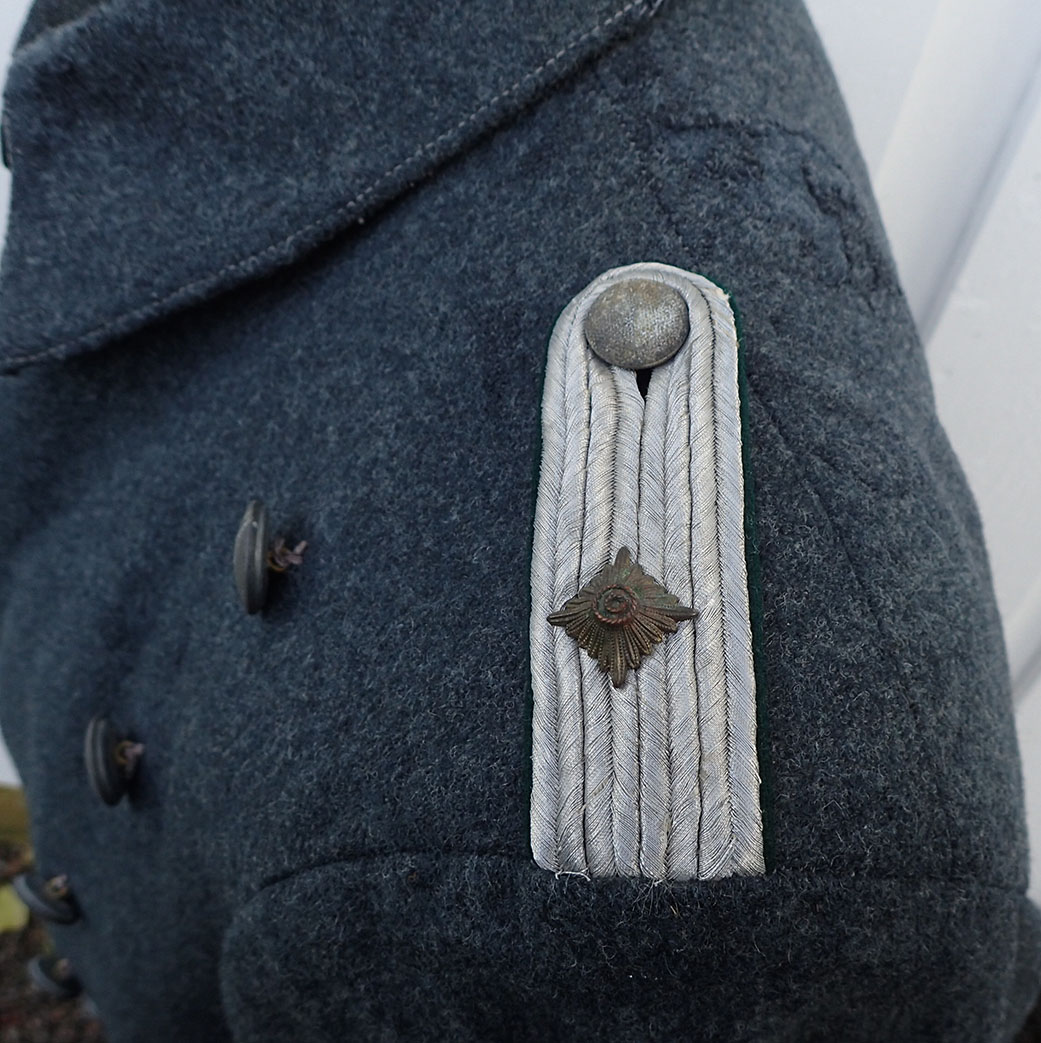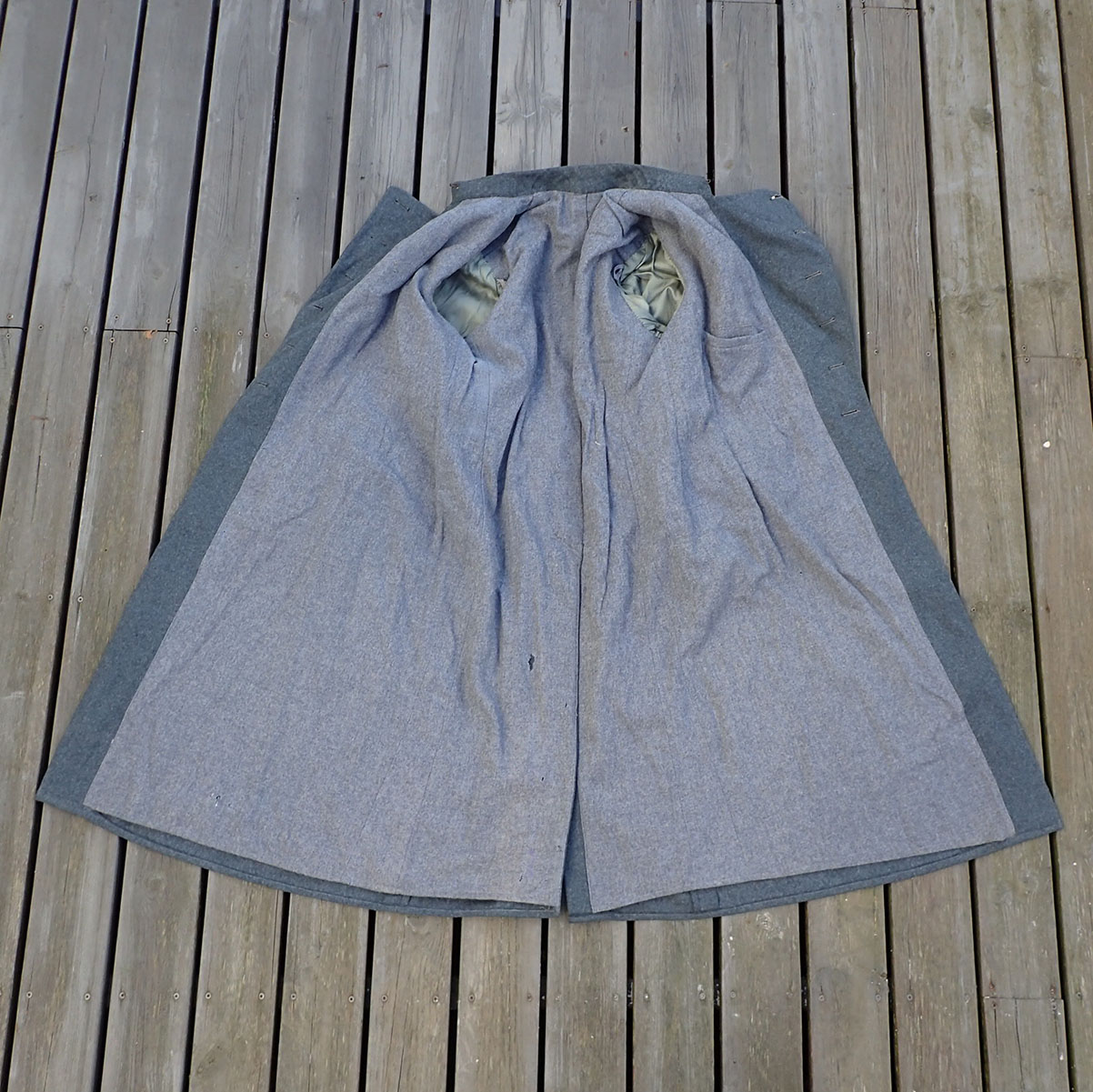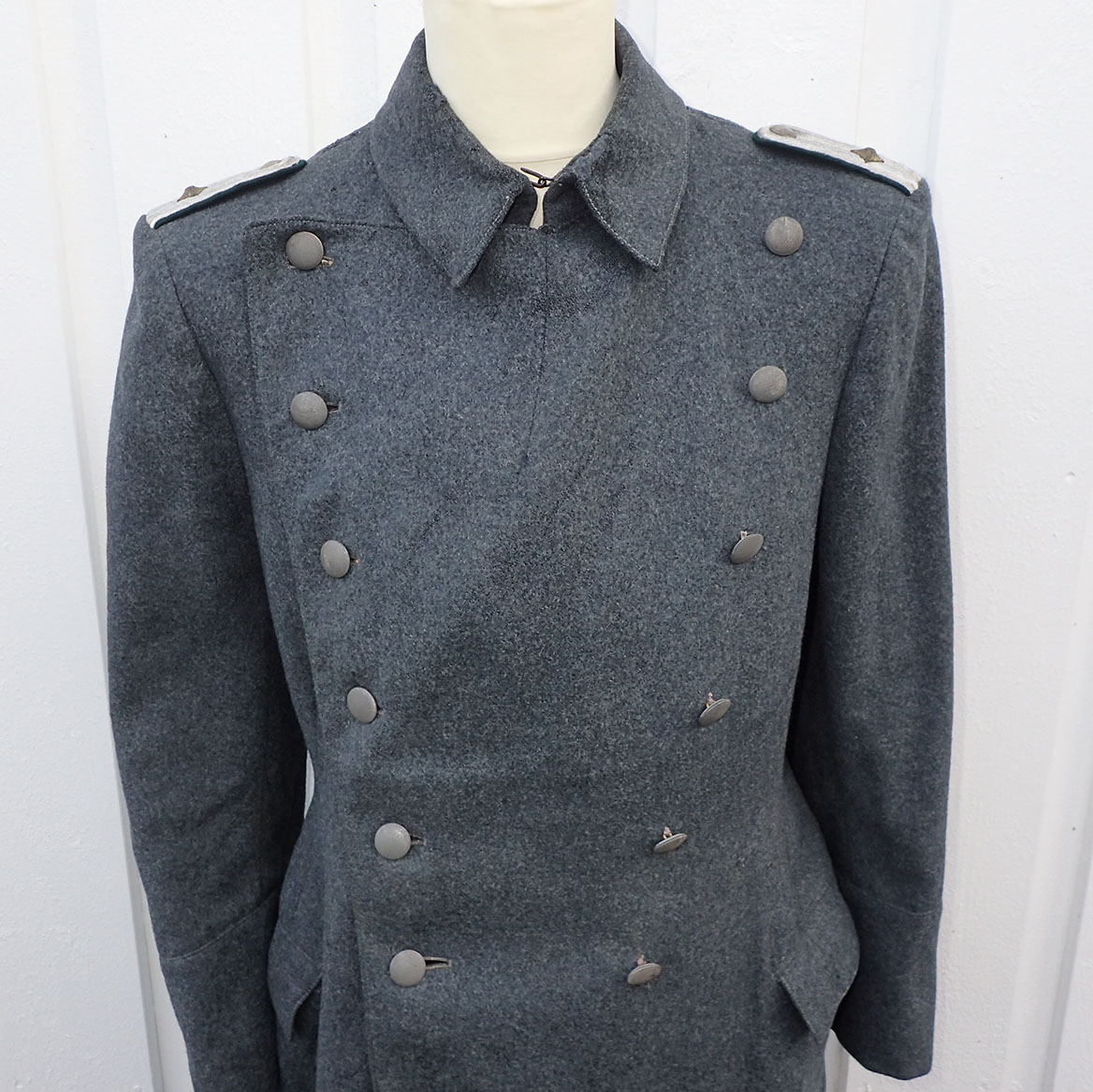 Nasjonal Samling Politi Løytnant 1 frakk. Sydd i grå uniformsstoff. Typisk NS politi snitt med skrå knepping. Knappene er NS politi original påsydde og bak stemplet med produsenten CORNELIUSSEN & OLSEN. OSLO. Bak med stramme-hempe med 2 knapper påsydd. I halsen to sortlakkerte metallhemper påsydd. Med originalt nedsydde skulderklaffer for Politiløytnant 1. Innvendig med grå ullfòr. Med en innerlomme og på innsiden av innerlommen skredder-etikett sydd hos: Dressmagasinet H. RABINOWITZ. BERGEN. Så fylt inn med sort blekk NAVN Wraa. Nr. 492. Dat. 19/10-43. I armene grønn glatt bomullsfòr. Nede i folden bak med 4 små metall-knapper.