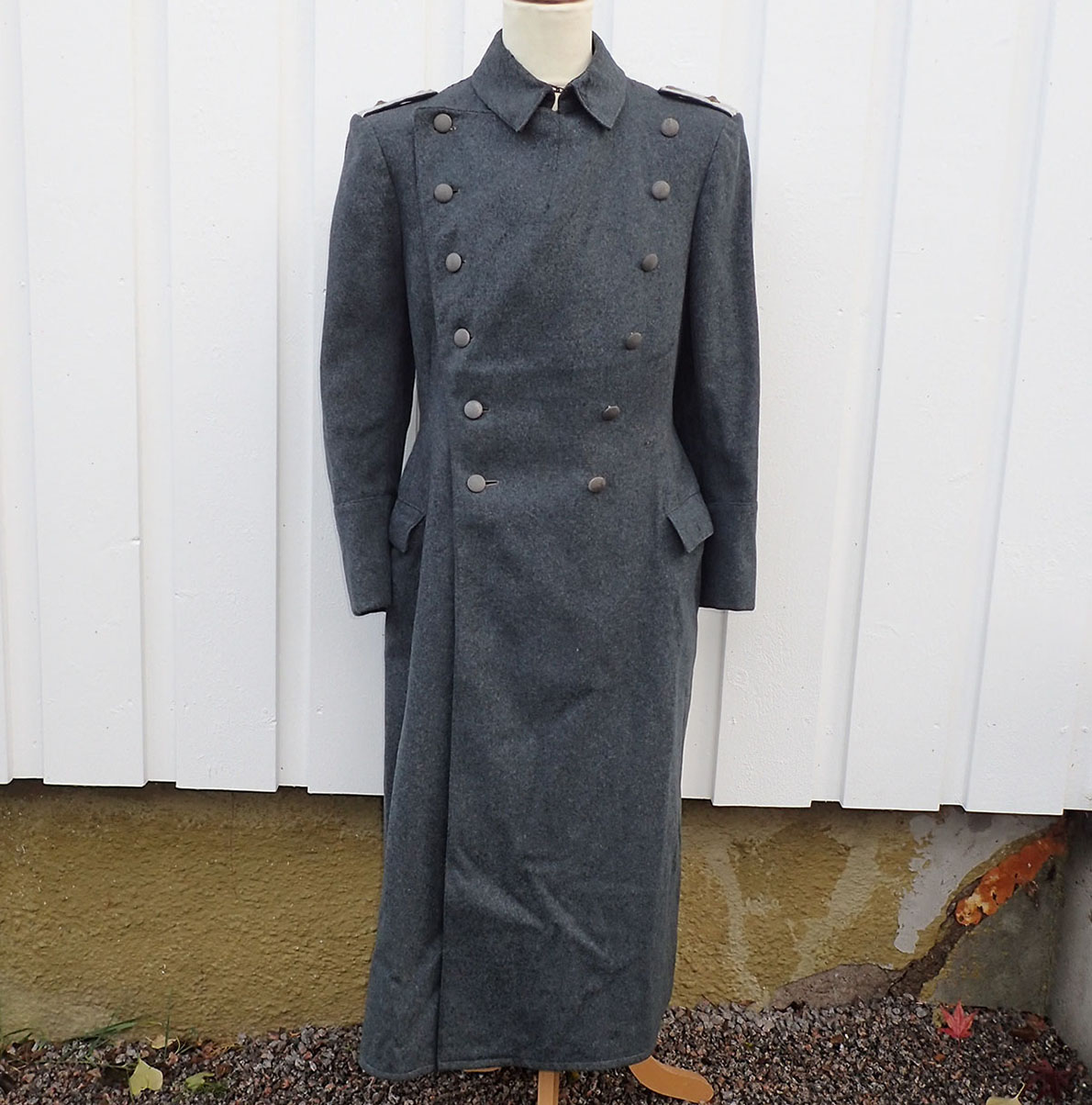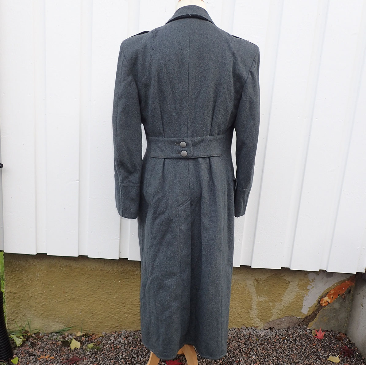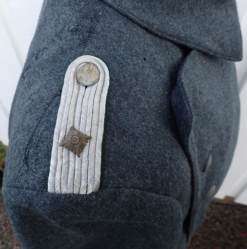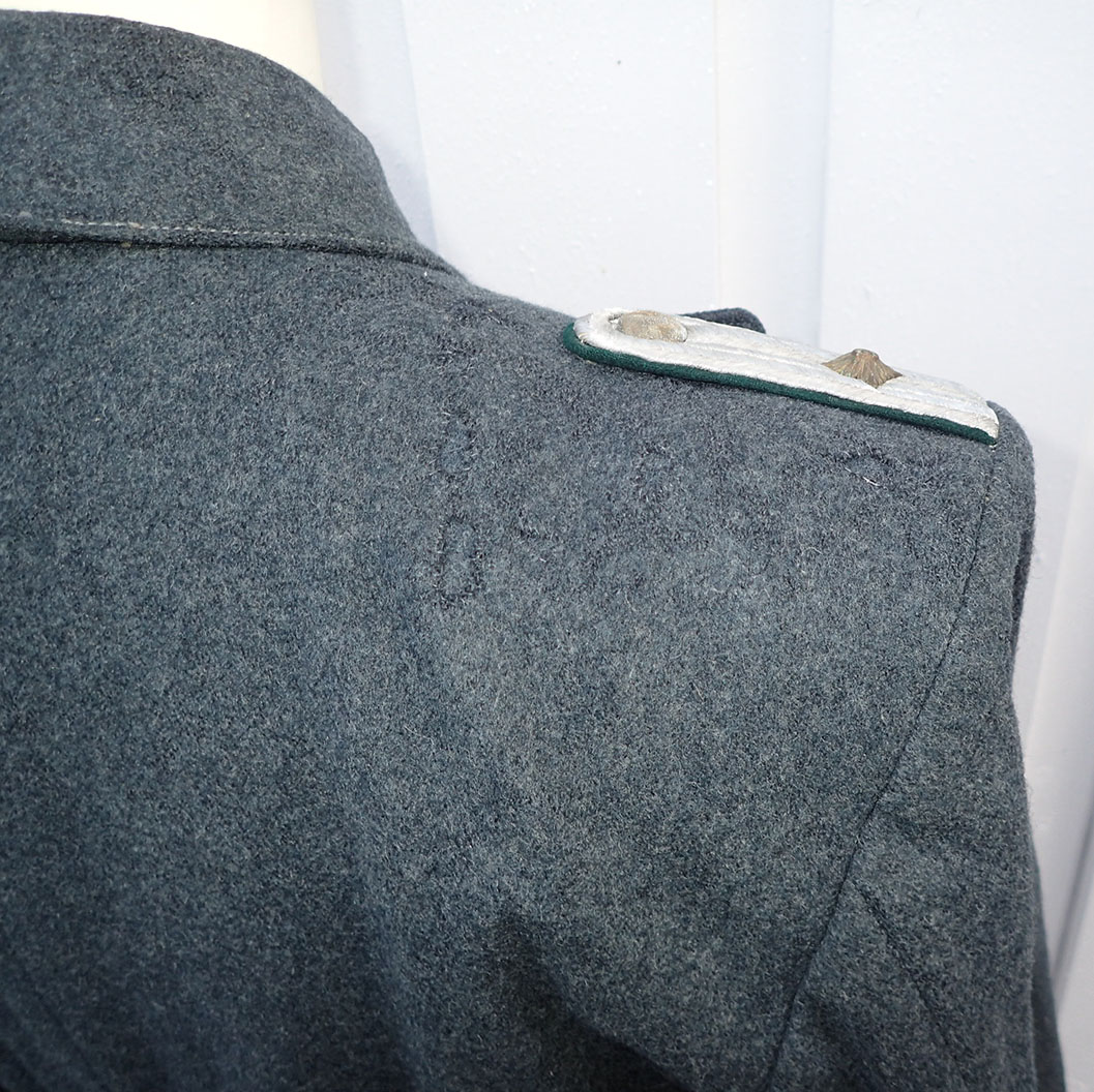 Nasjonal Samling Politi Løytnant 1 frakk. Sydd i grå uniformsstoff. Typisk NS politi snitt med skrå knepping. Knappene er NS politi original påsydde og bak stemplet med produsenten CORNELIUSSEN & OLSEN. OSLO. Bak med stramme-hempe med 2 knapper påsydd. I halsen to sortlakkerte metallhemper påsydd. Med originalt nedsydde skulderklaffer for Politiløytnant 1. Innvendig med grå ullfòr. Med en innerlomme og på innsiden av innerlommen skredder-etikett sydd hos: Dressmagasinet H. RABINOWITZ. BERGEN. Så fylt inn med sort blekk NAVN Wraa. Nr. 492. Dat. 19/10-43. I armene grønn glatt bomullsfòr. Nede i folden bak med 4 små metall-knapper.