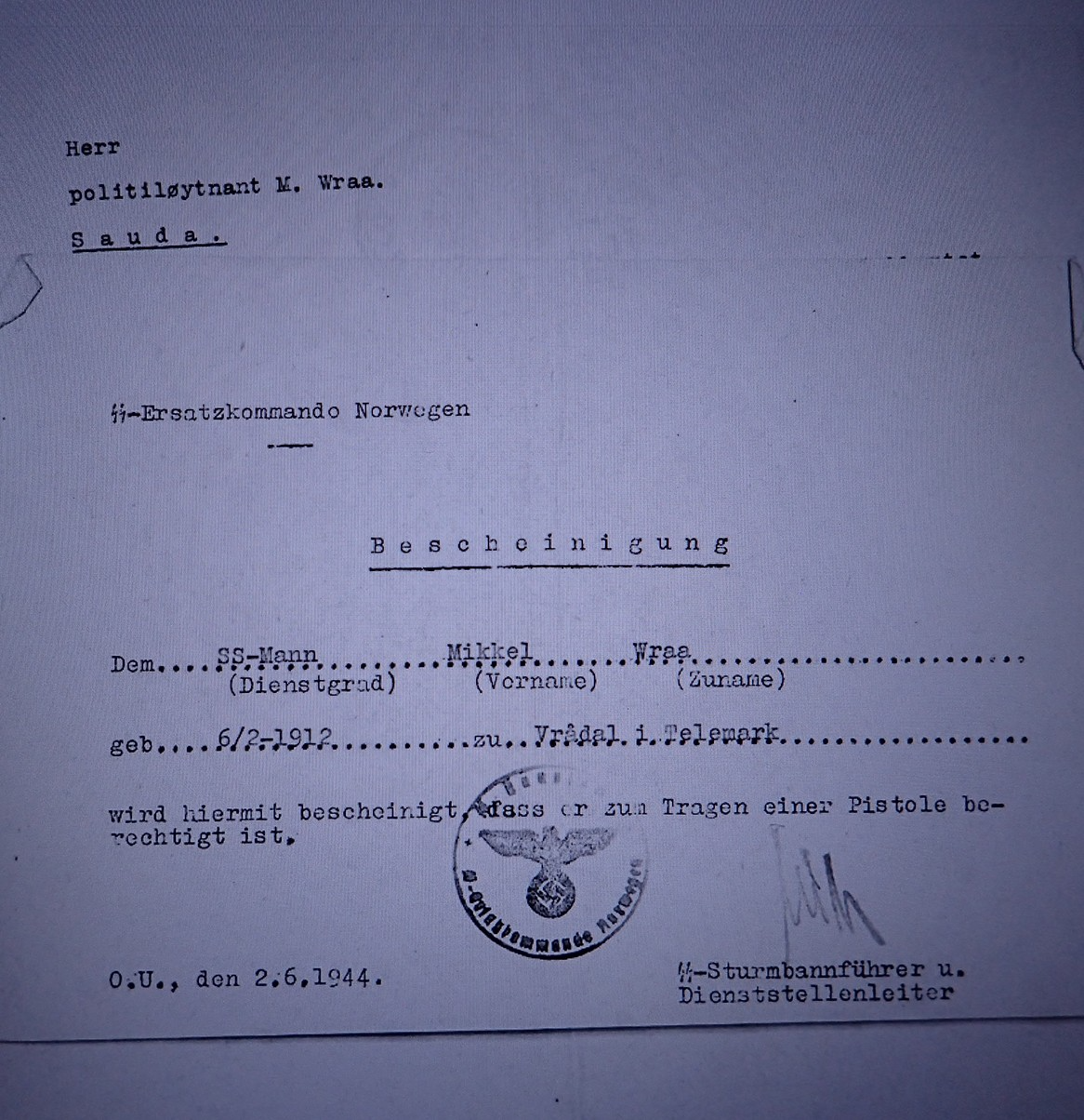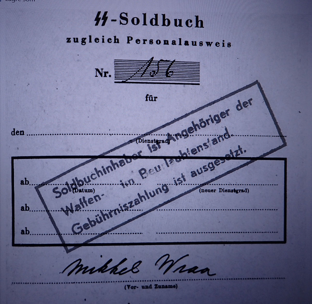 Mikkel Wraa søkte seg til Germanske SS Norge i 1943. Han fikk uniform og SS Soldbuch.