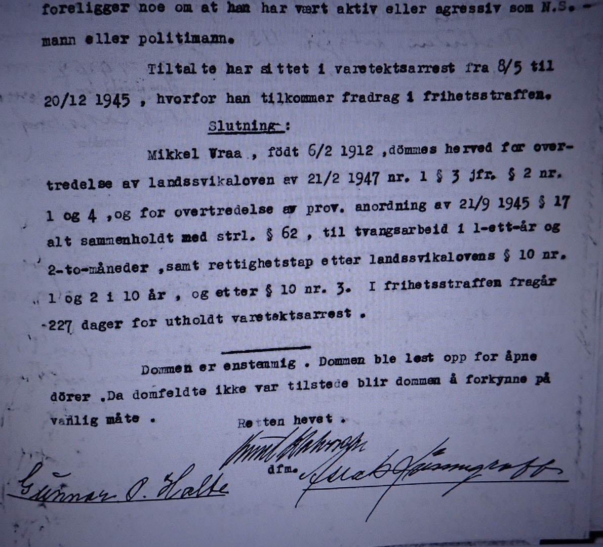 Tiltalte har sittet i varetektsarrest fra 8.5. – 20.12.1945, hvorfor han tilkommer fradrag i frihetsstraffen.
