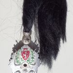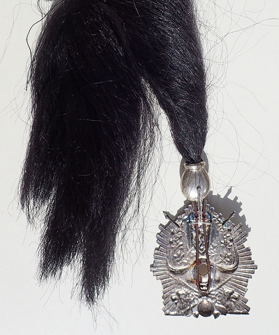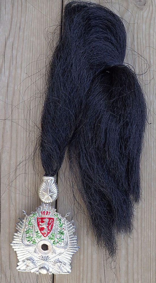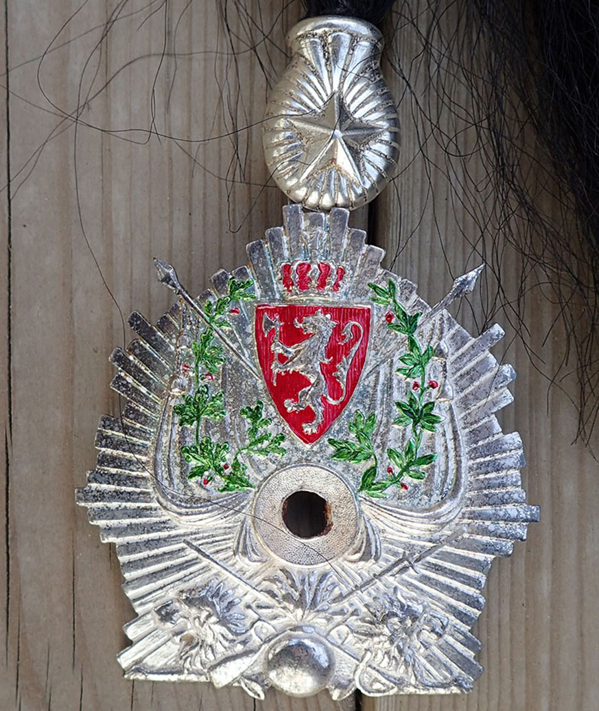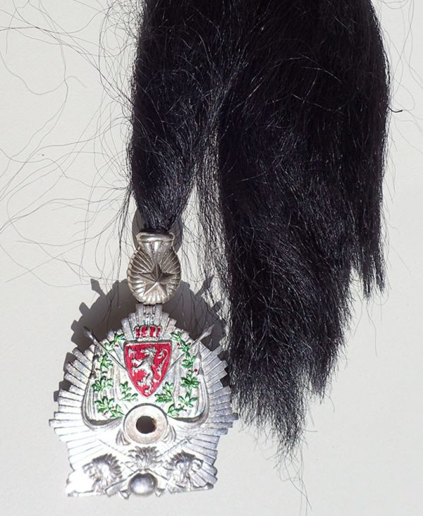 NORGE. Krigsskoleskilt. 1906-1937. Produsert i forsølvet metall med rød og grønn emalje. Bak med feste for å sette på kepien og komplett med den lange dusken i sort hestehår.