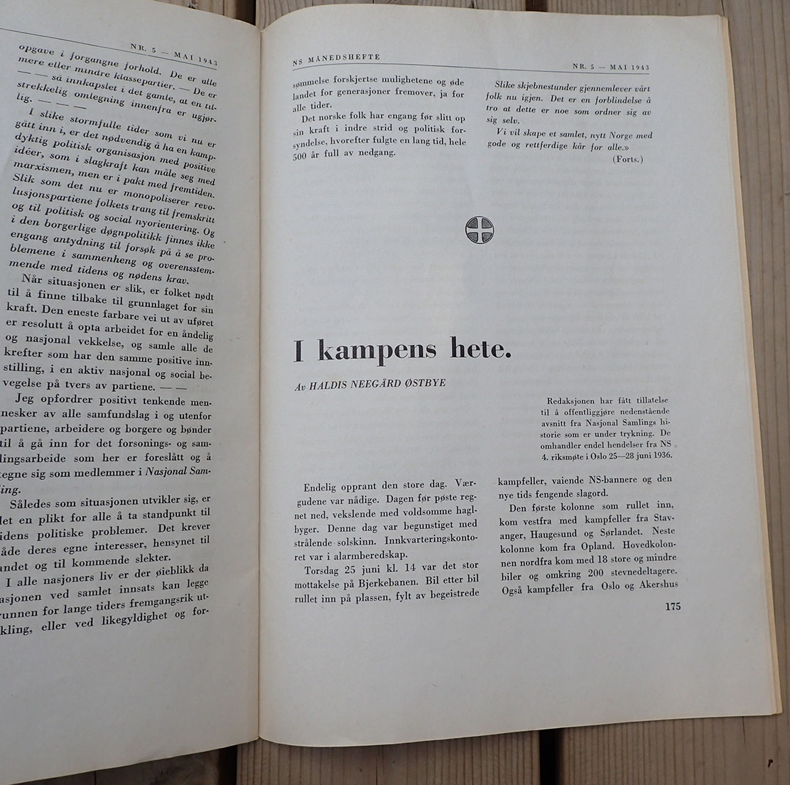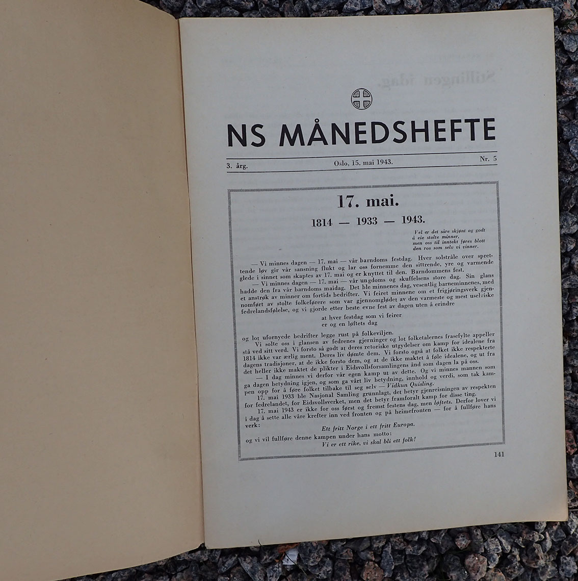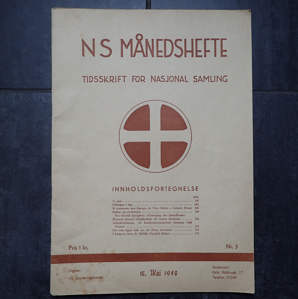NS MÅNEDSHEFTE. 15. Mai 1943. Trykket hos NASJONAL SAMLINGS RIKSTRYKKERI. Med litt stivere permer. Bak stemplet til AKSEL BAARDSETH på Stange.