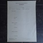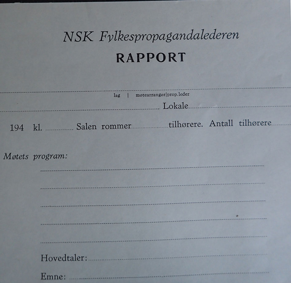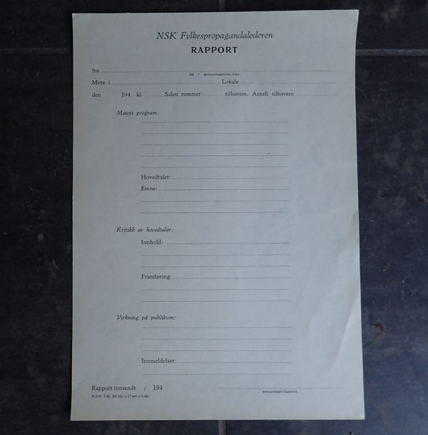 NSK Fylkespropagandalederen RAPPORT. Dette er en rapport som skulle utfylles etter en hovedtale i regi av Nasjonal Samlings Kvinneorganisasjon. Trykket hos Nasjonal Samlings Rikstrykkeri i januar 1942.