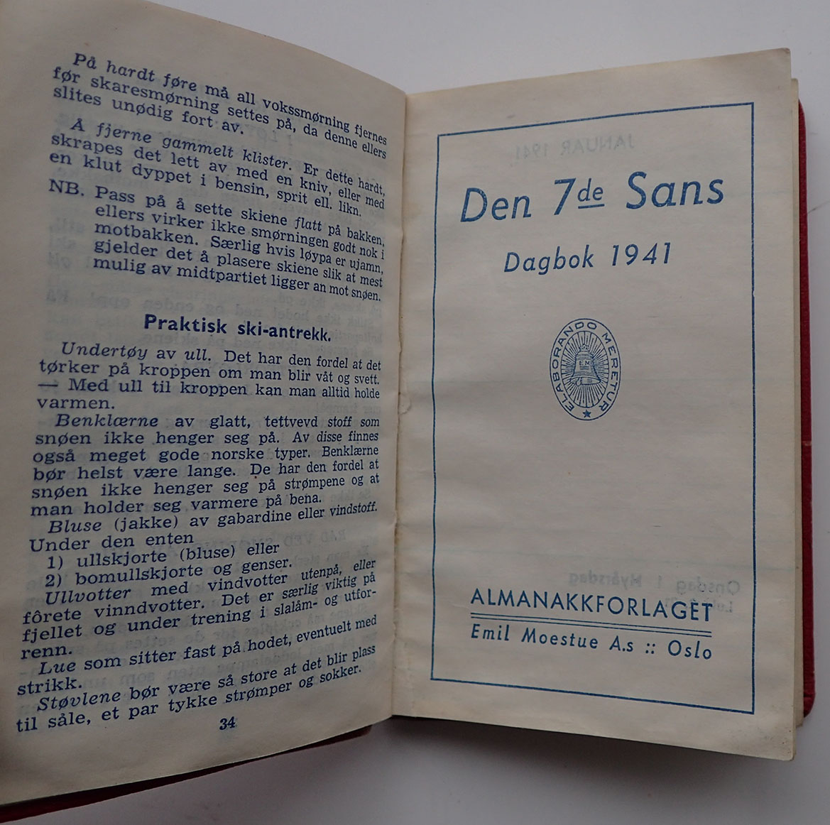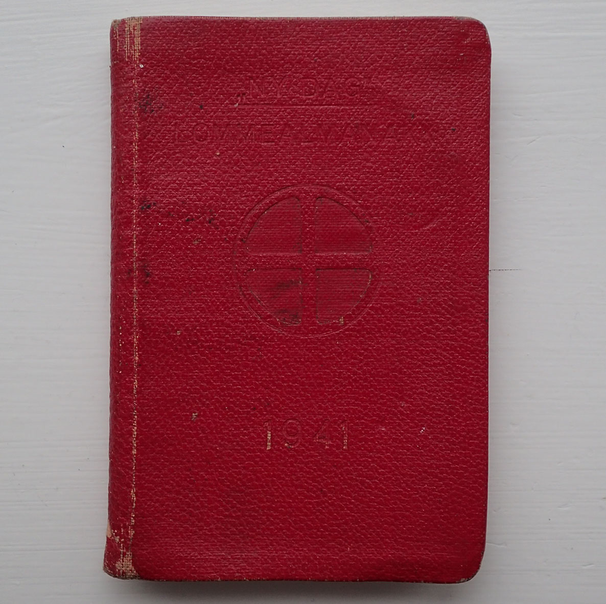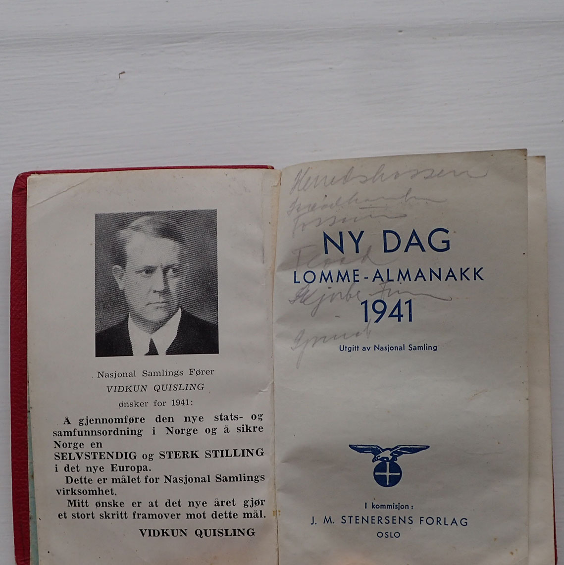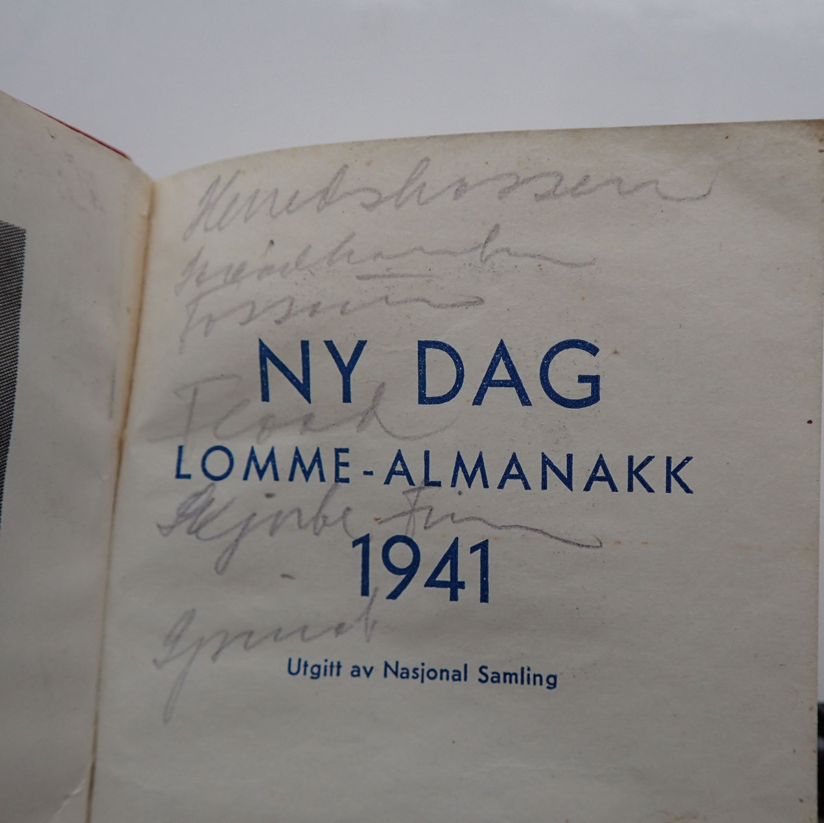 «NY DAG» LOMME-ALMANAKK 1941. J. M. STENERSENS FORLAG. OSLO. Utgitt av Nasjonal Samling. Med stivere røde permer. Med norgeskart på innsiden av begge permene. På forsiden preget ned i permen teksten «NY DAG» LOMME-ALMANAKK – solkors – 1941. Dette skal være trykket i gull men gullet er slitt av, siden boken har vært mye bært i lommen.