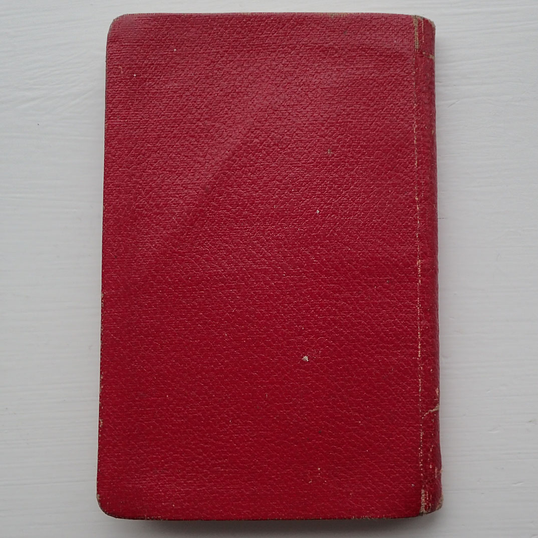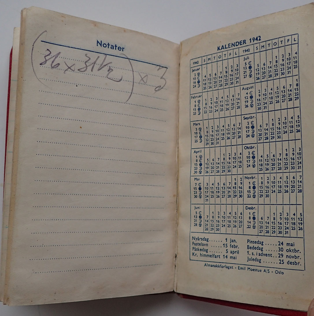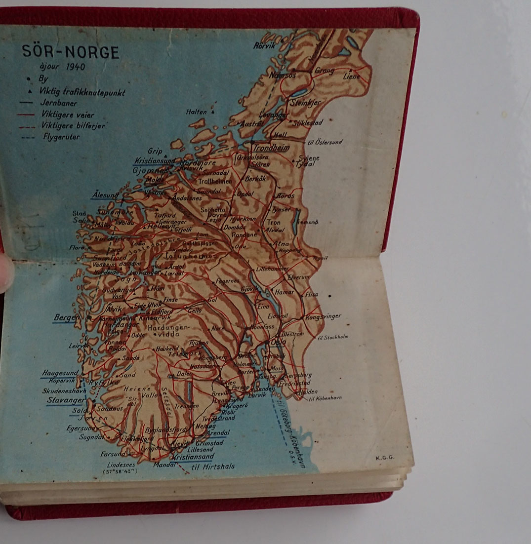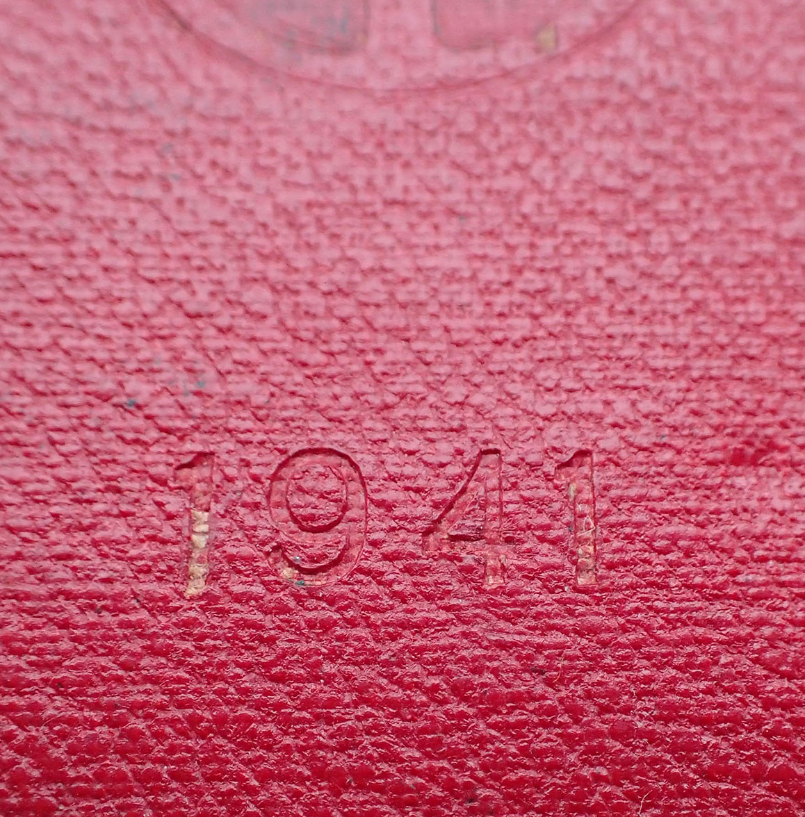 «NY DAG» LOMME-ALMANAKK 1941. J. M. STENERSENS FORLAG. OSLO. Utgitt av Nasjonal Samling. Med stivere røde permer. Med norgeskart på innsiden av begge permene. På forsiden preget ned i permen teksten «NY DAG» LOMME-ALMANAKK – solkors – 1941. Dette skal være trykket i gull men gullet er slitt av, siden boken har vært mye bært i lommen.