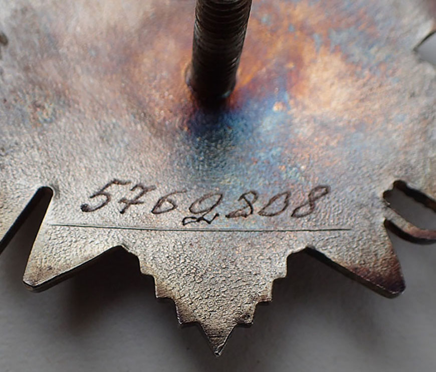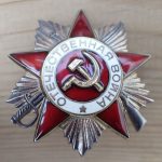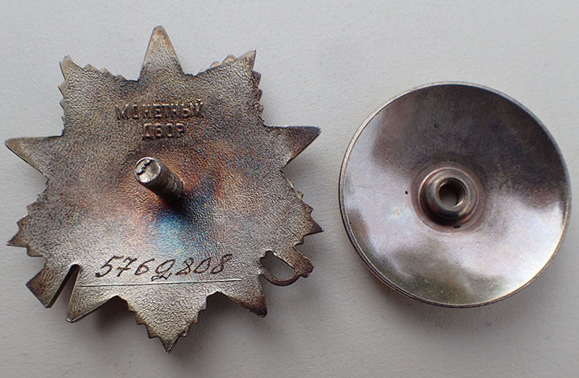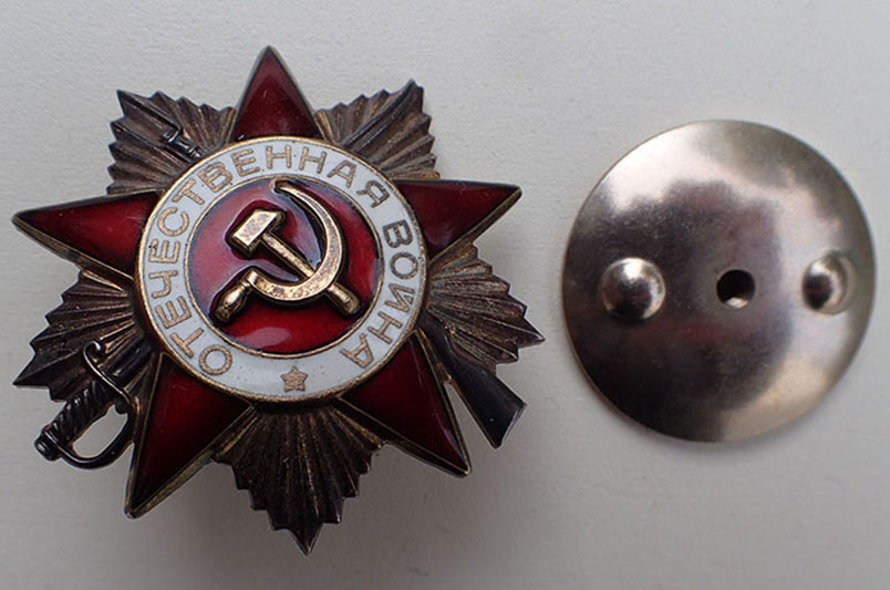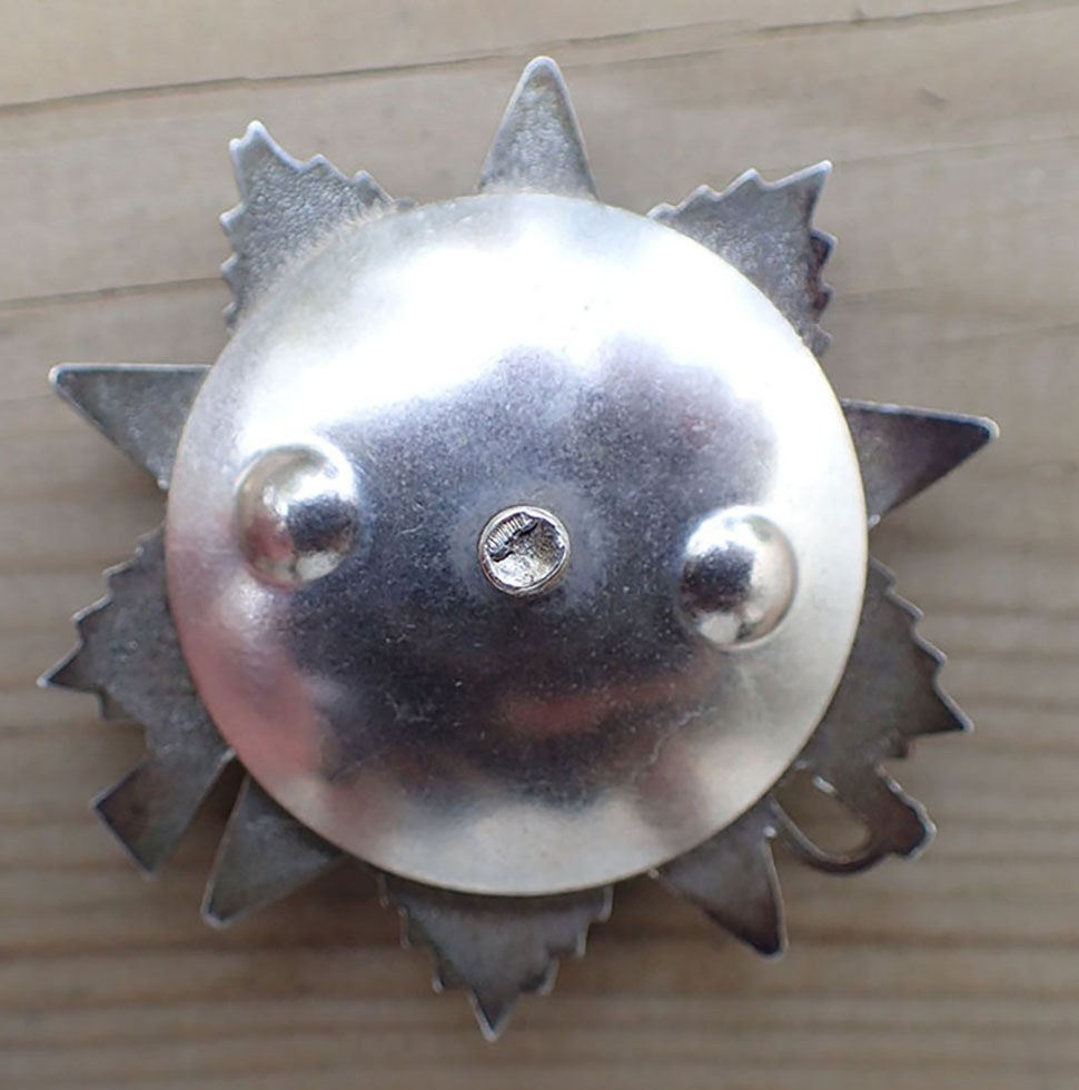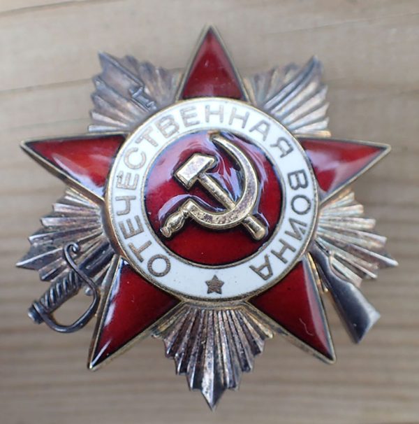 Orden av den patriotiske krig i sølv. Produsert i ekte sølv og med rød og hvit emalje. Også med gullforgylt tekst og hammer og sigd. Fin litt mørk patina. Bak merket med produsenten og gravert inn utdelingsnummer 5762808.