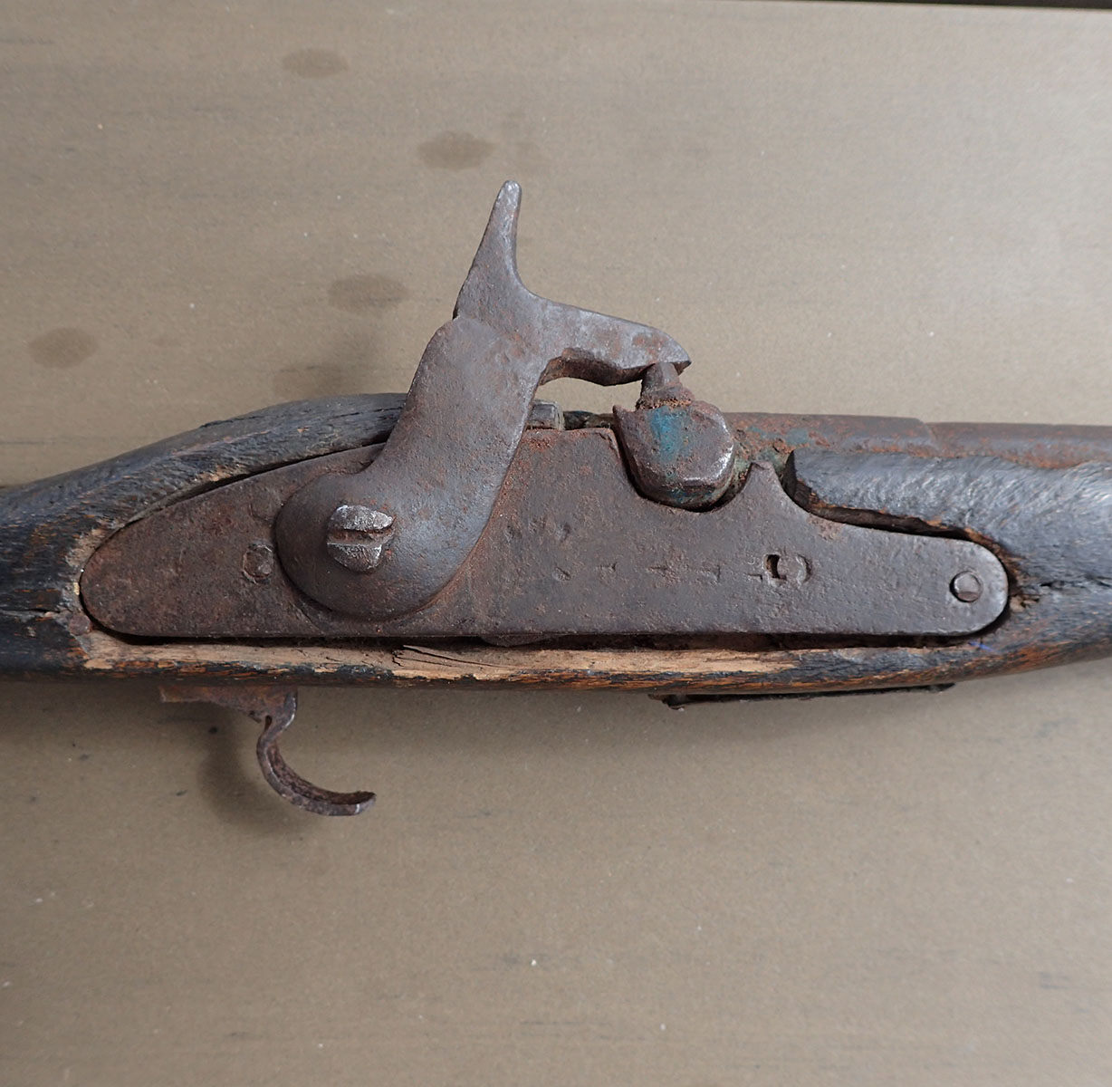 Perkusjonspistol laget på gården. Dette er en enkel pistol laget på bondegården. Ble brukt til selvforsvar også for å beskytte seg mot rovdyr. Løpet er fra en eldre munnlader som har blitt nedkortet. Glattboret. Låsekassen er mulig fra samme munnlader. Med stempling på siden. Under med ett messingskilt hvor pussestokken skyes inn i. Treverket er håndlaget på gården.