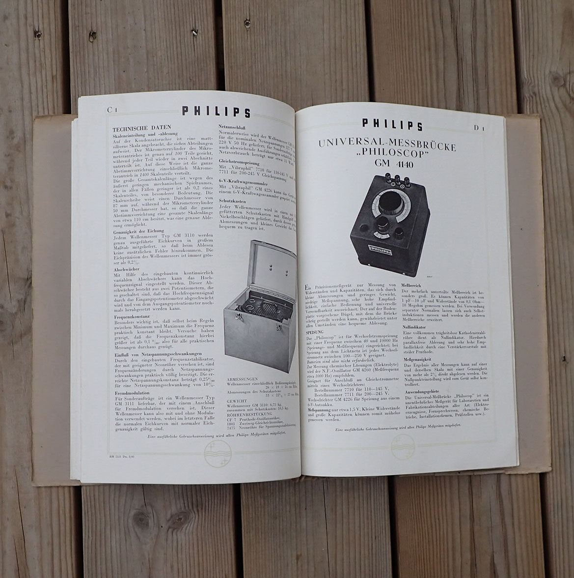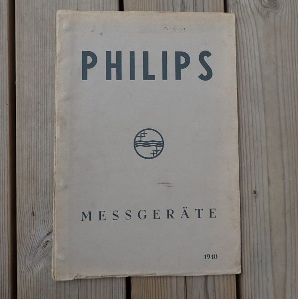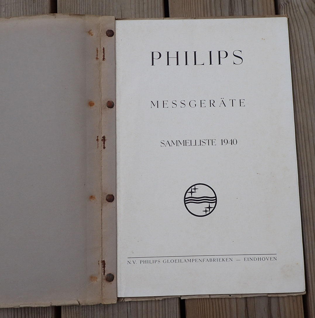 PHILIPS MESSGERÄTE katalog fra 1940. Trykket hos Philips i Eindhoven i 1940. Trykket på glatt kvalitets papir med bilder og teknisk beskrivelse av alle produktene. Også flere maskinskrevne A4 ark er satt inn i folderen. Man kan ta ut og sette inn ark da det er metall klips i ryggen som kan løsne arkene.