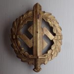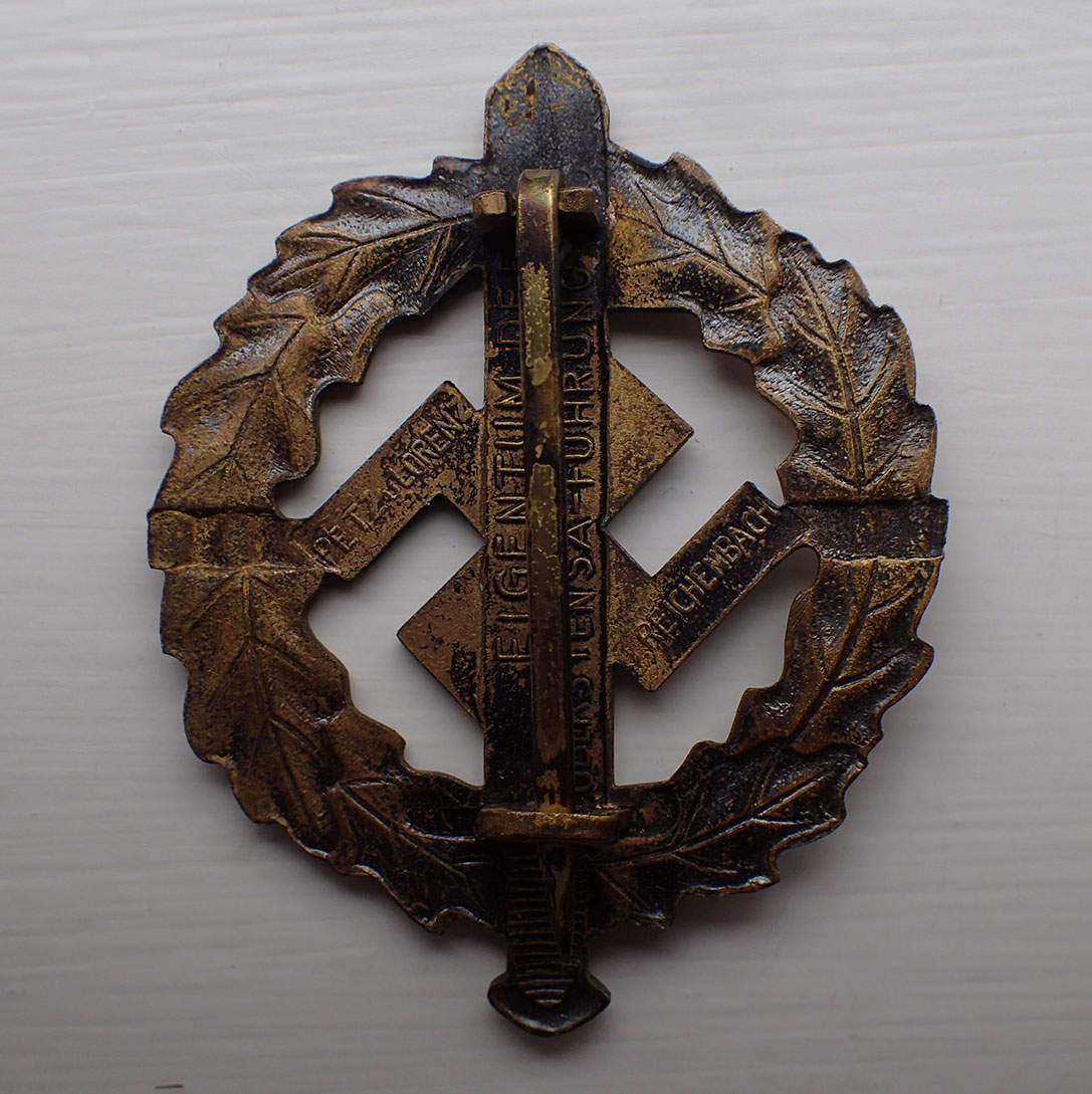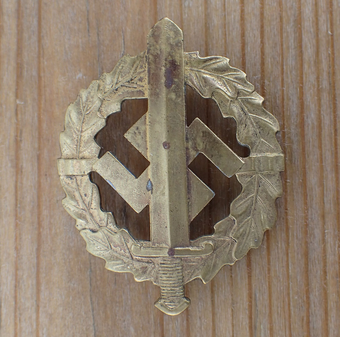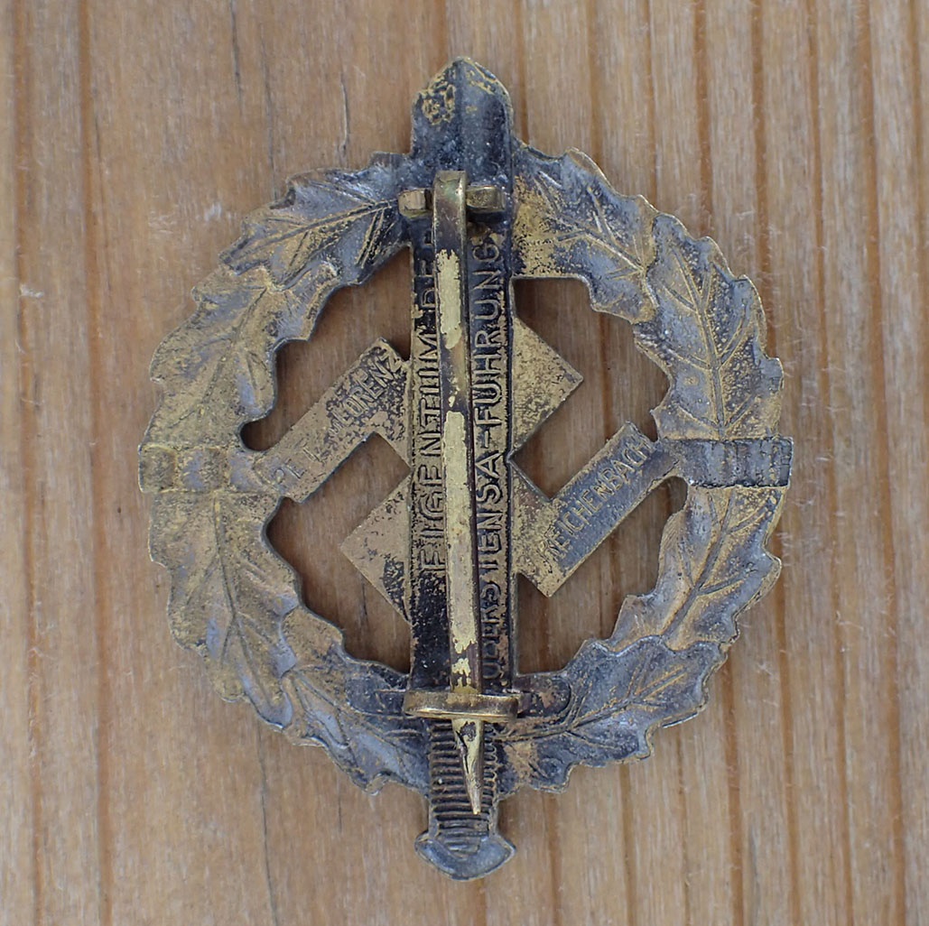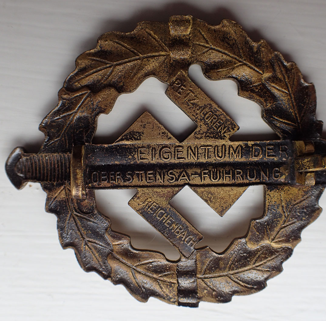 SA-sportsmerke i bronse. Innstiftet 19. januar 1939. Tidlig utgave produsert i patinert messing. Foran er mye at patineringen slitt av. Bak stemplet med produsenten EIGENTUM DER OBERSTEN SA-FÜHRUNG. PETZ u. LORENZ. REICHENBACH. Med flat nål i messing og med fine nålfester.