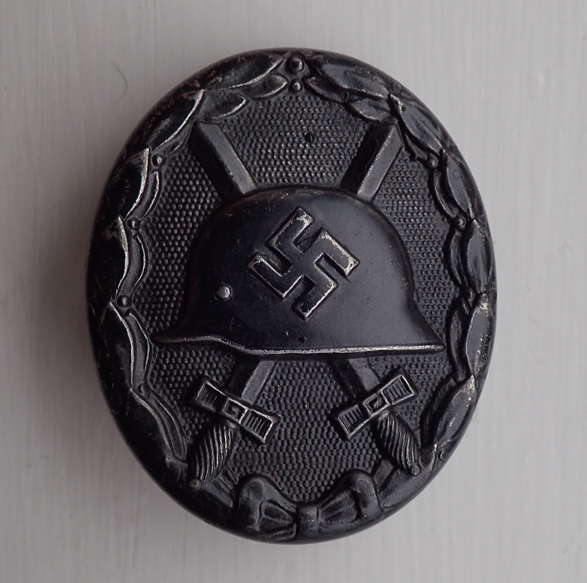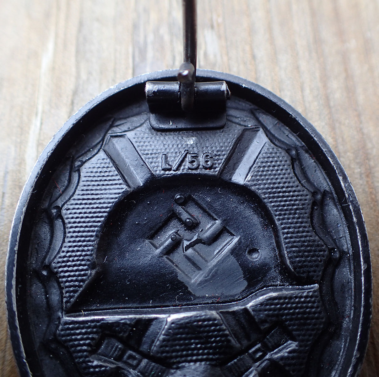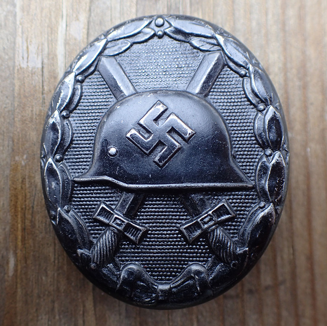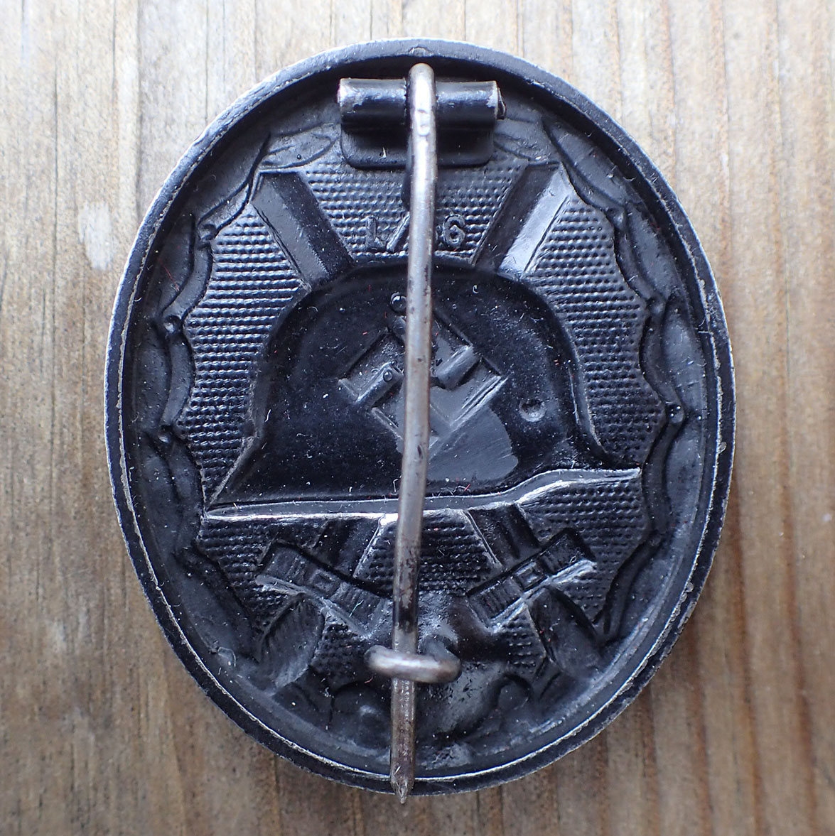 Såret merke i sort. Senere utgave i jern lakkert med sort blank maling. Med rund tynn nål i jern og med fine nålfester. Bak oppe merket med en uvanlig produsent L/56 (Funke & Brüninghaus. Lüdenscheid).