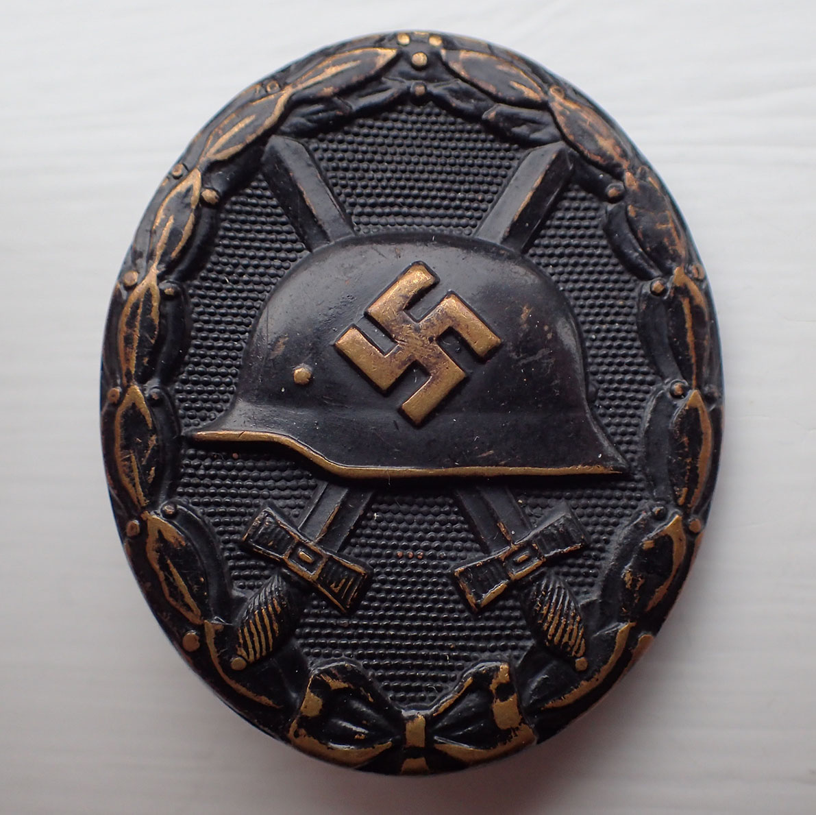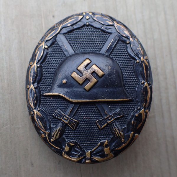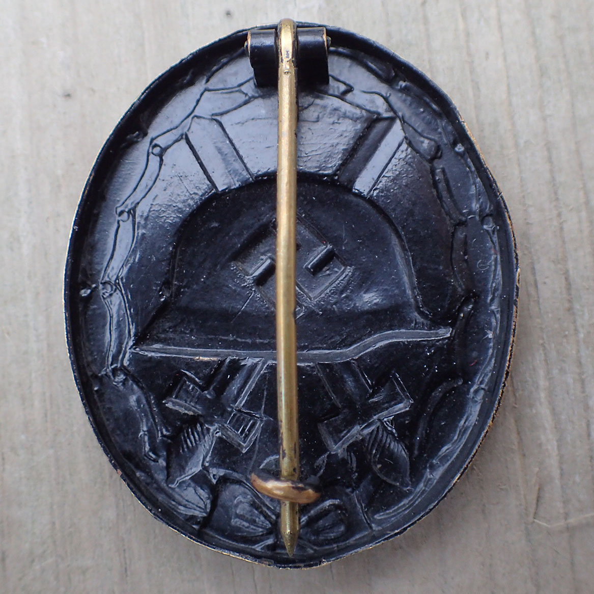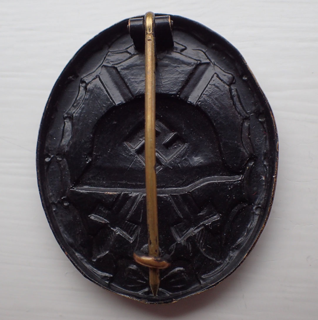 Såret merke i sort. Innstiftet 1. september 1939. Tidlig utgave i lakkert messing. Kun litt slitasje foran på toppene. Bak med rund tynn nål i messing og med fine nålfester. Bak strøken i malingen.