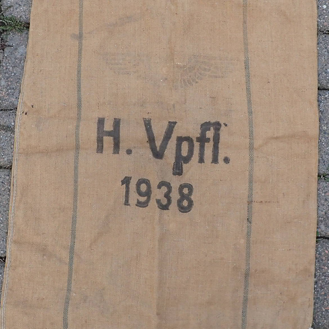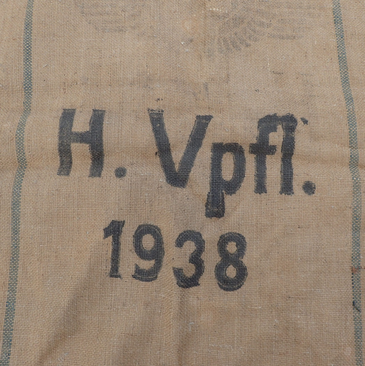 Heeres Verpflegung striesekk. Stemplet på den ene siden med sort H. Vpfl. 1938. Oversatt «Hærens rasjoner». På den andre siden stemplet med Riksørn. Man kan se en dobbelstempling av Riksørnen på baksiden. Sydd i beige sekkestrie med blå loddrette striper på begge siden.