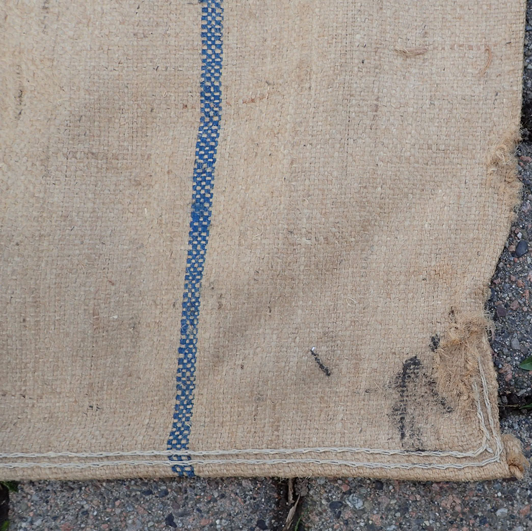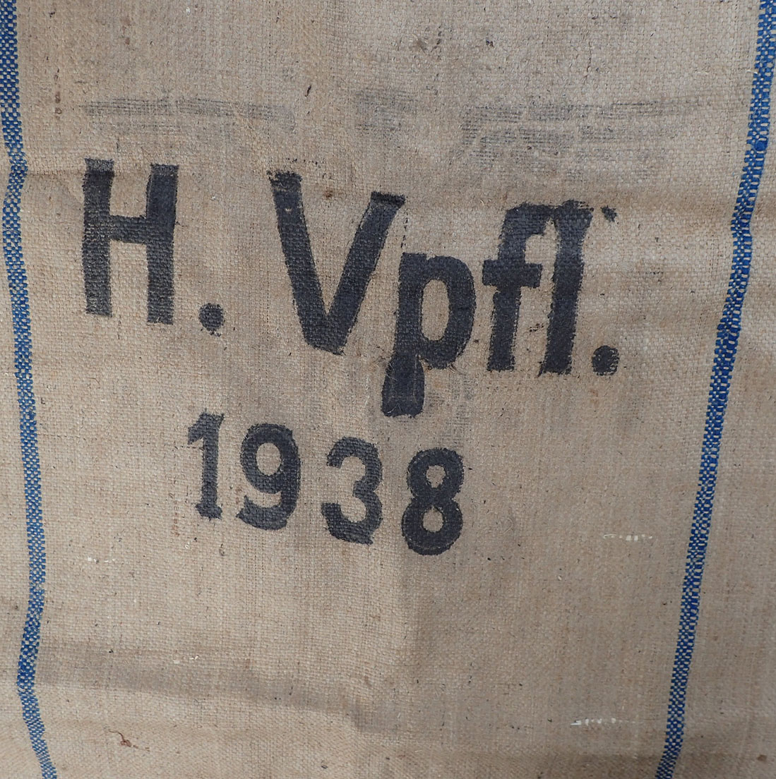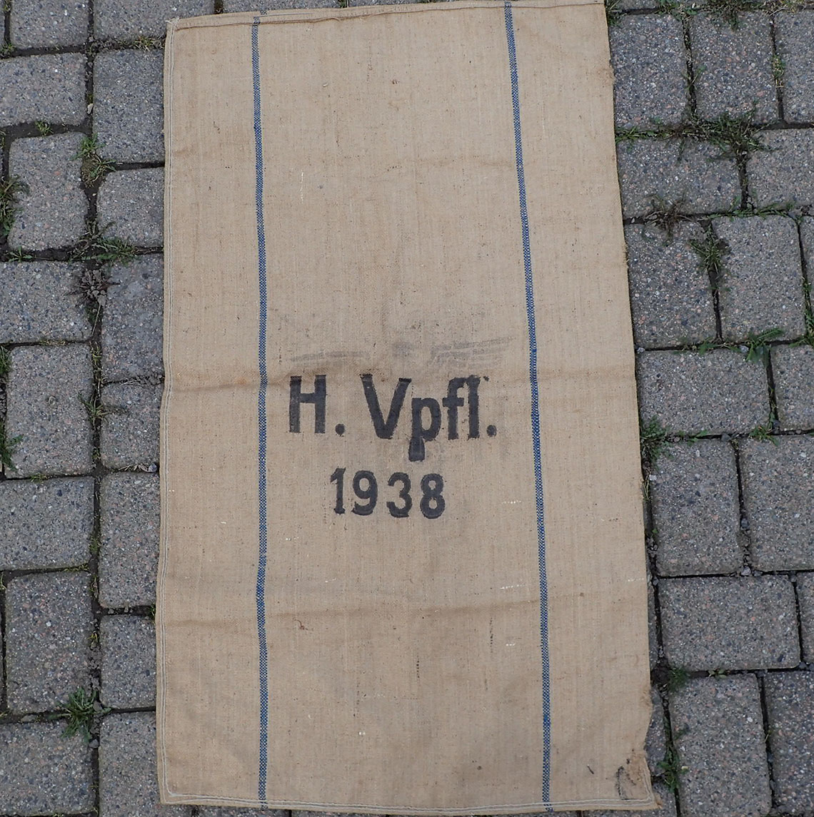 Heeres Verpflegung striesekk. Stemplet på den ene siden med sort H. Vpfl. 1938. Oversatt «Hærens rasjoner». På den andre siden stemplet med Riksørn. Sydd i beige sekkestrie med blå loddrette striper på begge siden.