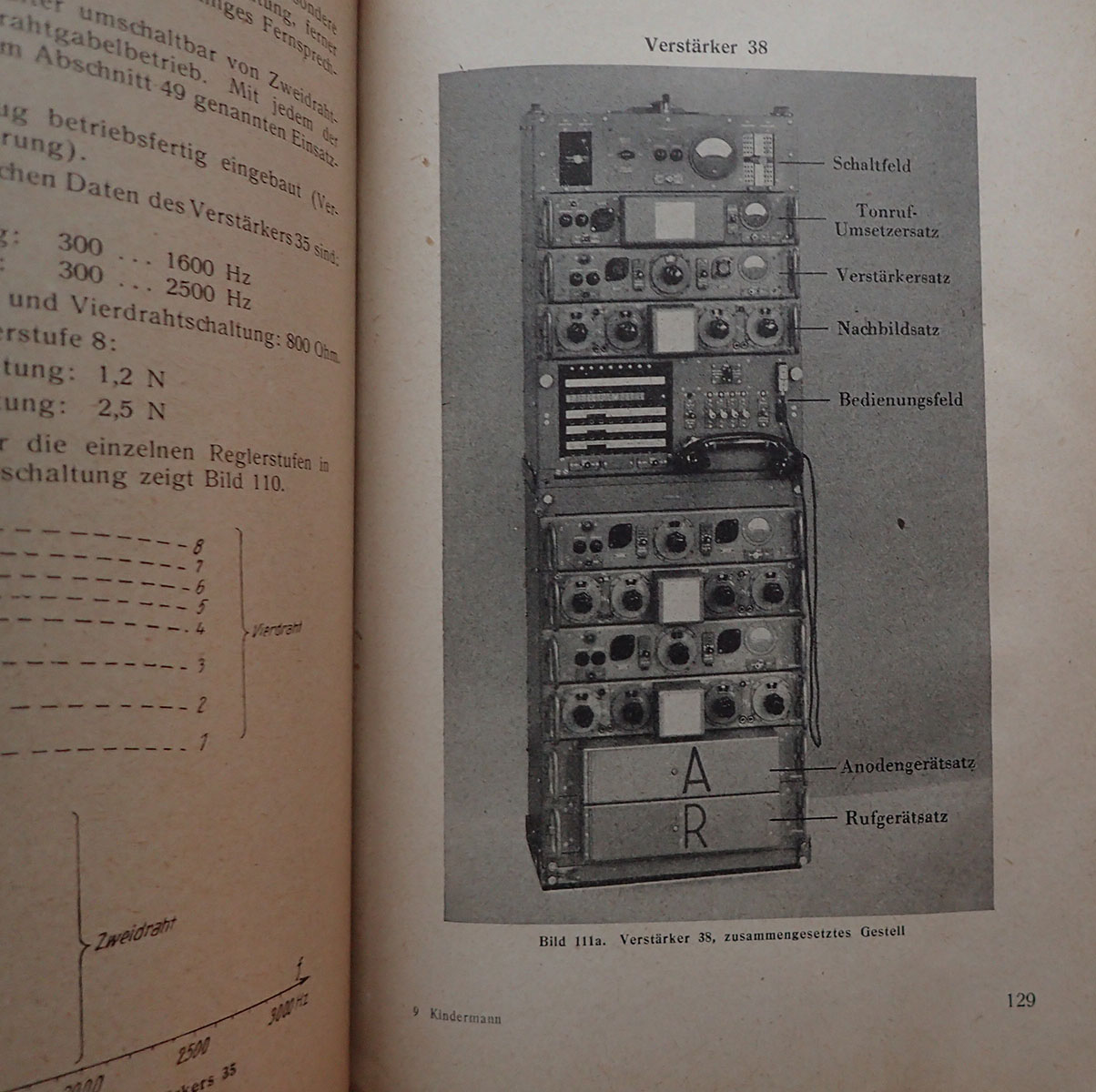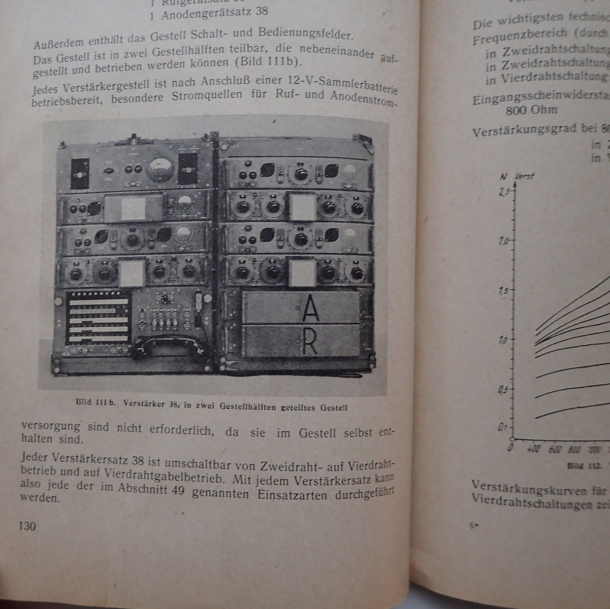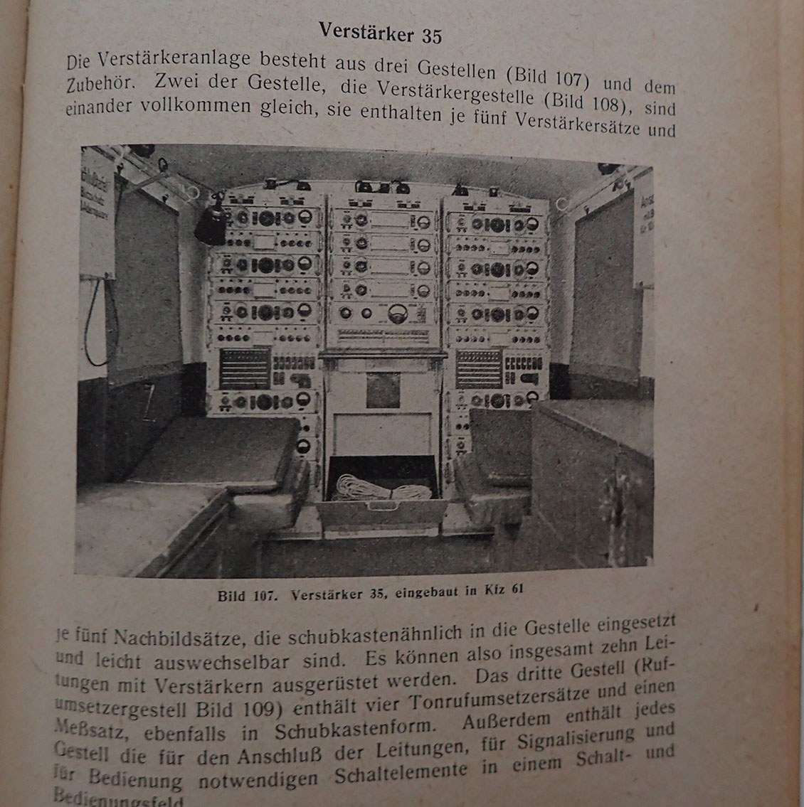 Ubertragungstechnik auf Leitungen. (Overføringsteknologi via kabler). For Nachrichtentruppe. Trykket i Berlin i 1944. 234 sider med litt tykkere permer. Innvendig med masse skalaer og diagrammer. På side 125-130 bilder av en tysk stor forsterker 35 i en Kfz. 61. (Funkkraftwagen). Også avbildet en Verstärker 38.