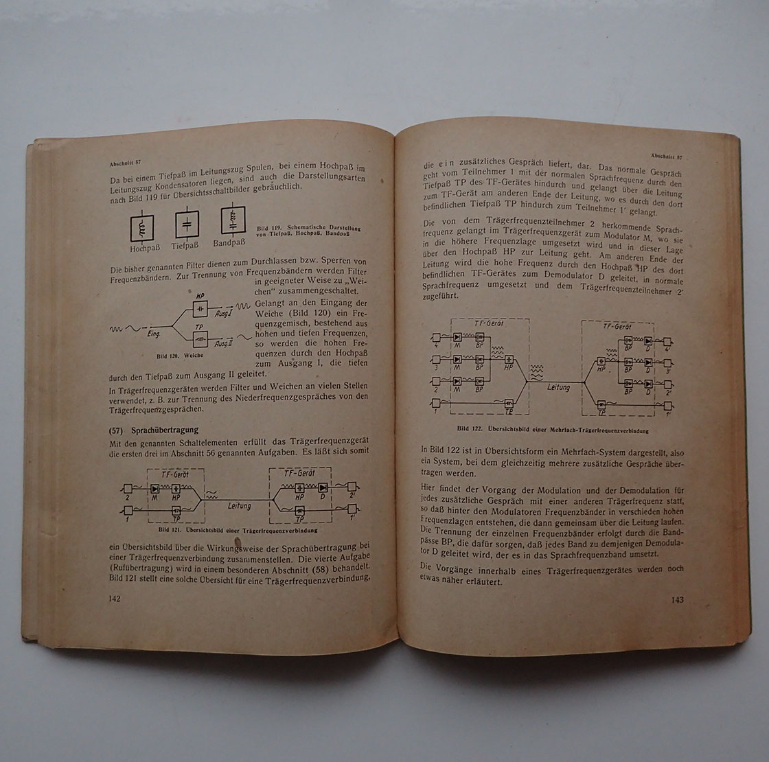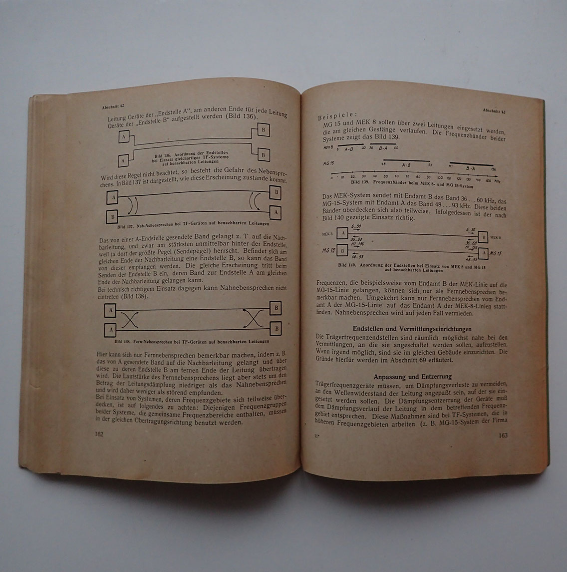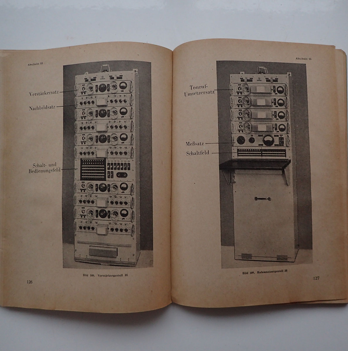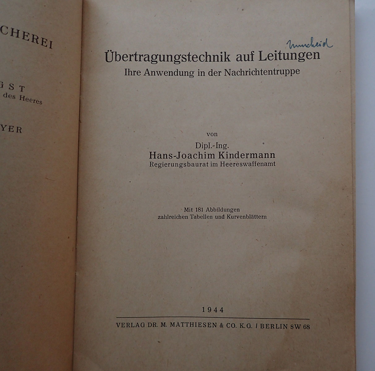 Ubertragungstechnik auf Leitungen. (Overføringsteknologi via kabler). For Nachrichtentruppe. Trykket i Berlin i 1944. 234 sider med litt tykkere permer. Innvendig med masse skalaer og diagrammer. På side 125-130 bilder av en tysk stor forsterker 35 i en Kfz. 61. (Funkkraftwagen). Også avbildet en Verstärker 38.