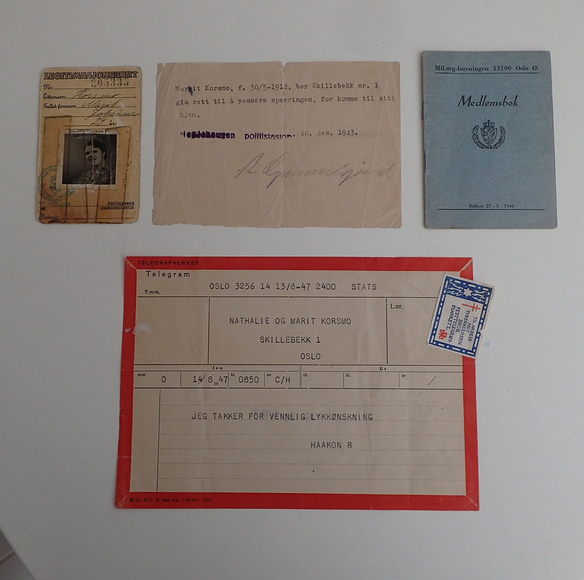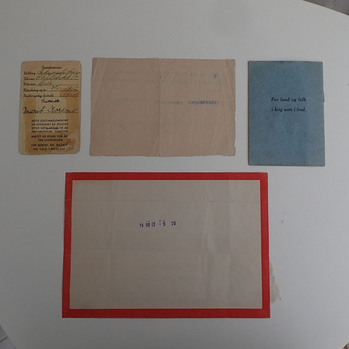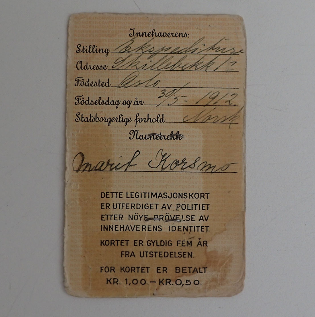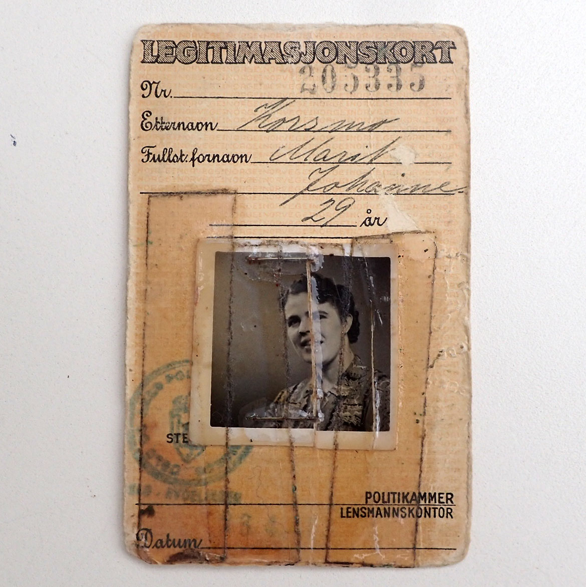 - LEGITIMASJONSKORT. Med fotografi av Marit Korsmo. Utstedt i Oslo under krigen. Ett godt brukt ID kort.