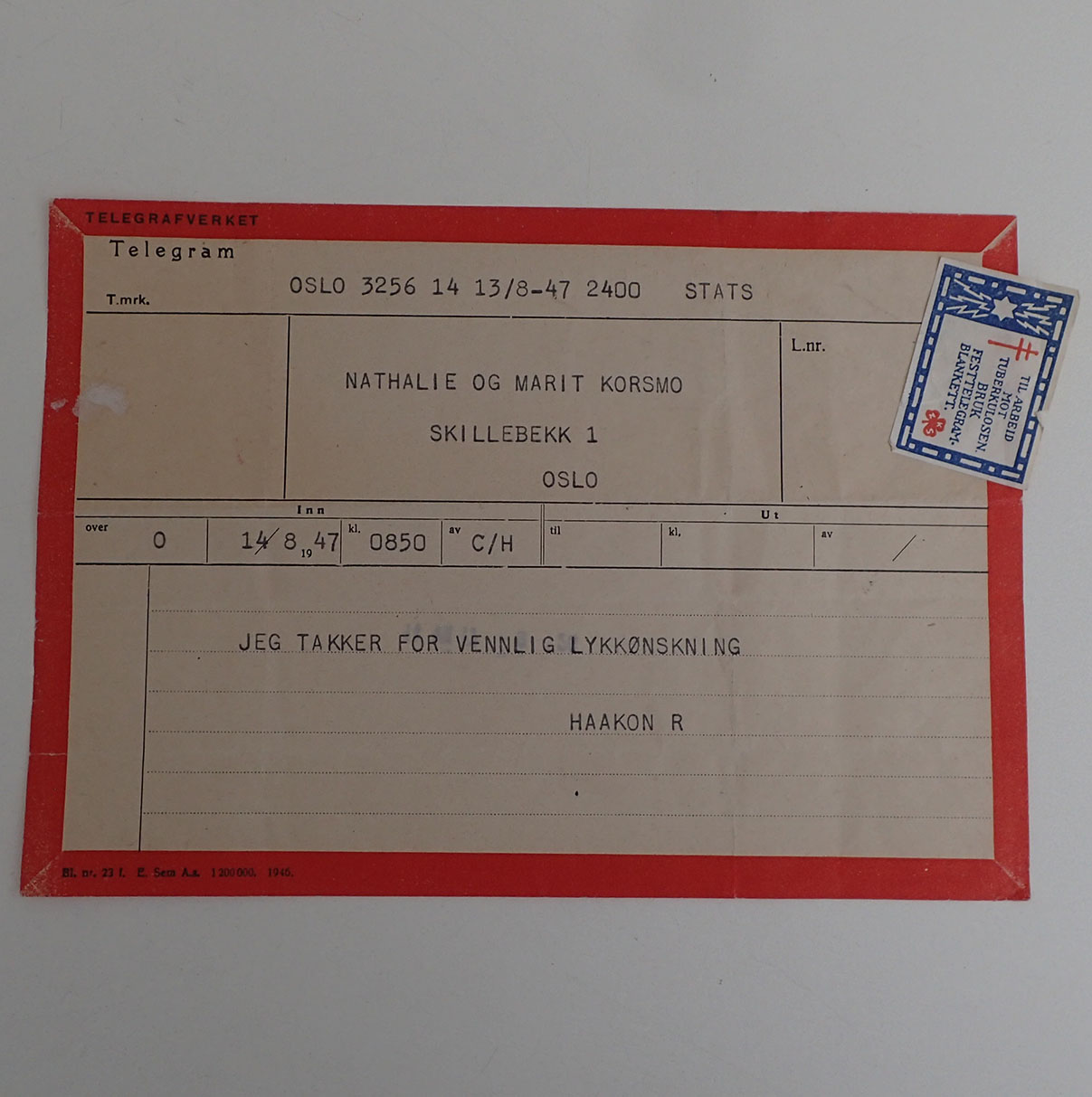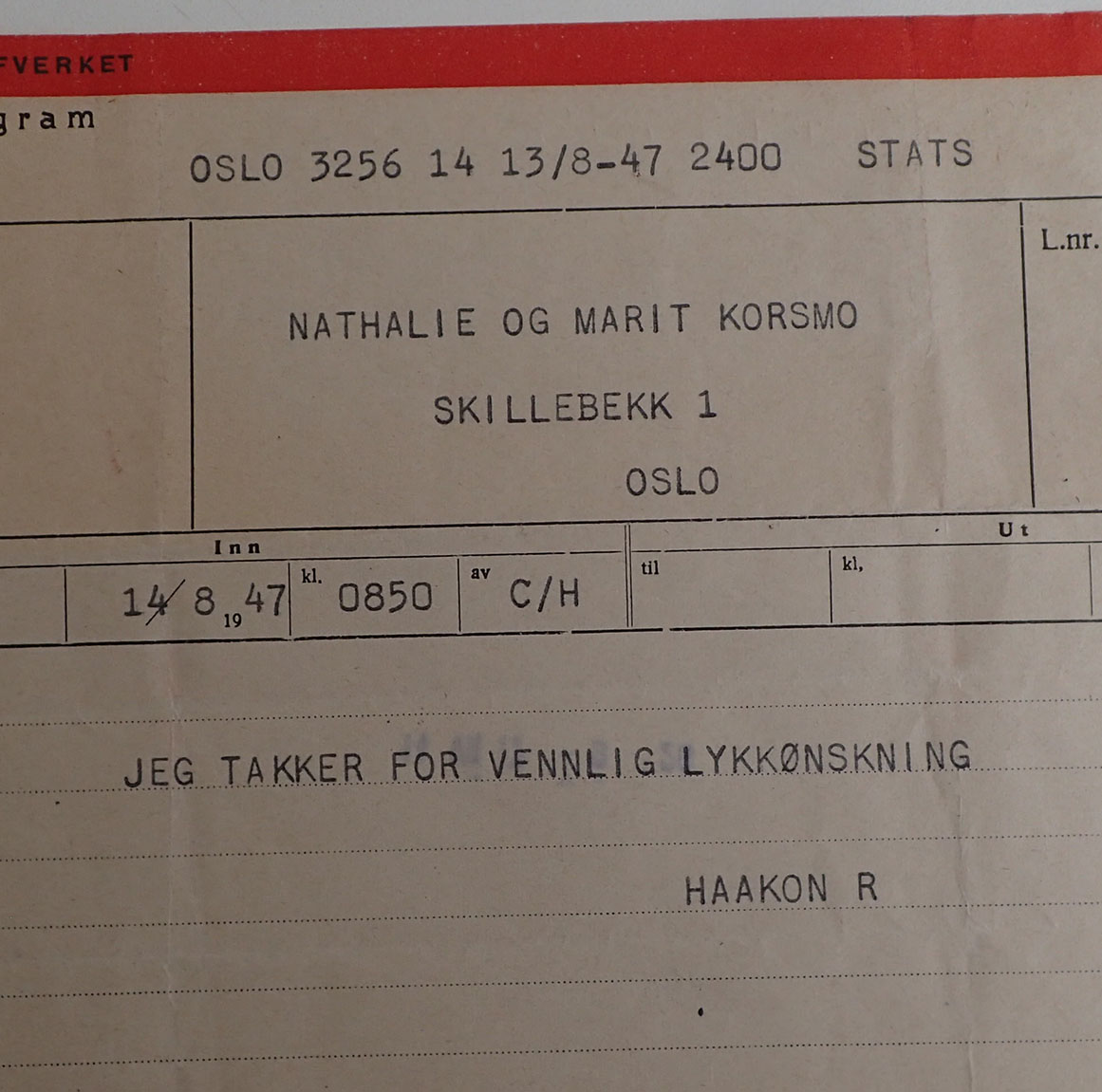 - Telegram JEG TAKKER FOR VENNLIG LYKKØNSKNING. HAAKON REX. Datert Oslo 14/8-1947. I meget pen stand.