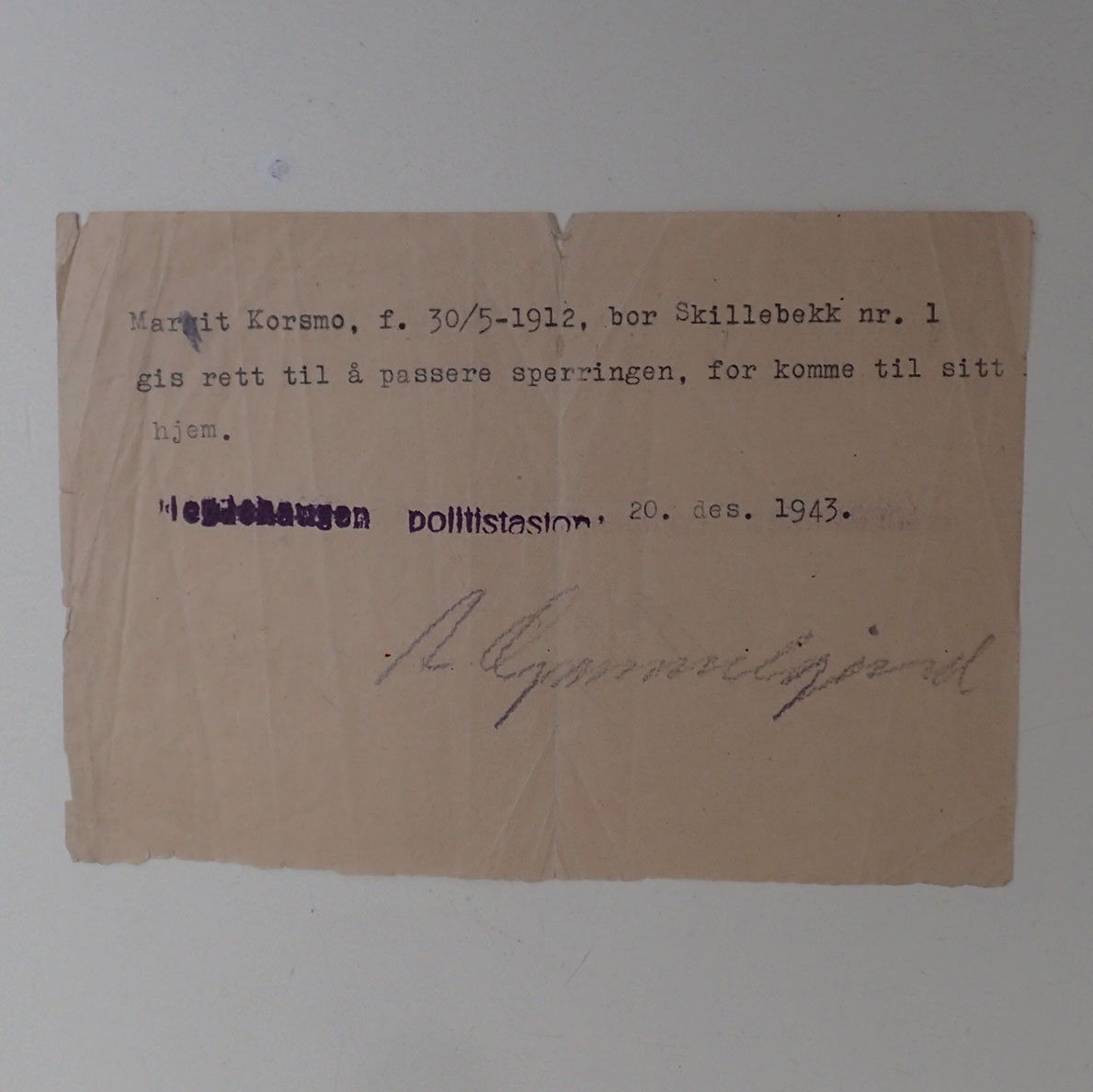 - Rett til å passere sperringen – dokument. Stemplet og signert Hegdehaugen politistasjon 20. des, 1943.