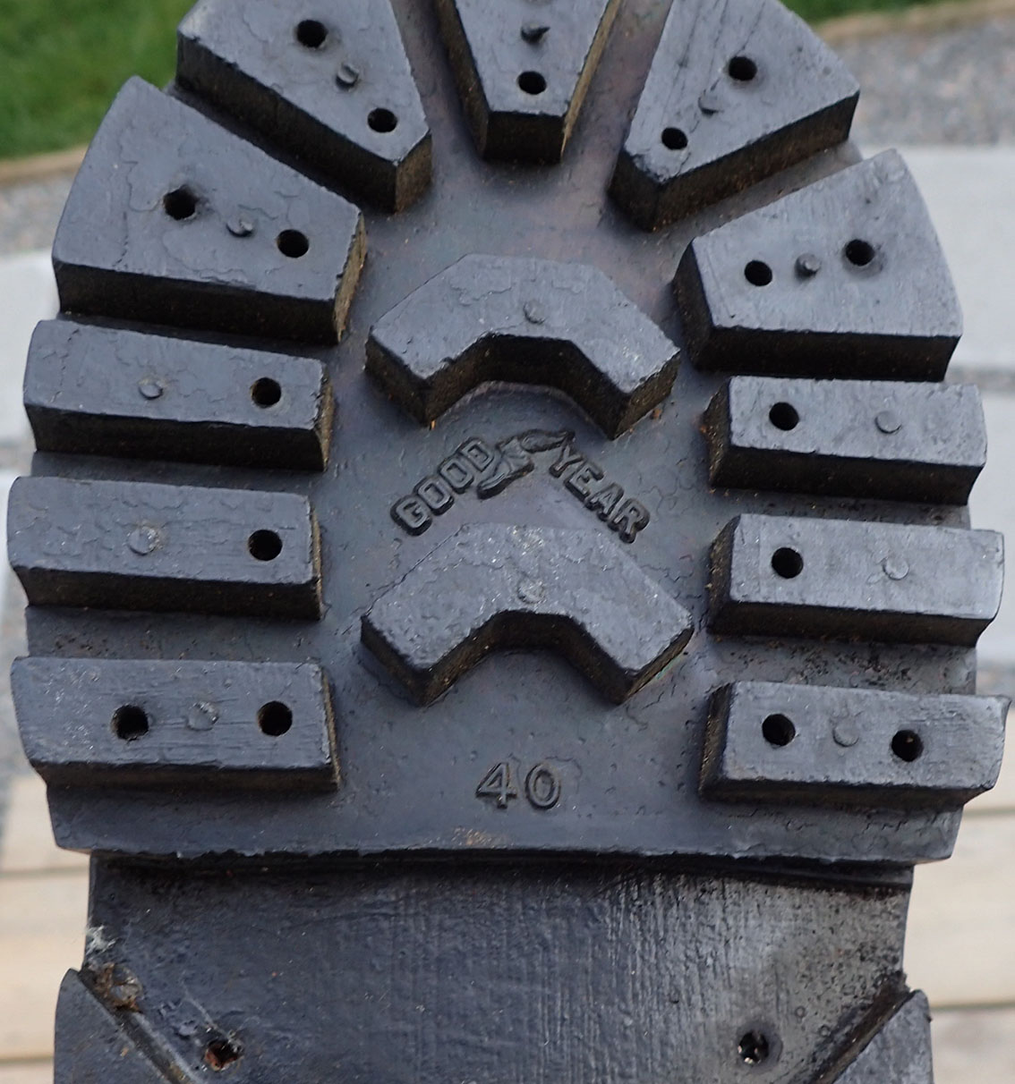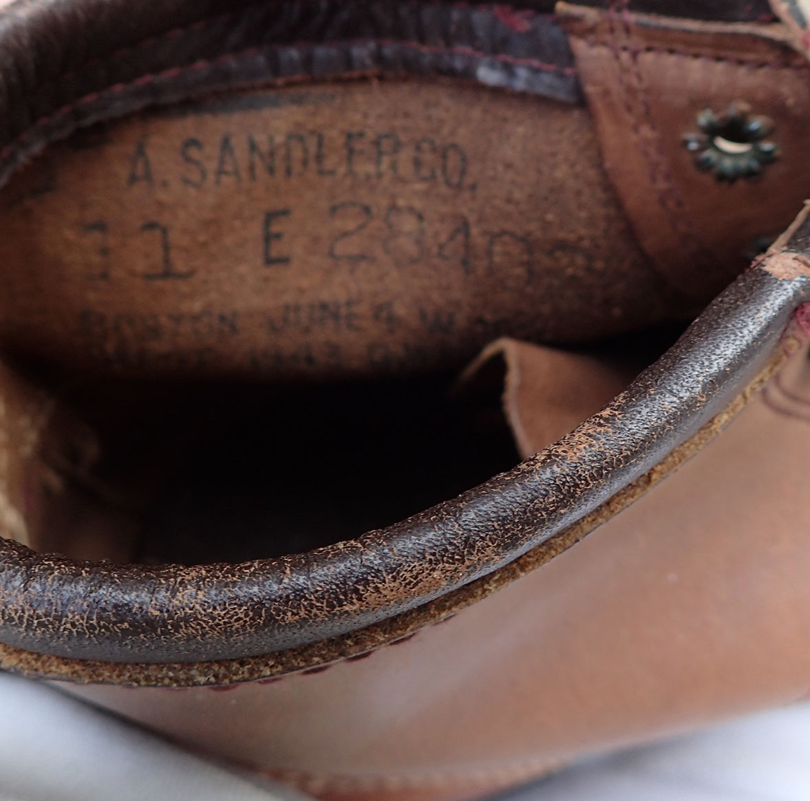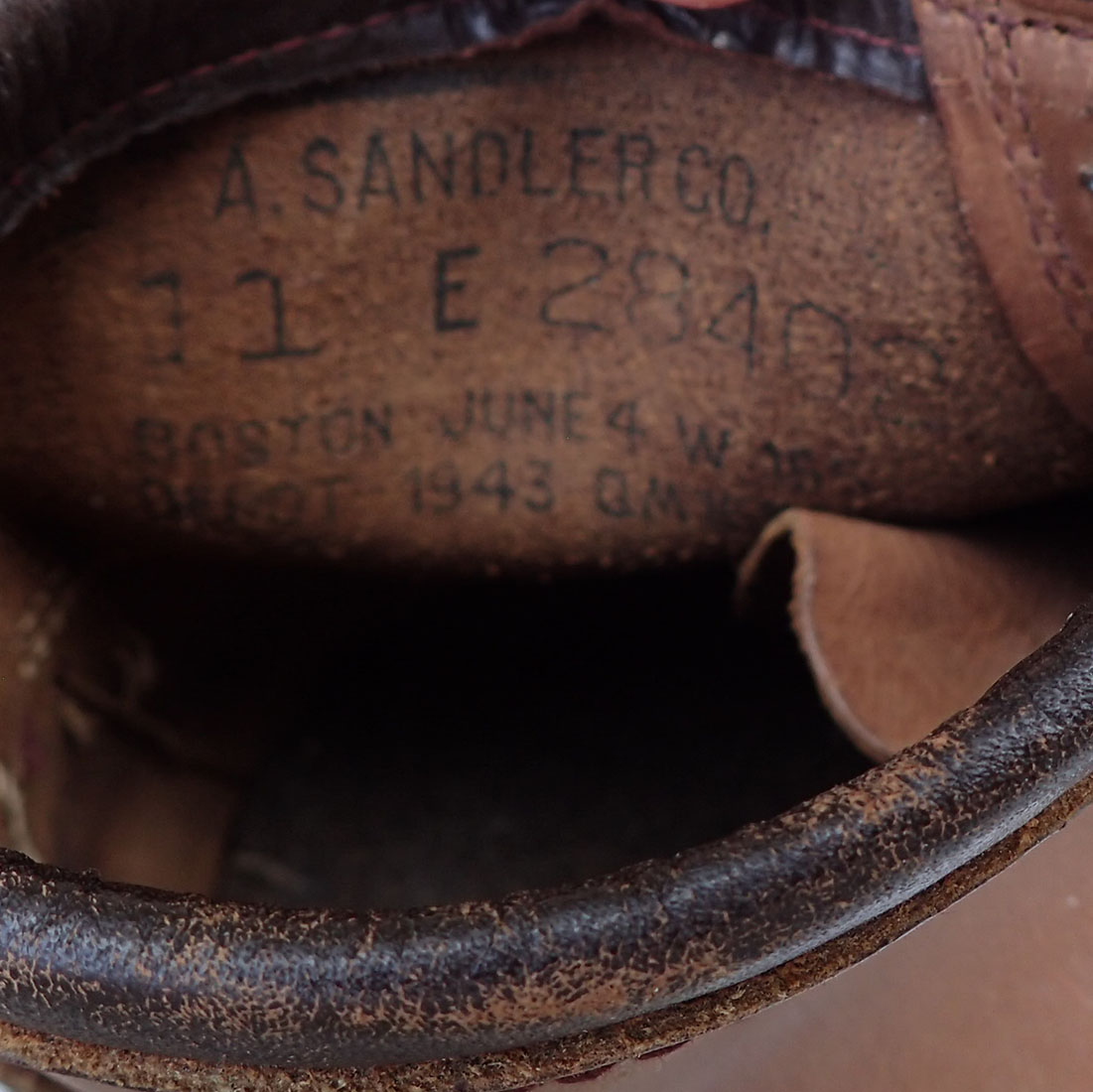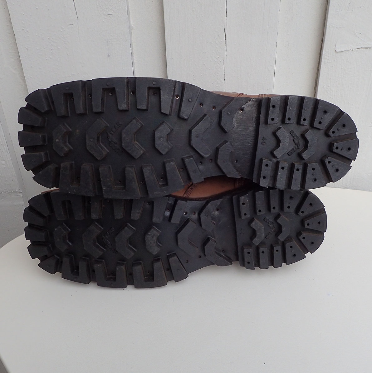 USA. Dropp sko. Sydd i brun tykk glatt lær. Med de originale skolissene. Innvendig med blekkstemplel på begge skoene A. SANDLER CO. JUNE 4 1943 etc. Under påskrudd tykke grove gummisåler merket GOOD YEAR 40 (Norsk størrelse 45). Skoene er i nydelig stand.