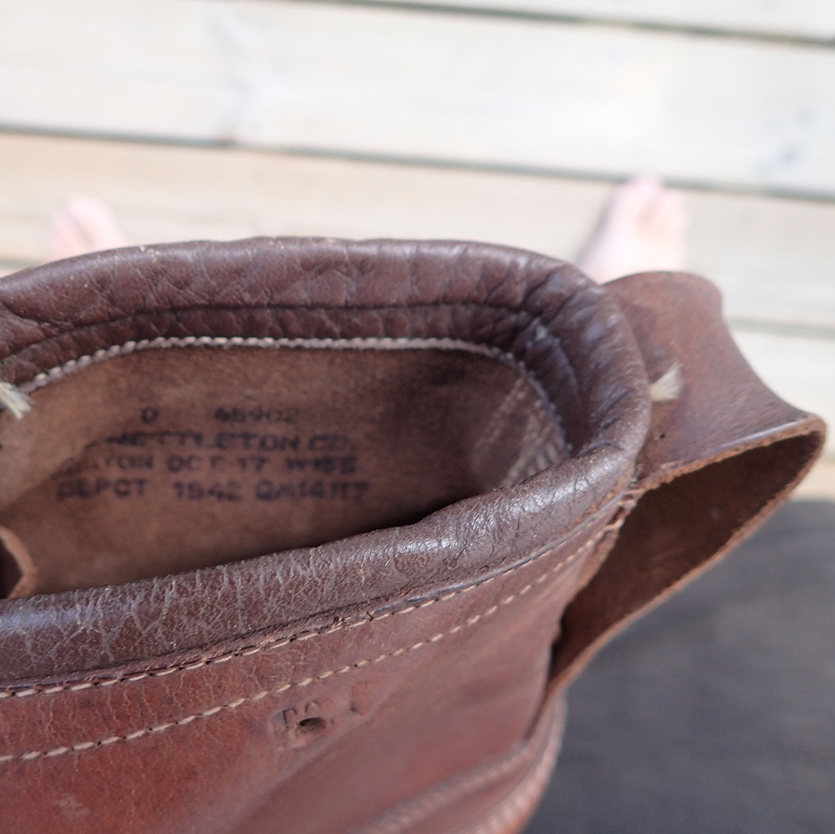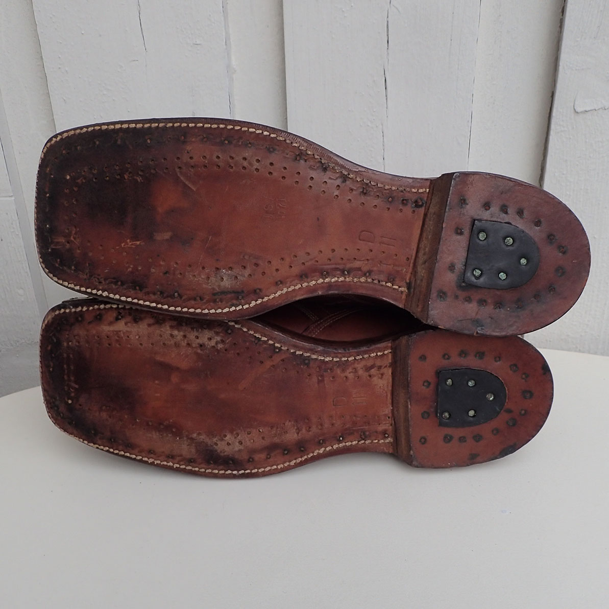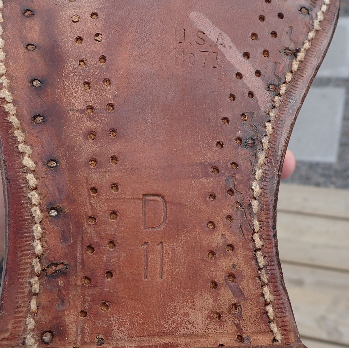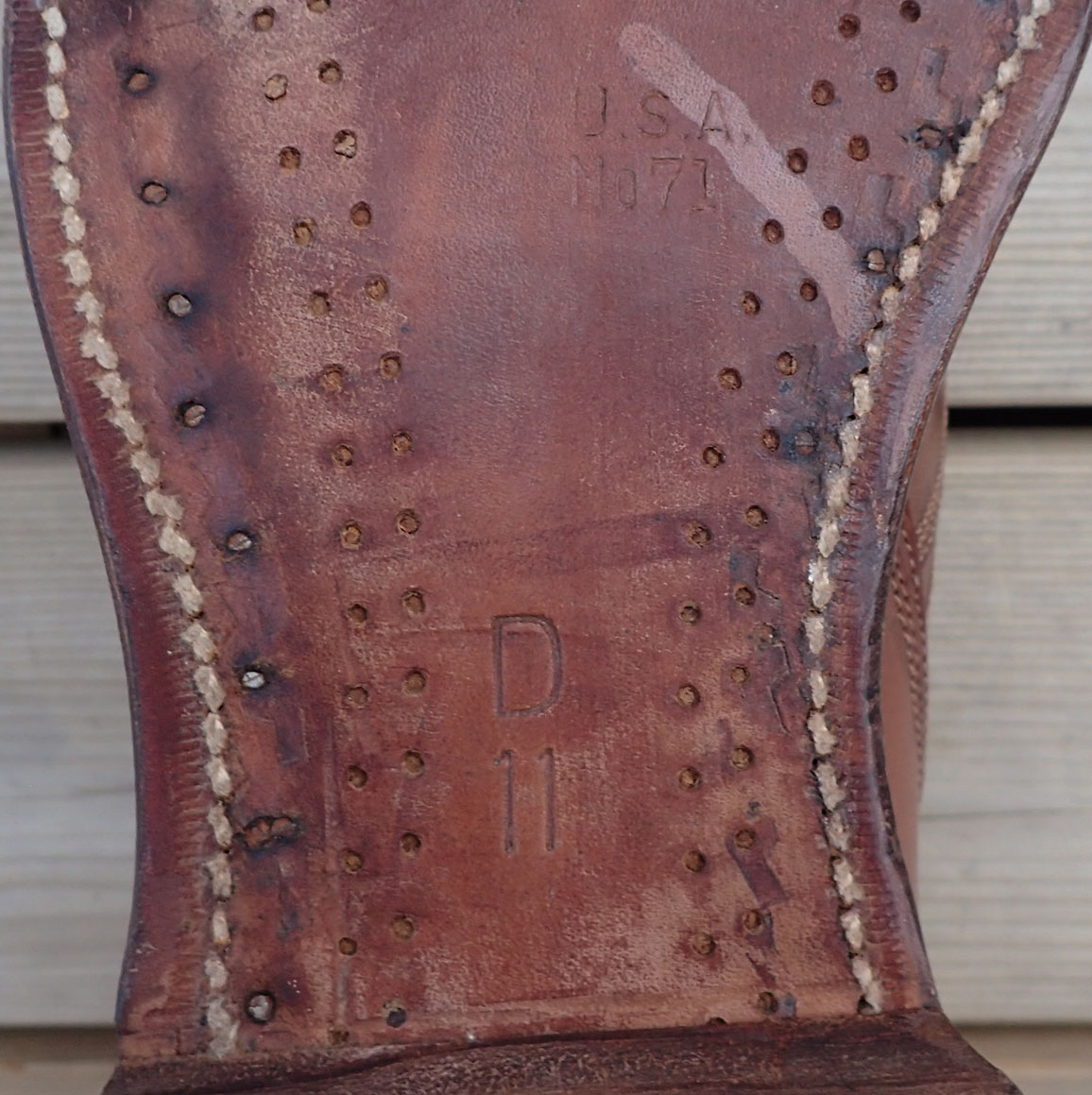 USA. Dropp sko. Sydd i brun tykk glatt lær. Med de originale skolissene. Innvendig med blekkstemplel på begge skoene A.F. NETTLETON CO. OCT. 17 1942 etc. Under stemplet ned i lærsålen U.S.A No.17 D 11 (Norsk størrelse 44,5) og bak på hælen påslått gummi i midten.