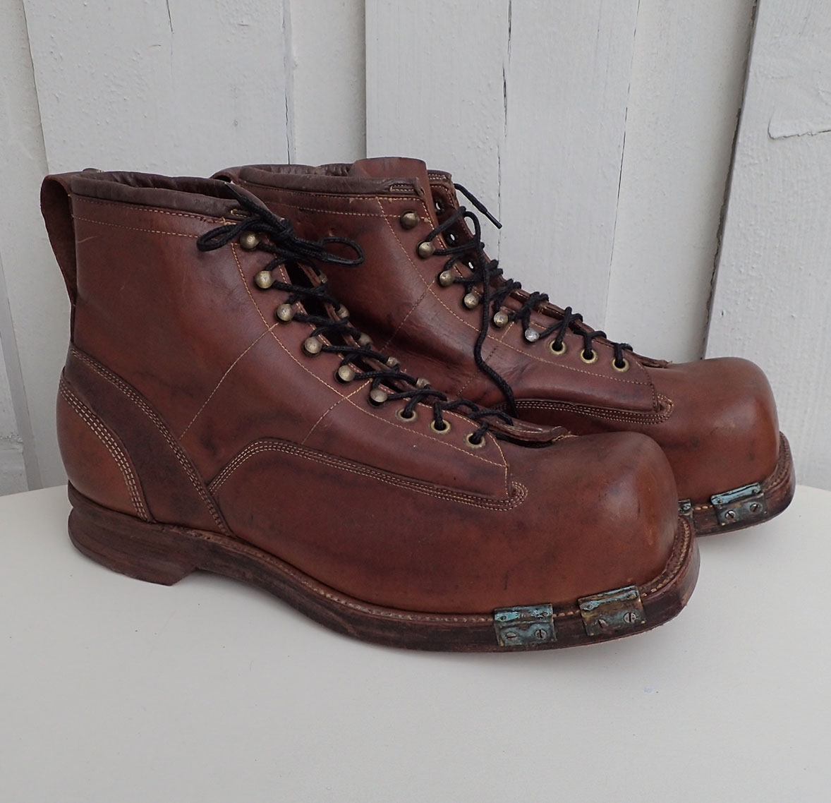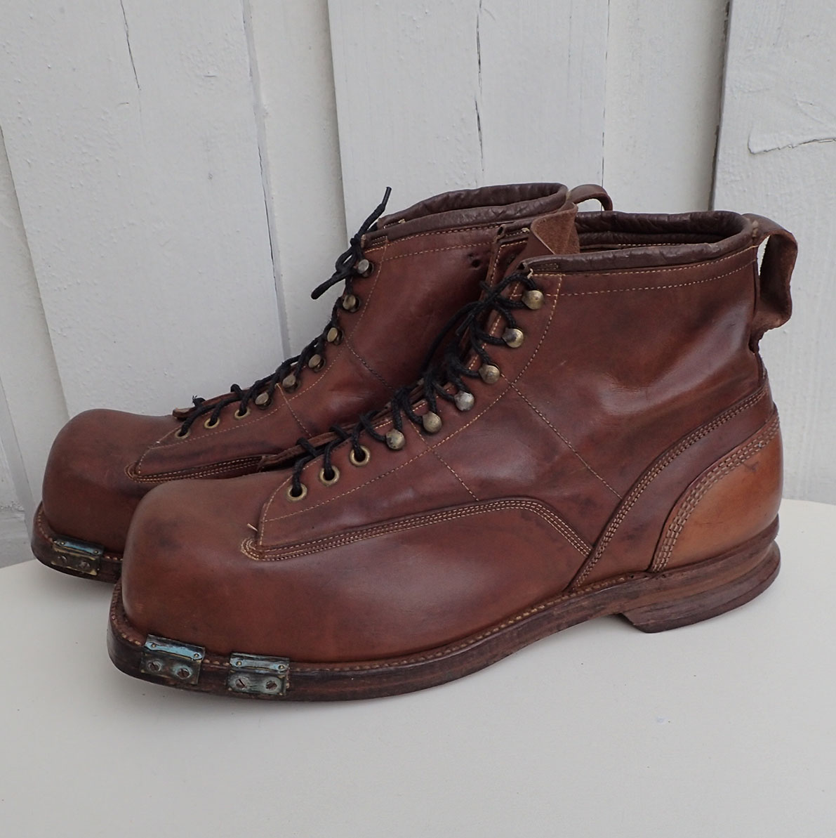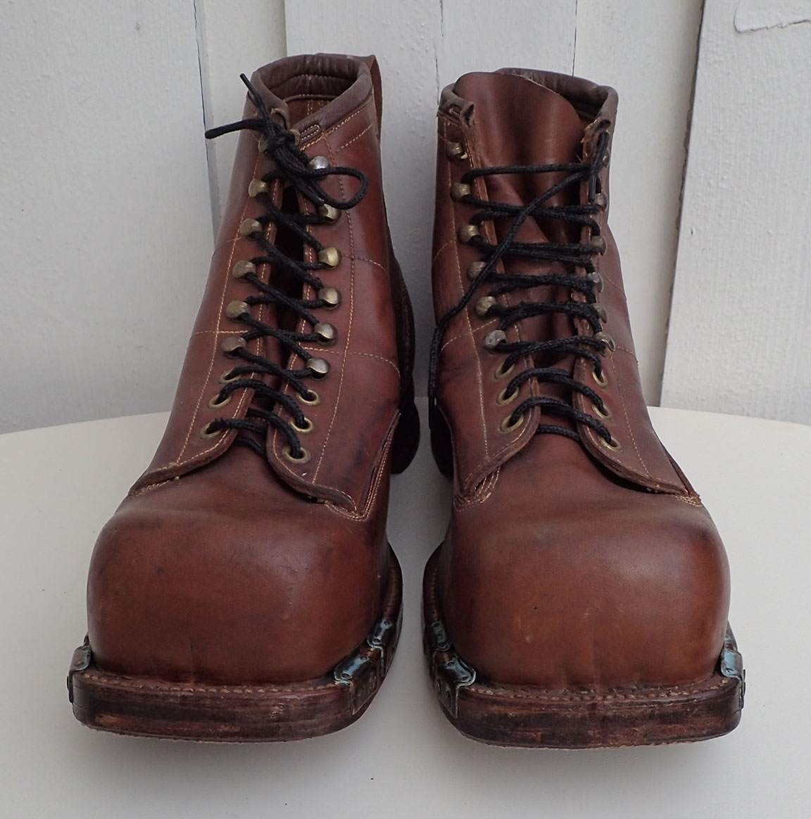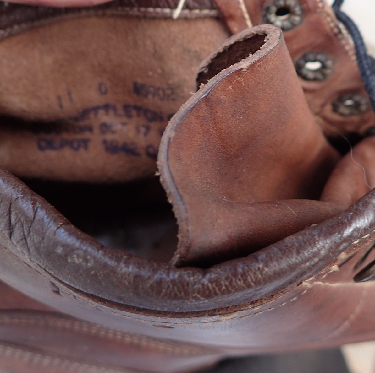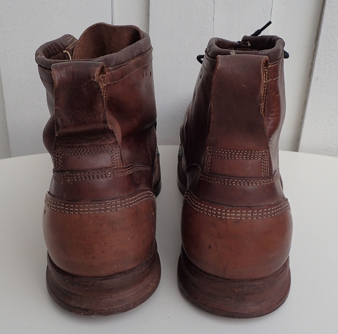 USA. Dropp sko. Sydd i brun tykk glatt lær. Med de originale skolissene. Innvendig med blekkstemplel på begge skoene A.F. NETTLETON CO. OCT. 17 1942 etc. Under stemplet ned i lærsålen U.S.A No.17 D 11 (Norsk størrelse 44,5) og bak på hælen påslått gummi i midten.