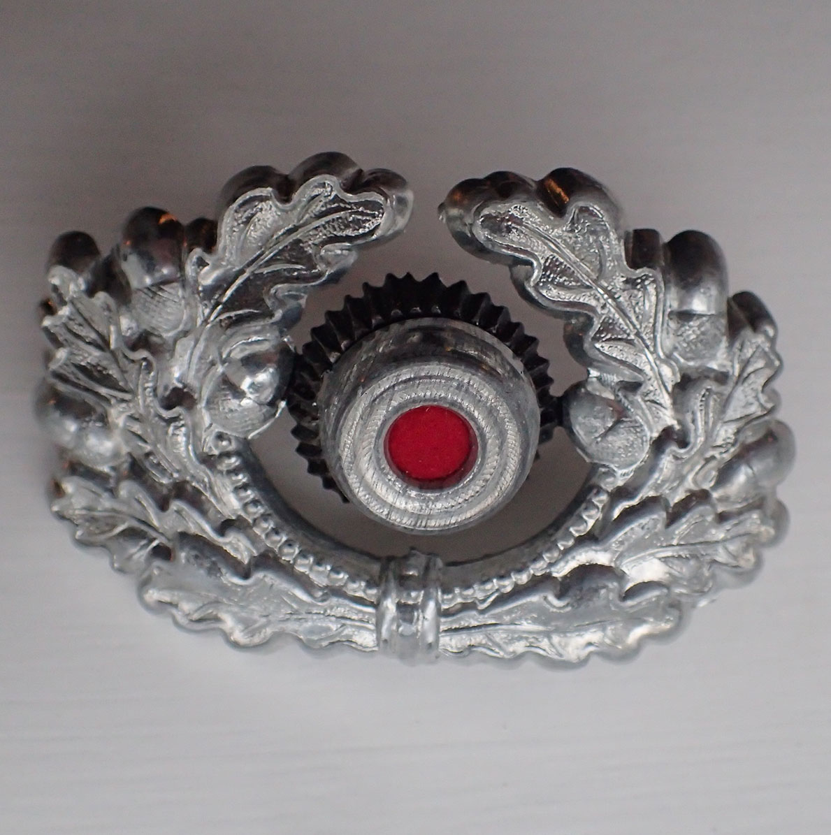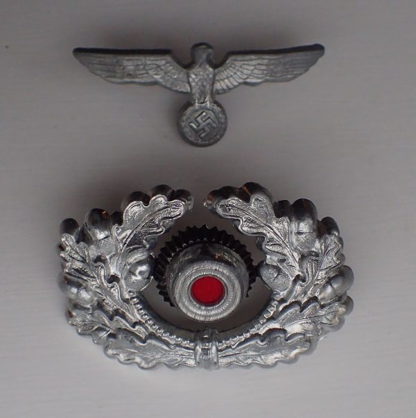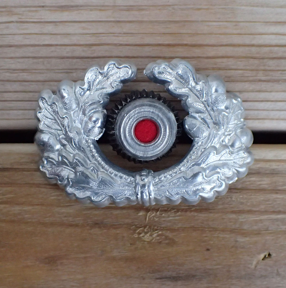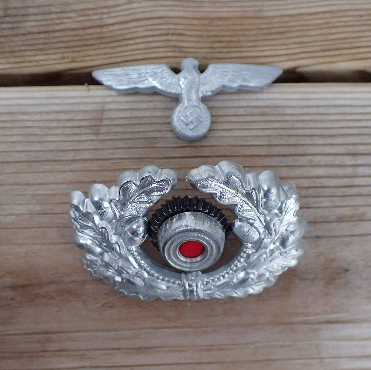 Wehrmacht ekeløvskrans med kokarde + lueørn. Dette er ett matsjende sett. Produsert i feinsink. Lueørnen er komplett med begge messing splintene. I nydelig stand. Ekeløvskransen med kokarde er komplett med begge messing splintene. Bak på kokarden stemplet D.R.G.M. og ett nummer under. I strøken stand.