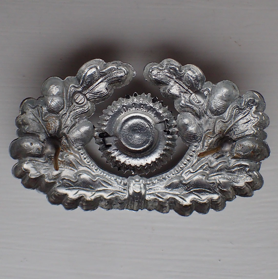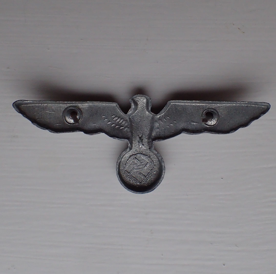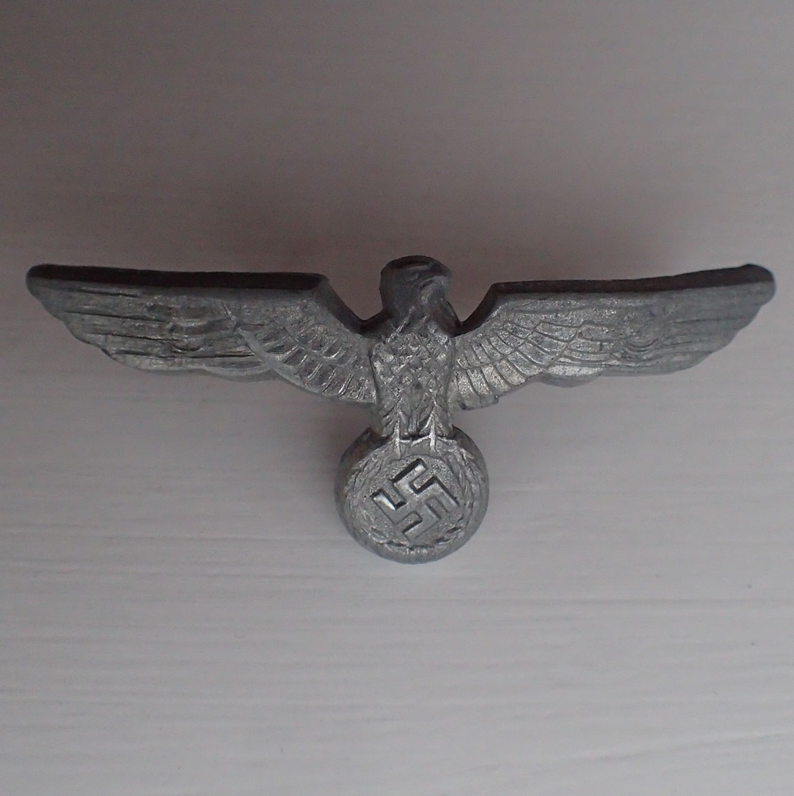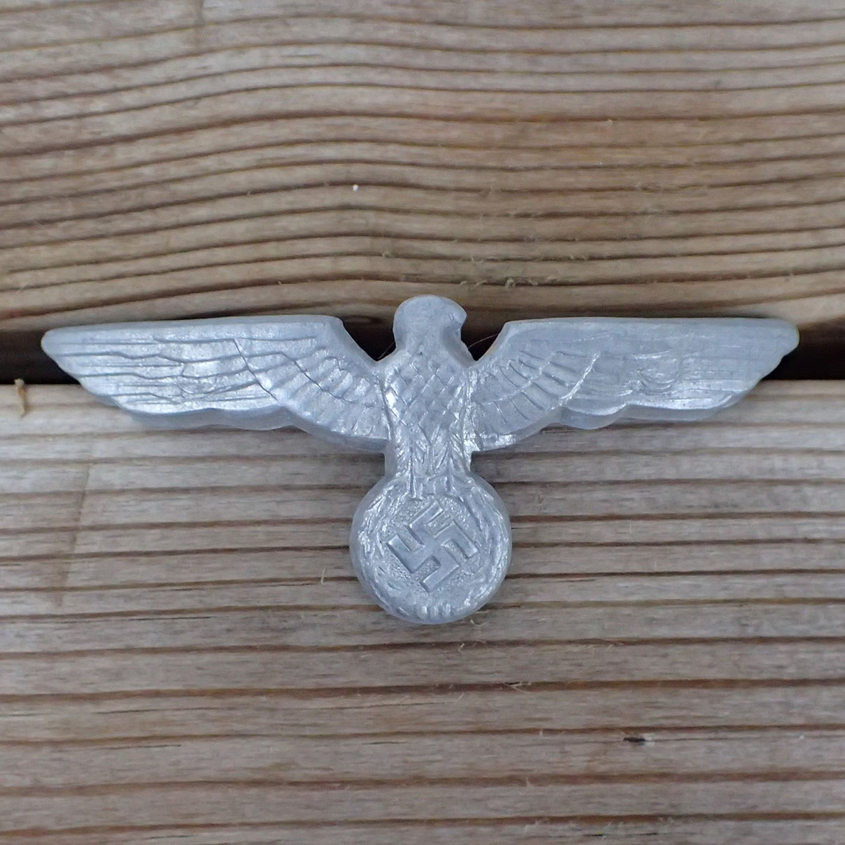 Wehrmacht ekeløvskrans med kokarde + lueørn. Dette er ett matsjende sett. Produsert i feinsink. Lueørnen er komplett med begge messing splintene. I nydelig stand. Ekeløvskransen med kokarde er komplett med begge messing splintene. Bak på kokarden stemplet D.R.G.M. og ett nummer under. I strøken stand.