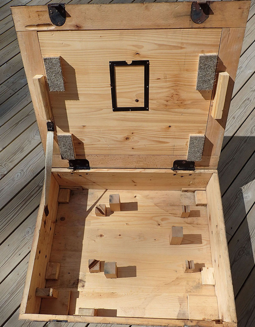 Transportkassen er i tre med bærehåndtak i metall på sidene. Foran med trykk-mekanisme som låser lokket og med beslag i metall på hjørnene. På siden stemplet med Waffen Amt. Innvendig komplett med alle treknotter med filt etc.