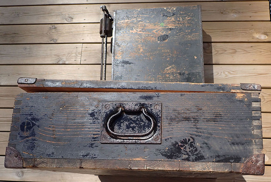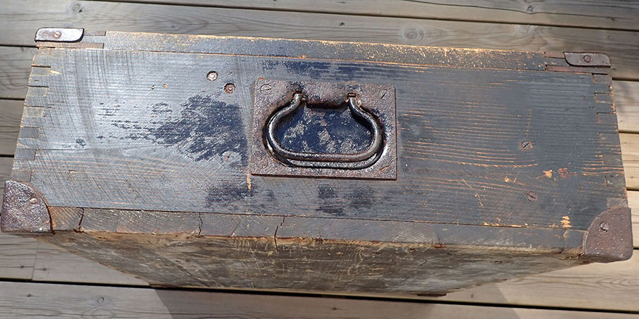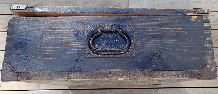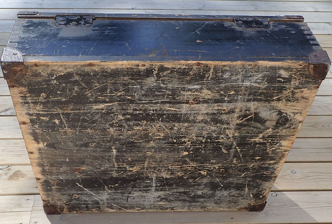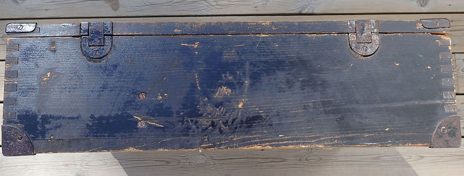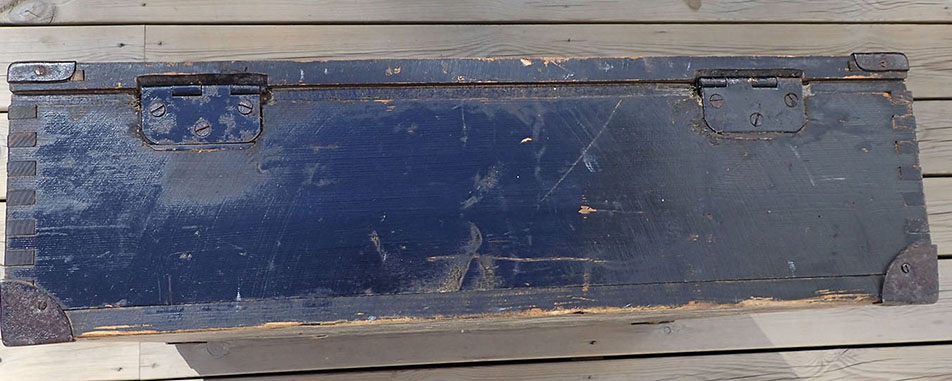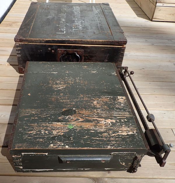 Transportkassen er i meget pen stand med den originale Wehrmacht-grønne malingen og med hvit tekst på lokket.