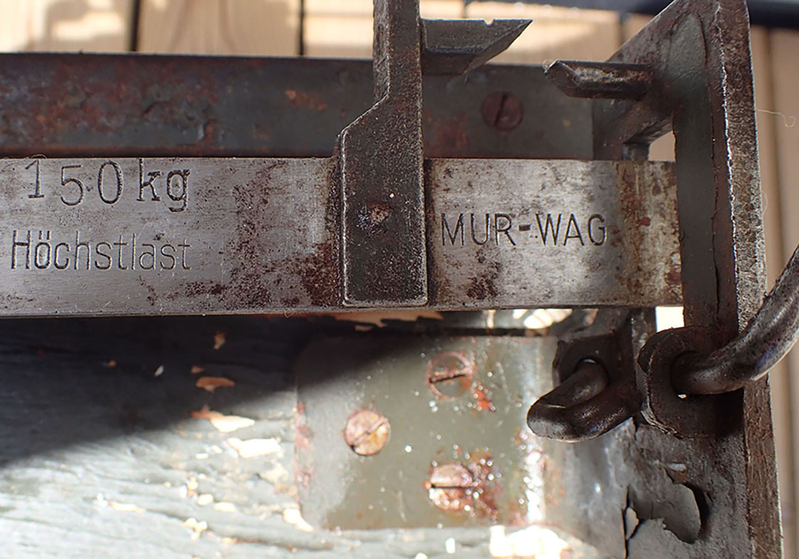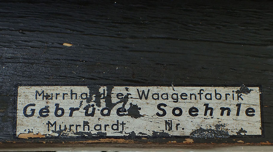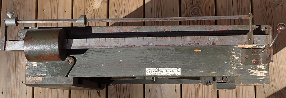 Wehrmacht Laufgewichtswaage. 150 kg Höchstlast. Vekten har veieplate i tre og rammen er i tykk tre med lister i metall. Vekt-armen er inndelt med kilo-tall opp til 150 kilo. Loddet kan flyttes frem og tilbake. Stemplet med ett kontroll stemplet og ved siden av Waffen Amt. Under med kryss-ramme i metall. Foran med dekal fra produsenten Murrhardt Waagenfabrik Gebrüder Soehnle.