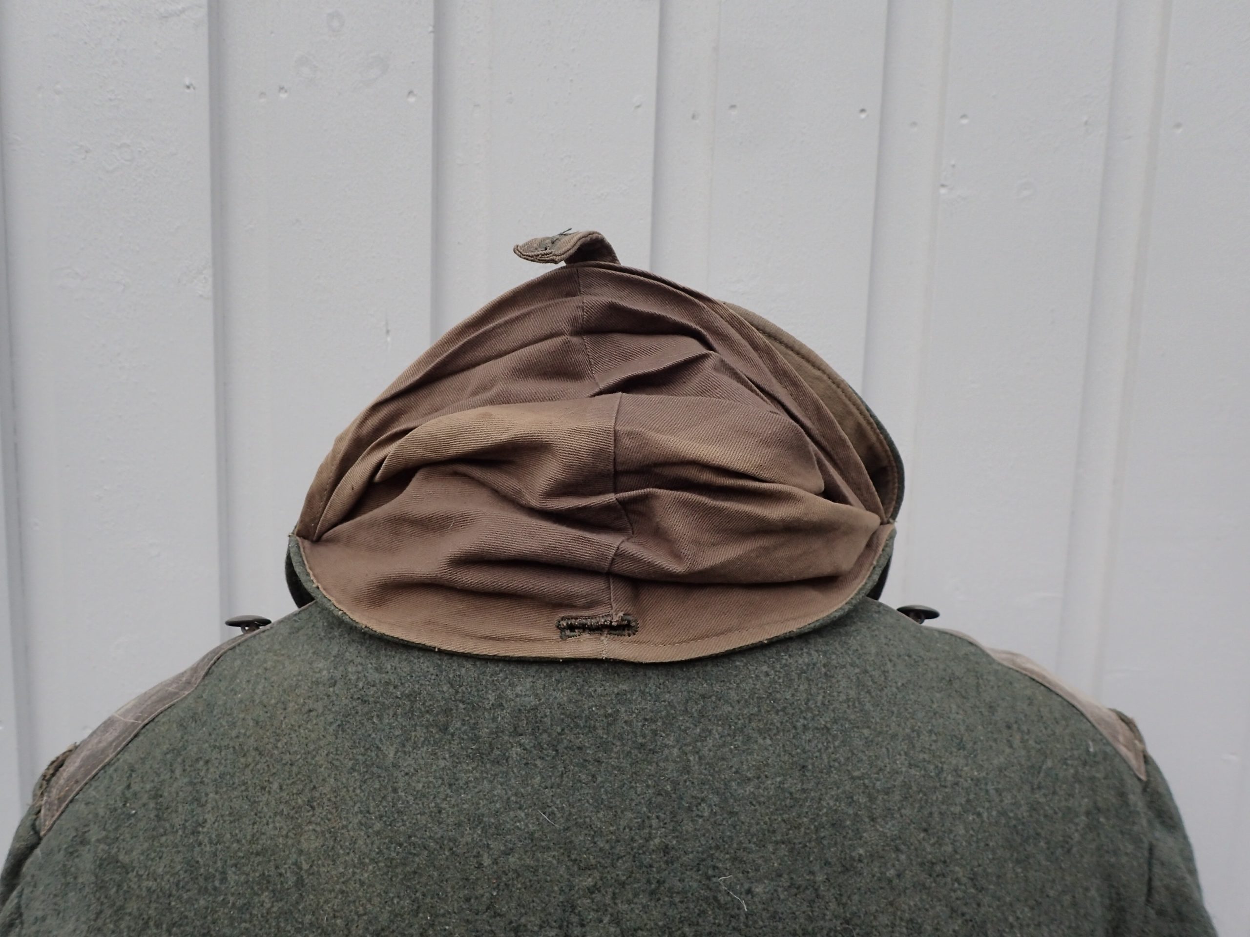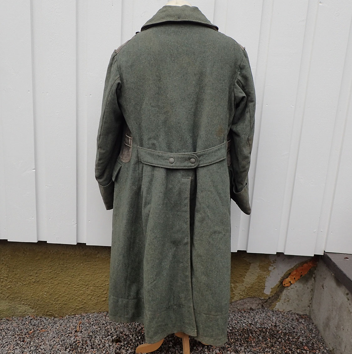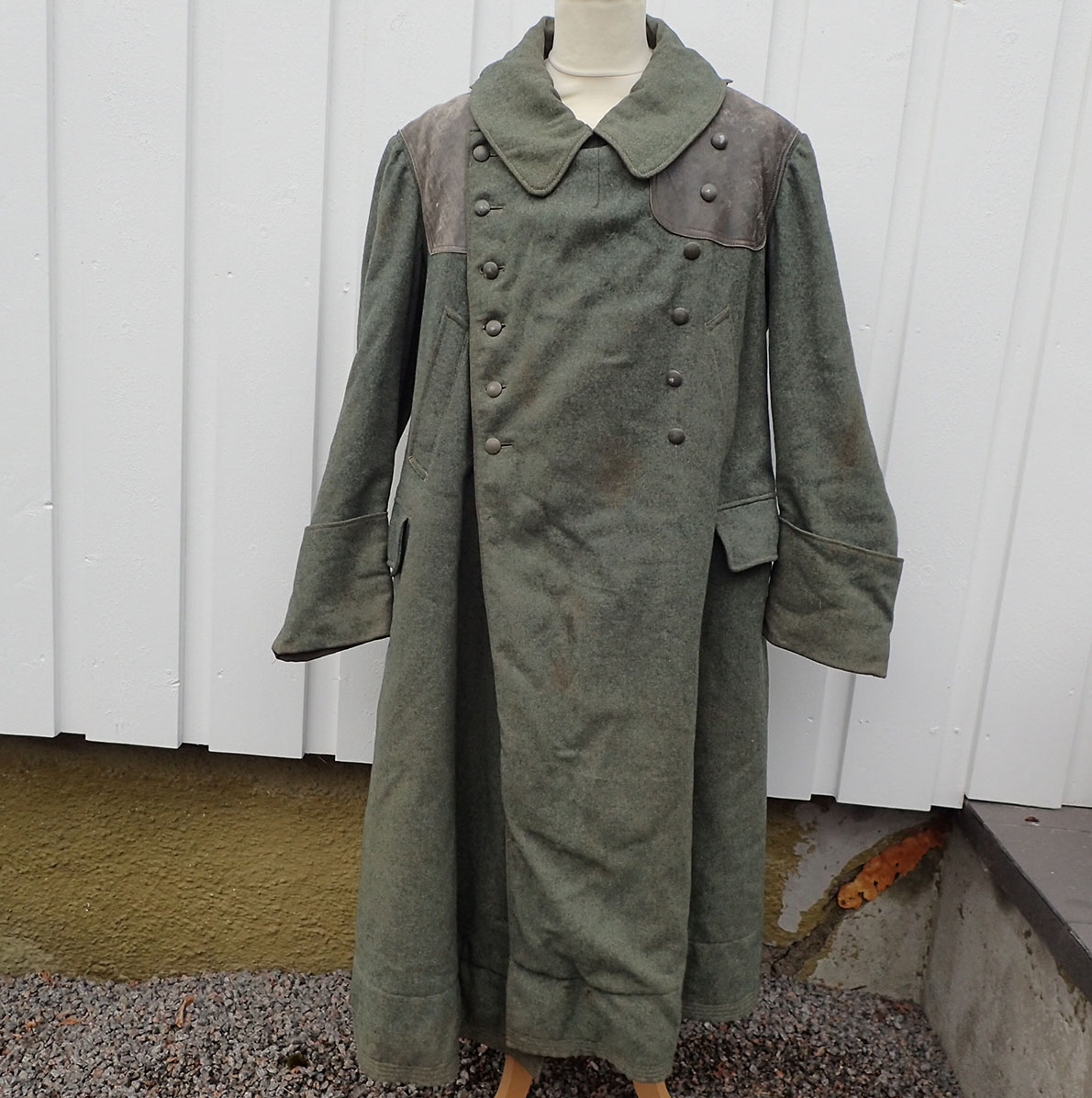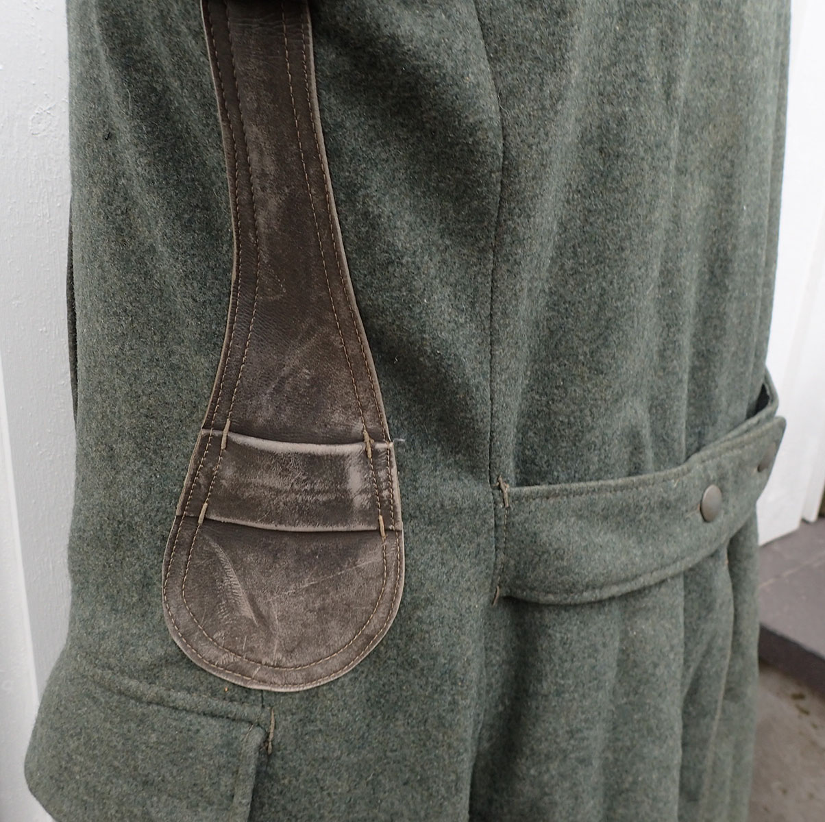 Wehrmacht/SS vaktfrakk. Sydd i grønn uniformsstoff. I fronten 12 grønnlakkerte knapper. Oppå skuldrene knapper og hemper, for å knappe på Wehrmacht eller Waffen-SS skulderklaffer. I halsen hempe i metall, for å knepper igjen halsen. Under kraven tunge og knapper, for å kneppe igjen halsen. Bak i kraven hette i beige bomull. Denne er festet med hempe med knapp. Bak på frakken er det en strammehempe med 2 knapper. Foran er det skråstilt stikklomme og vannrette lommer med lommeflapper. Oppå skuldrene er det tykk grå skinn, hvor mauserreimen skal henges over, slik at mauseren med reimen ikke gnager på skuldrene. Under armene samme grå tykk lær, hvor mauserbajonetten skal festes ned i. Fordi man ikke får brukt ett vanlig belte rundt en slik tykk frakk som denne, så skal mauserbajonetten festes under en av armene. Bak i folden alle de originale små knappene.